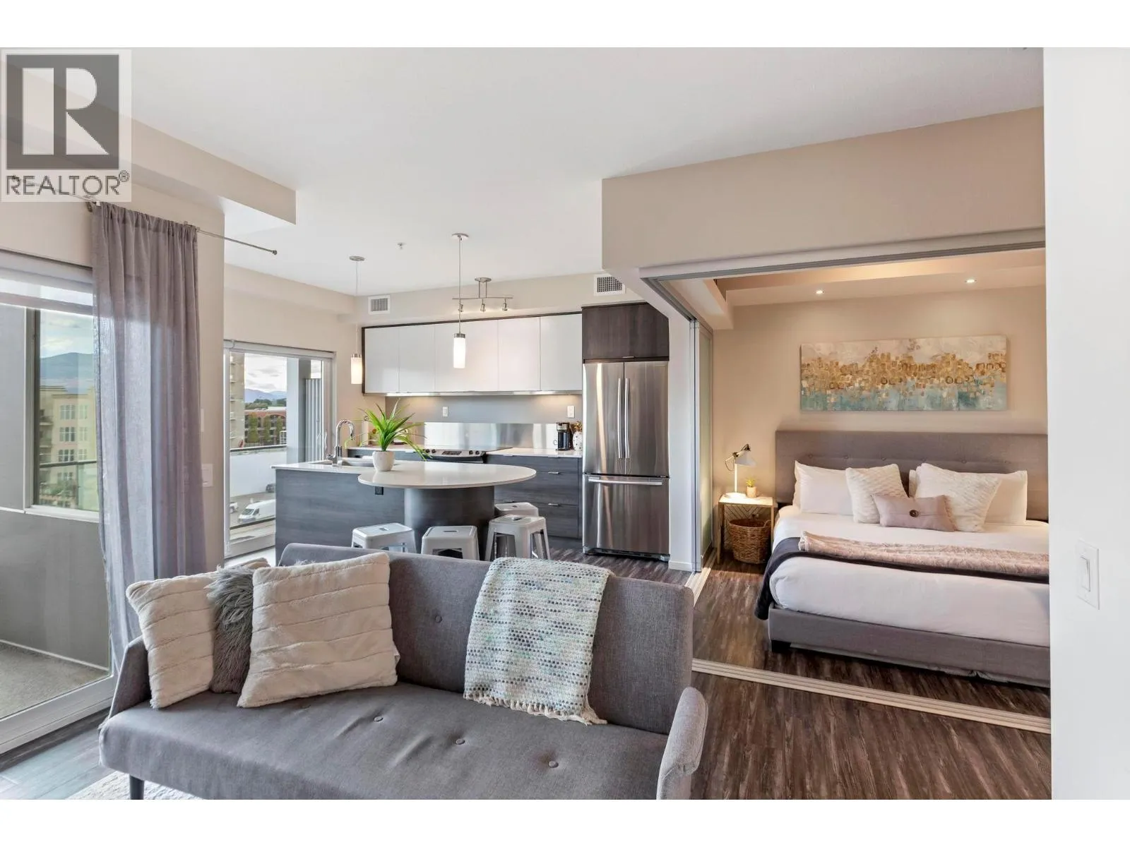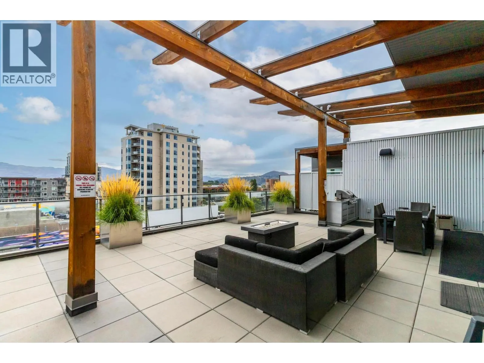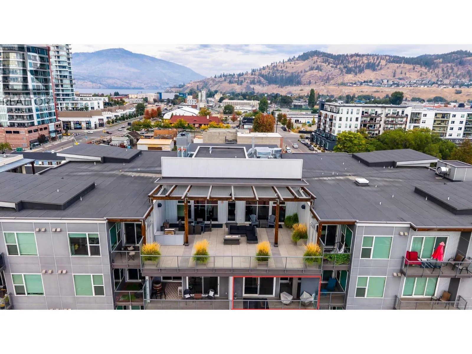 Welcome to Sole, where contemporary design meets the vibrant energy of Kelownaâs Cultural District. This 638 sq ft, 1 bedroom + den suite is filled with natural light, featuring large windows that showcase beautiful city and mountain views, creating a bright and welcoming atmosphere throughout.The open-concept layout highlights quartz countertops, stainless steel appliances, vinyl plank flooring, and a spa-inspired bathroom with double sinks and a glass shower. The bedroom wall can be closed for added privacy, while the den offers flexibility for a home office or guest space. The living area features a modern wall-mounted electric fireplace, adding warmth and ambiance, and the home comes equipped with central heating and cooling for year-round comfort. Step onto your covered patio to enjoy the viewâthe perfect spot for morning coffee or evening wine.Youâll appreciate the convenience of in-suite laundry, one secure underground parking stall, and one storage locker. Residents enjoy premium amenities including a rooftop patio with BBQs and fire tables, plus a fitness studio. Built by Edgecombe Construction, recipient of the 2016 GOLD Tommie Award for Home Builder of the Year, Sole is pet-friendly and ideally located just minutes from the beach, restaurants, shops, and the upcoming UBCO campus. Whether youâre seeking a modern downtown home or a great investment property, this bright, move-in-ready condo offers style, comfort, and unbeatable walkability in the heart of Kelowna. (id:27476)