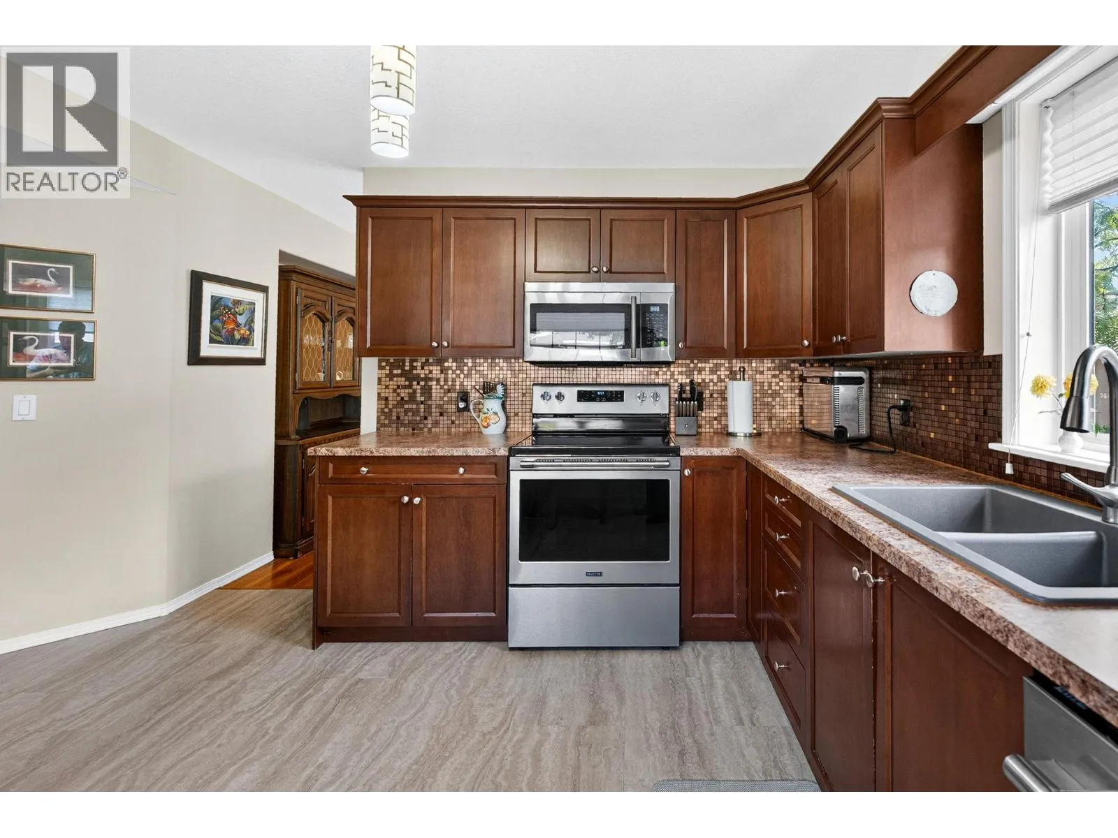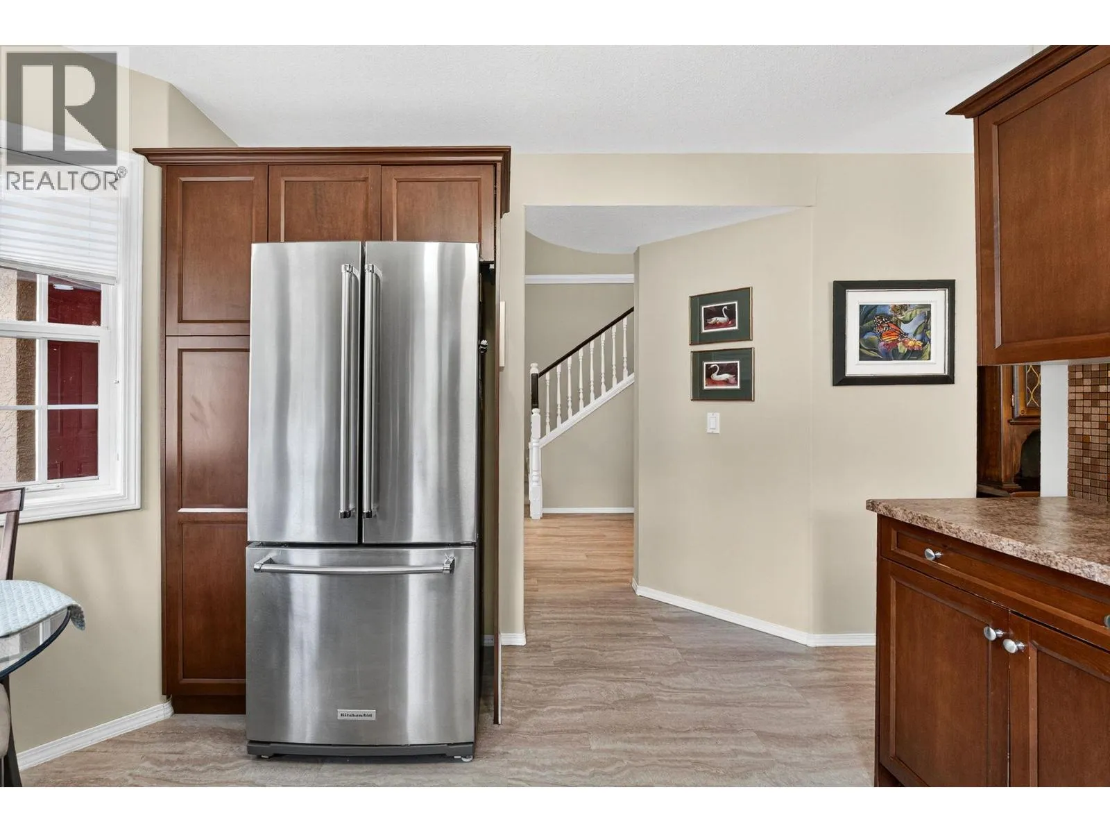 This nicely updated townhome is in one of the best locations in the complex, backing onto a park! It features three bedrooms and two and a half bathrooms, with the primary bedroom on the main floor. Step inside to a bright and inviting eat-in kitchen with stainless steel appliances, a composite sink, and ample cabinet space. Thereâs also a separate formal dining room and living room, perfect for enjoying the gas fireplace. Conveniently located on the main floor is a laundry room and a two pce bath. Upstairs, there are two additional bedrooms and a four pce bathroom. A bonus loft area upstairs can be used as a kidsâ play area, an office, or an alternate TV room. Access to the backyard patio provides a peaceful retreat, with no neighbours behind you. Fencing panels on either side of the patio add privacy while allowing you to enjoy the park views. This great location in North Glenmore is close to schools, shopping, golf, restaurants, and so much more. Don't miss this great opportunity to live in one of the most desirable neighbourhoods in Kelowna! Pet Restrictions: No more than 2 dogs (or) No more than 2 cats (or) No more than 1 dog and 1 cat (id:27476)