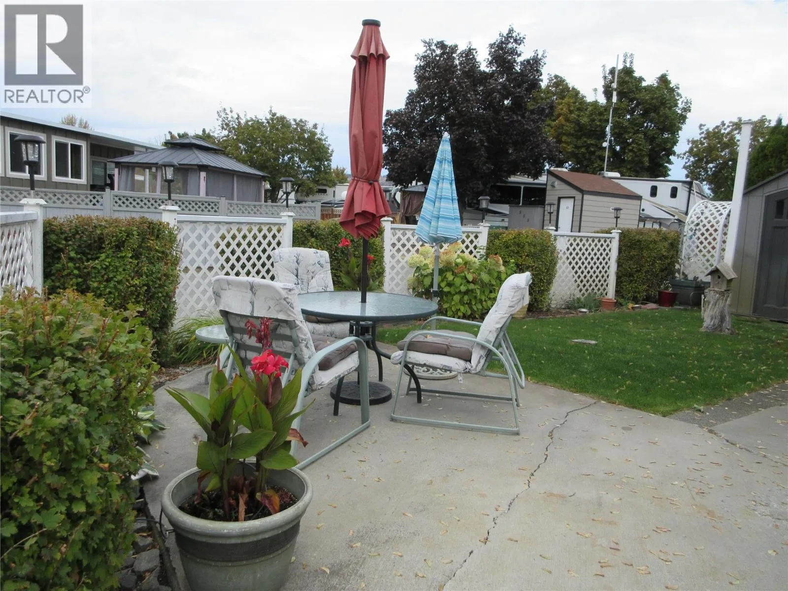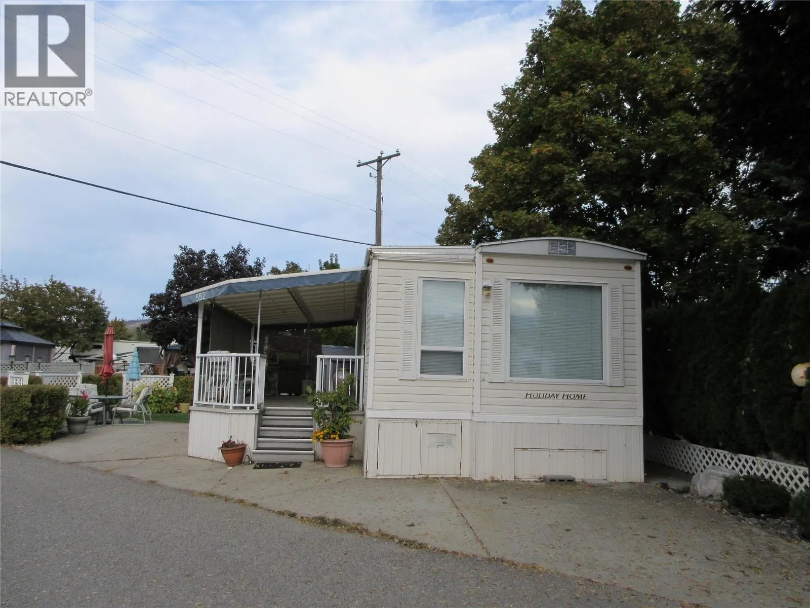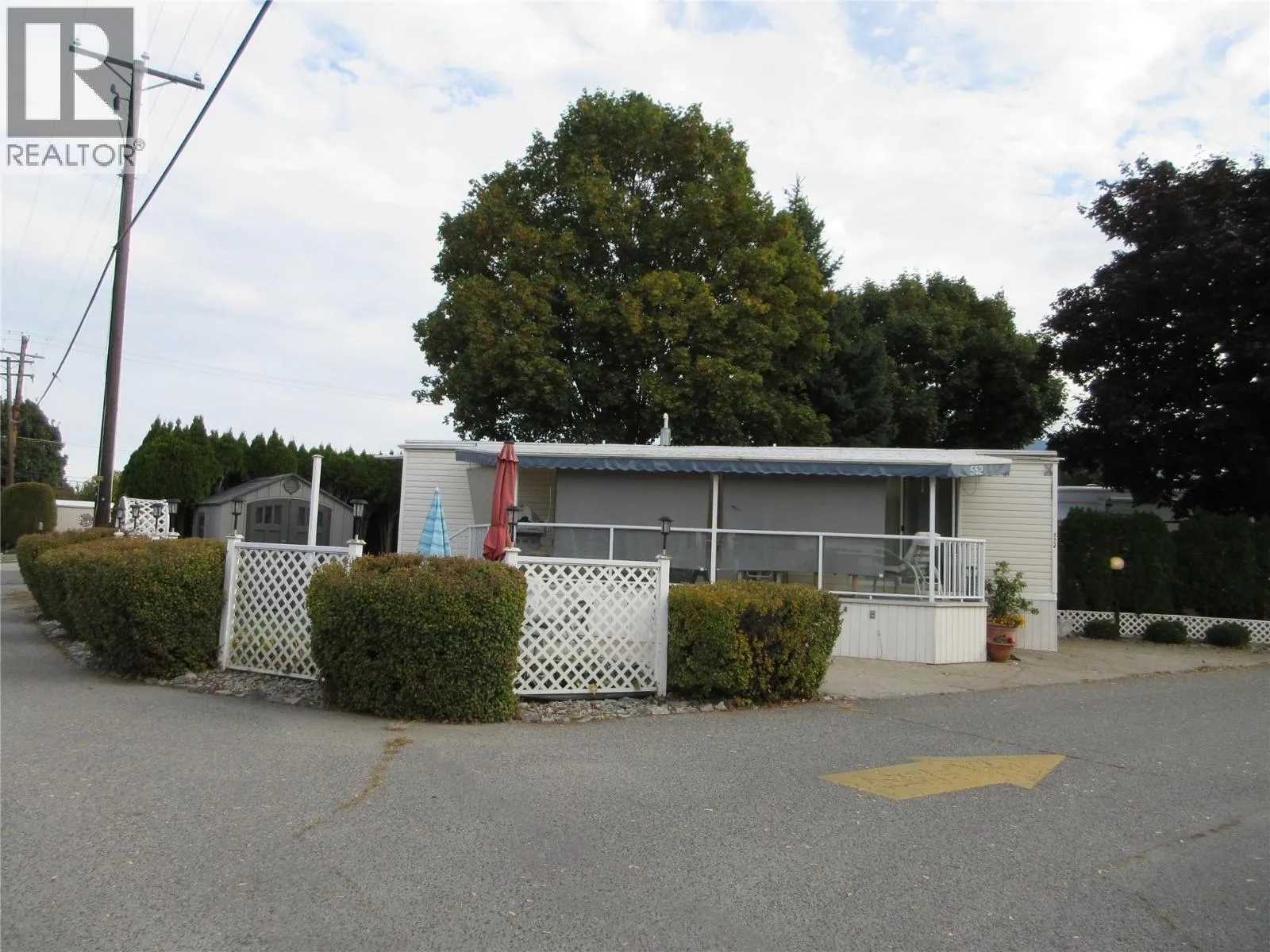 Immaculate Park Model situated on a corner site in the gated community of Holiday Park Resort. This lovely one bedroom, one bathroom is steps away from the off leash, fenced in dog park. Large covered deck to sit and relax or entertain your family and friends. The side yard features a patio area that is ideal for hosting happy hour. Numerous upgrades include dishwasher, AC unit, flooring, water softener and reverse osmosis system. There is underground irrigation for the lawn and plants. A few minutes away is Woodlands Adult Rec Centre where you will find the pickleball court, coin laundry, games room, library, billiards, conversation pool and hot tub. Lease term to 2035 with the option to extend to 2046 for an additional cost. The leasehold interest is registered with the Federal Government. The park Model ownership is transferred by bill of sale. There is no Property Transfer Tax. Long and short term rentals allowed. Enjoy all the amenities offered by Holiday Park - pools, hot tubs, golf course, shuffleboard, restaurant, dinners and and dances, plus more. Close to the Rail Trail, Kelowna International Airport, wineries, golf courses, shopping and entertainment. (id:27476)
