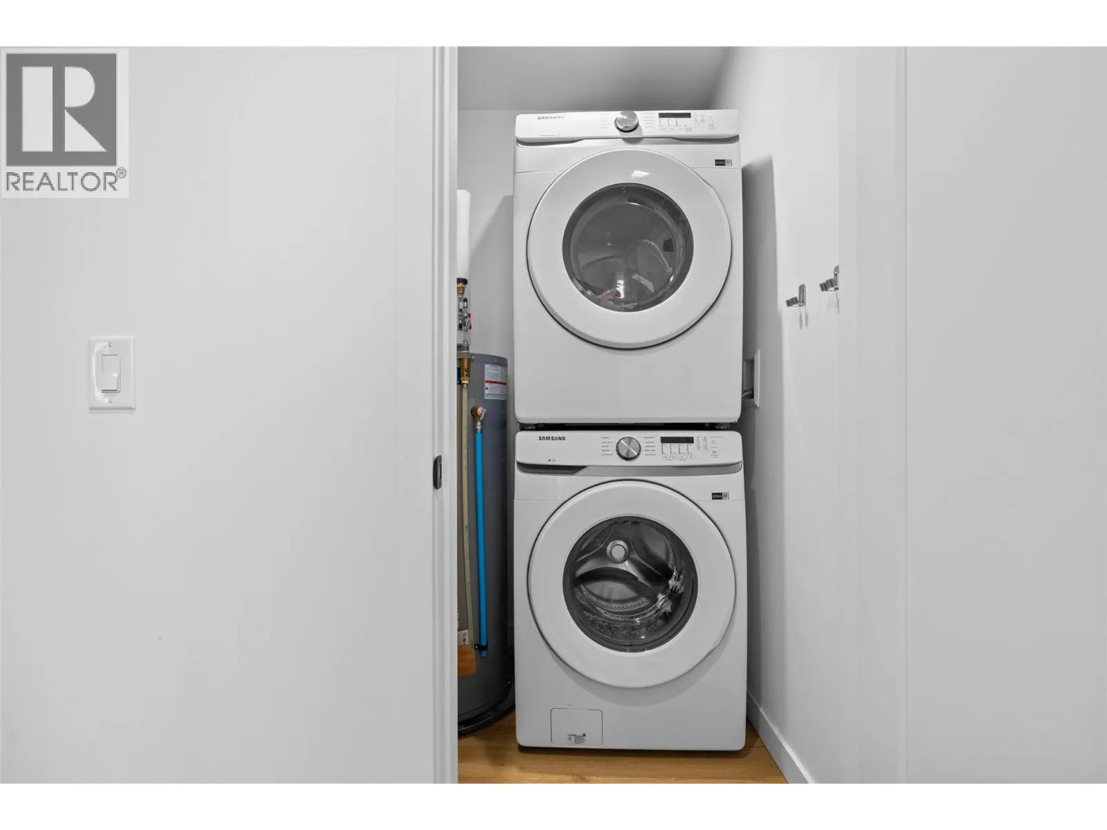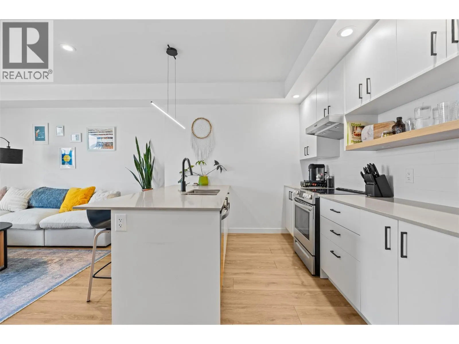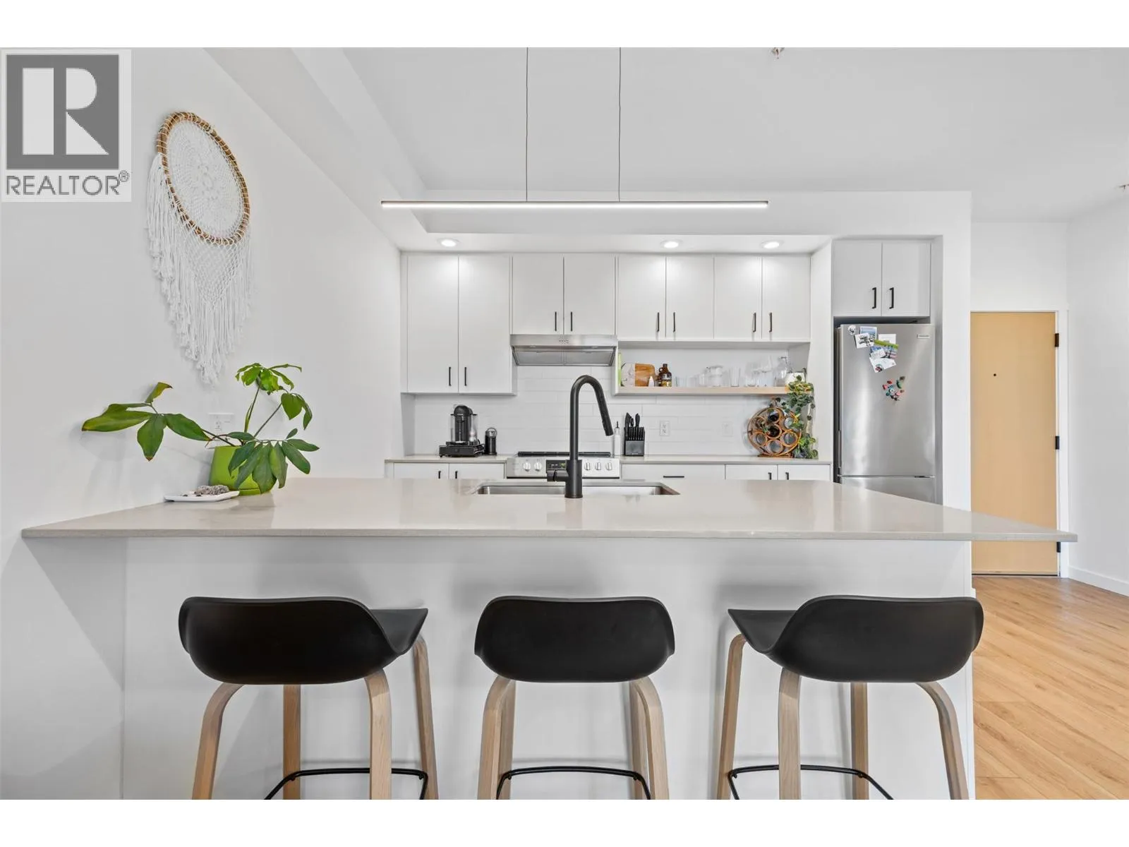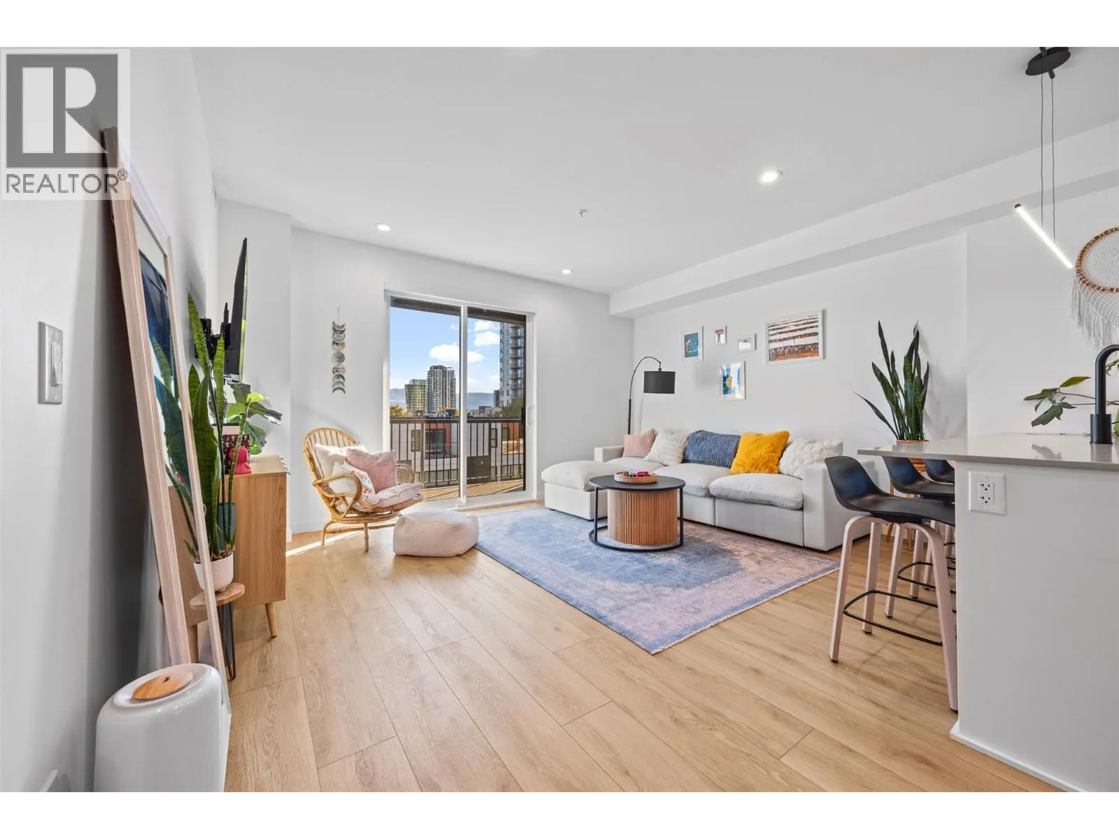 Modern Downtown Living with Views, Parking, and Smart Home Comfort. Welcome to Unit 405 at 660 Cawston Avenue, a bright and contemporary 1-bedroom, 1-bath condo offering 655 sq. ft. of stylish interior space and a 113 sq. ft. south-facing balcony with sweeping mountain views. Built in 2022, this 4th-floor home blends modern design with quality finishes throughout - from quartz countertops and hardwood-style flooring to stainless steel appliances and 9-foot ceilings that enhance the open, airy feel. The sleek kitchen features a large island that flows effortlessly into the living area - perfect for entertaining or unwinding at the end of the day. Enjoy year-round comfort with smart home climate control and in-suite laundry for everyday convenience. Included are secure underground parking, a private storage locker, and access to visitor parking for guests. Ideally located in the heart of downtown Kelowna, youâre just steps from the waterfront, Knox Mountain, cafés, restaurants, and the vibrant cultural district. Whether youâre a homeowner looking for a low-maintenance urban lifestyle or an investor seeking a desirable rental property, this home delivers the best of modern downtown living. (id:27476)