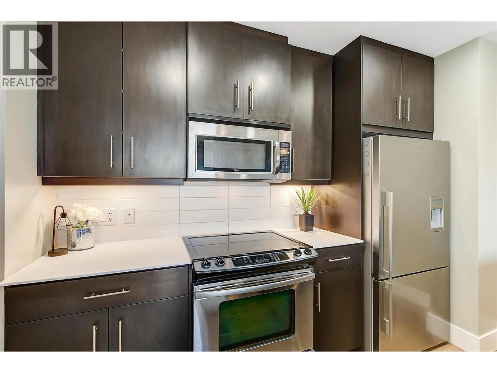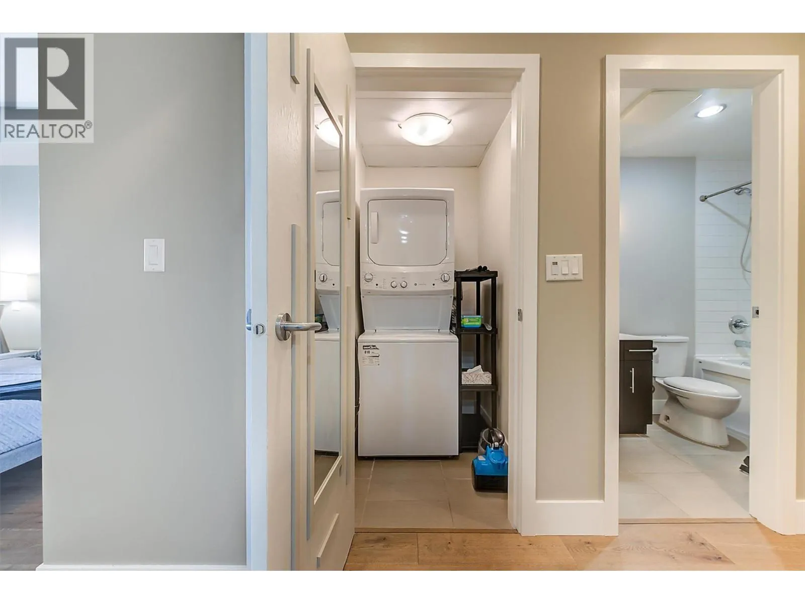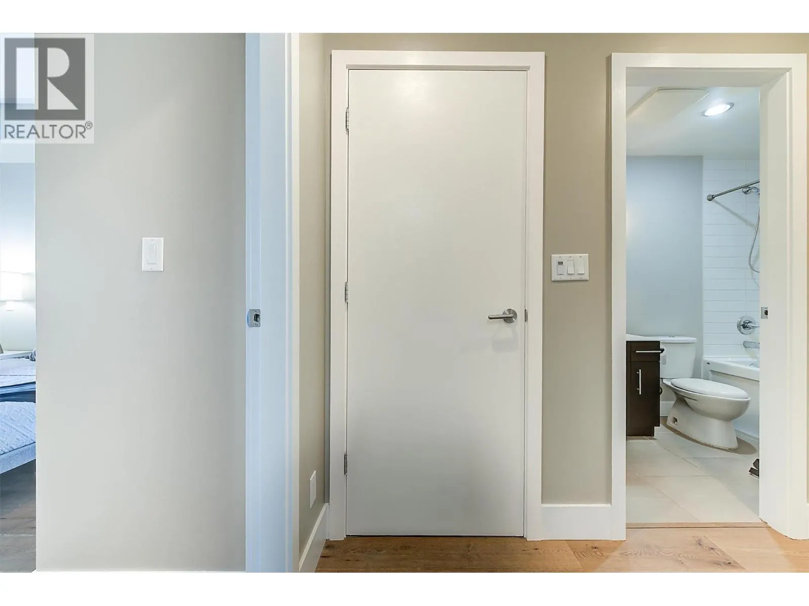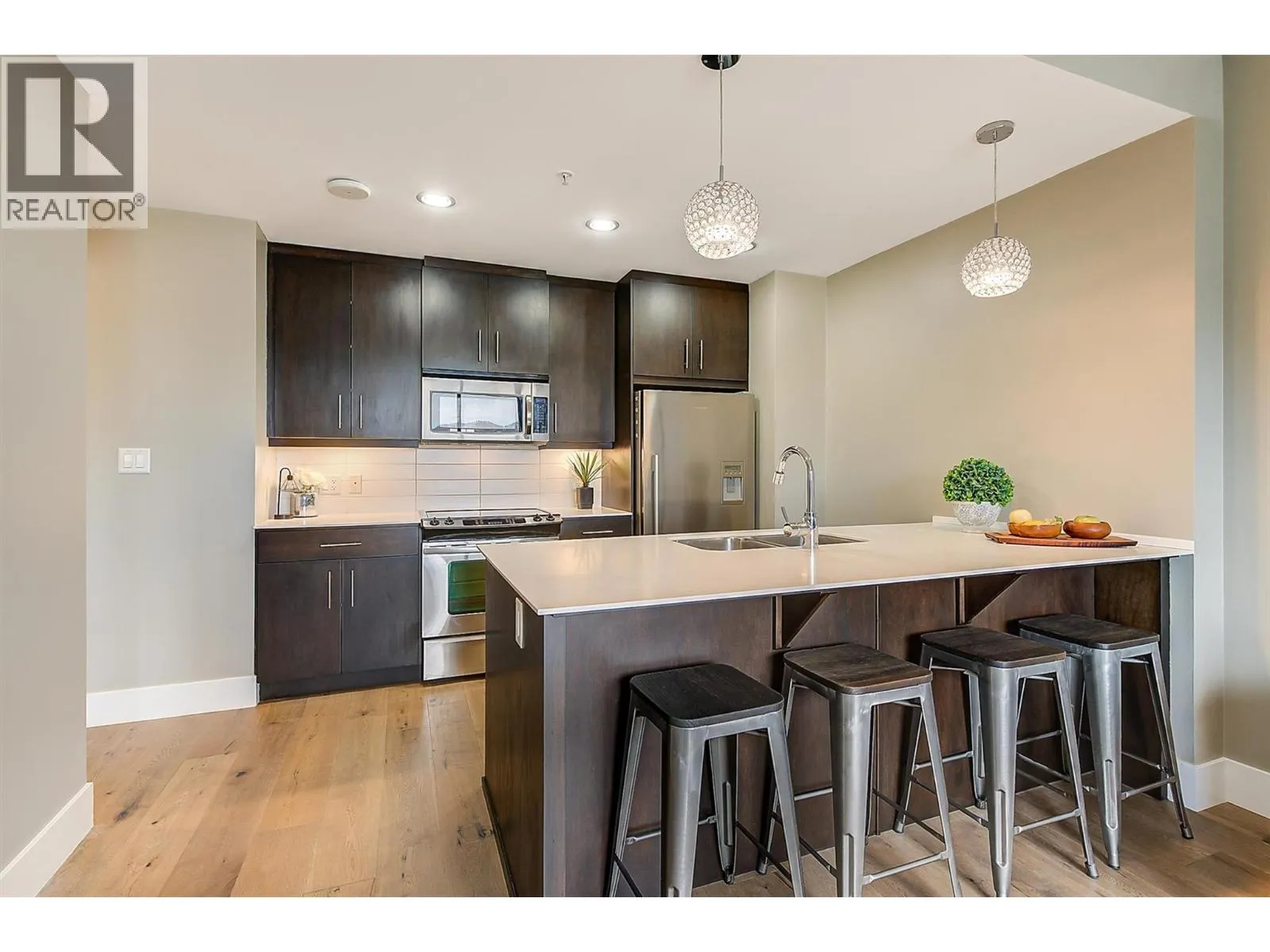 Invue, a stunning high-rise concrete building situated in the heart of Kelowna, featuring an impressive lobby and unparalleled amenities. This exceptional 1-bedroom condo has forced air heating/cooling and has been freshly painted with new hardwood flooring, vacant and ready to move in. The spacious bedroom w/double closets. well designed kitchen offers quartz countertops, stainless steel appliances and eating bar overlooking the living area with 2 accesses to the 'L' shaped sundeck. Invue stands out as one of the few affordable luxury complexes in Kelowna, featuring top-tier amenities. The expansive rooftop patio (on 15th fl) offers various seating areas with breathtaking 360-degree views of the lake, city and valley. The rooftop also features a pool & hot tub w/ladies & mens change rooms. On the second floor, you'll find a spacious fully-equipped gym with men & women changing rooms complete w/steam showers and saunas. Thereâs also a games area with a ping pong table, a gathering room with a billiard table, and a cozy lounge area. The building is also equipped with convenient features such as a car wash in the parkade and a dog wash station on the second floor, along with 2 guest suites for visitors. Invue is centrally located, providing easy access to downtown and nearby shopping centers. The unit comes with underground parking (#31) and a storage unit (# 59) located in the parkade. Pets are welcome. Remarkably low strata fees considering the luxurious amenities offered. (id:27476)