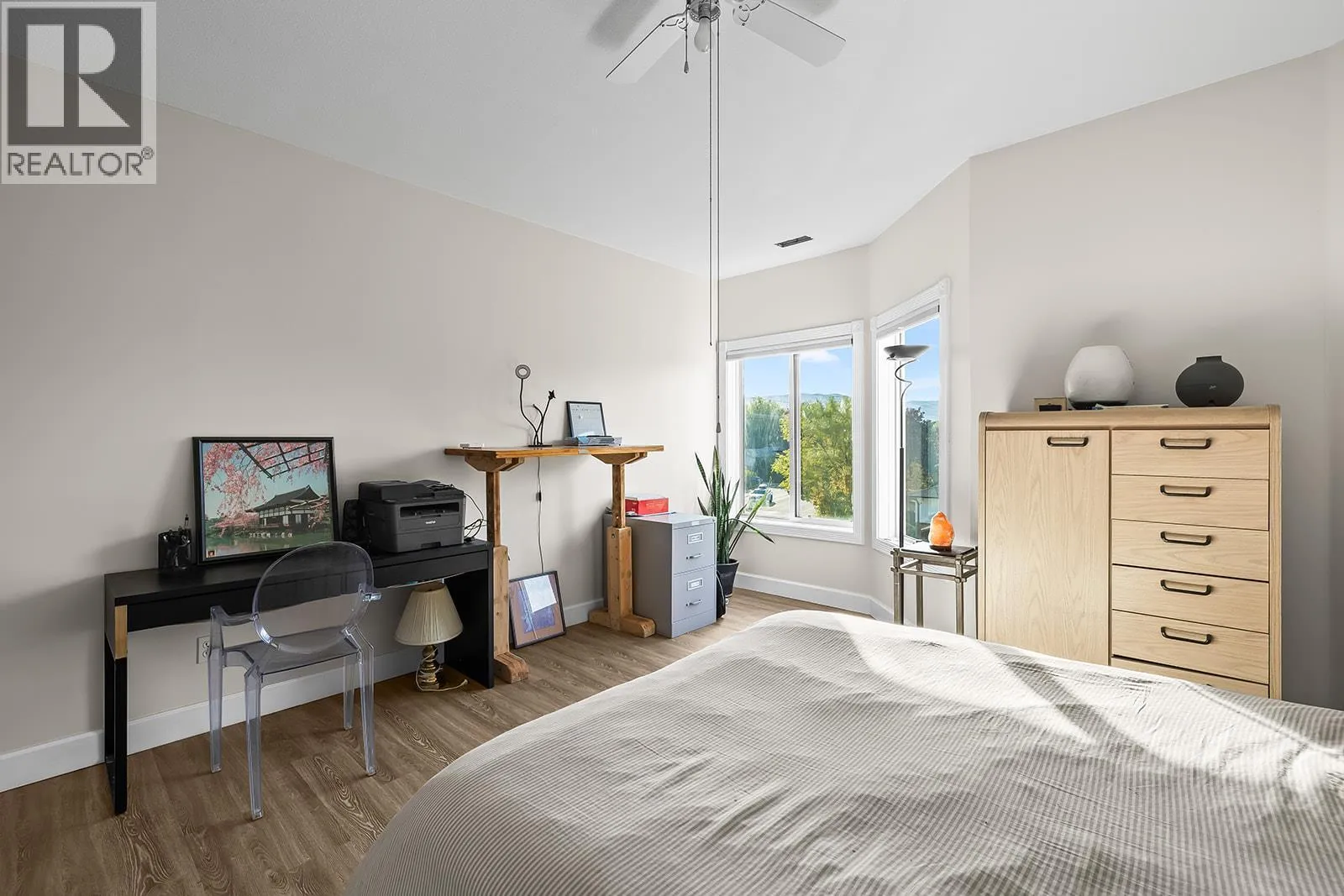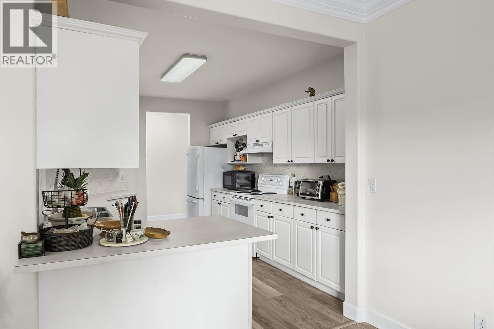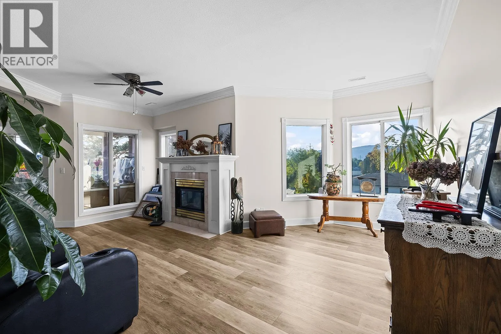 This spacious 2 bedroom, 2 bathroom corner suite offers incredible natural light, comfort, and convenience in one of Kelownaâs most desirable central locations. Freshly painted with new flooring throughout, the home features a large kitchen that opens onto a bright living and dining area complete with a gas fireplace and crown mouldings. Enjoy year-round outdoor living on the covered and enclosed patio. The primary bedroom includes two windows, a walk-in closet, and a full ensuite bath, while the second bedroom positioned on opposite end of unit for added privacy, offers excellent light and space. A large laundry and storage room adds to the functionality. Additional features include secure parking, a storage locker, central heating and cooling, and strata fees that cover hot water, natural gas, and the gas fireplace. Located in the Kelowna General Hospital district, this bright and well-kept home provides easy access to downtown, shops, restaurants, beaches, and parks â close to everything you need. (id:27476)