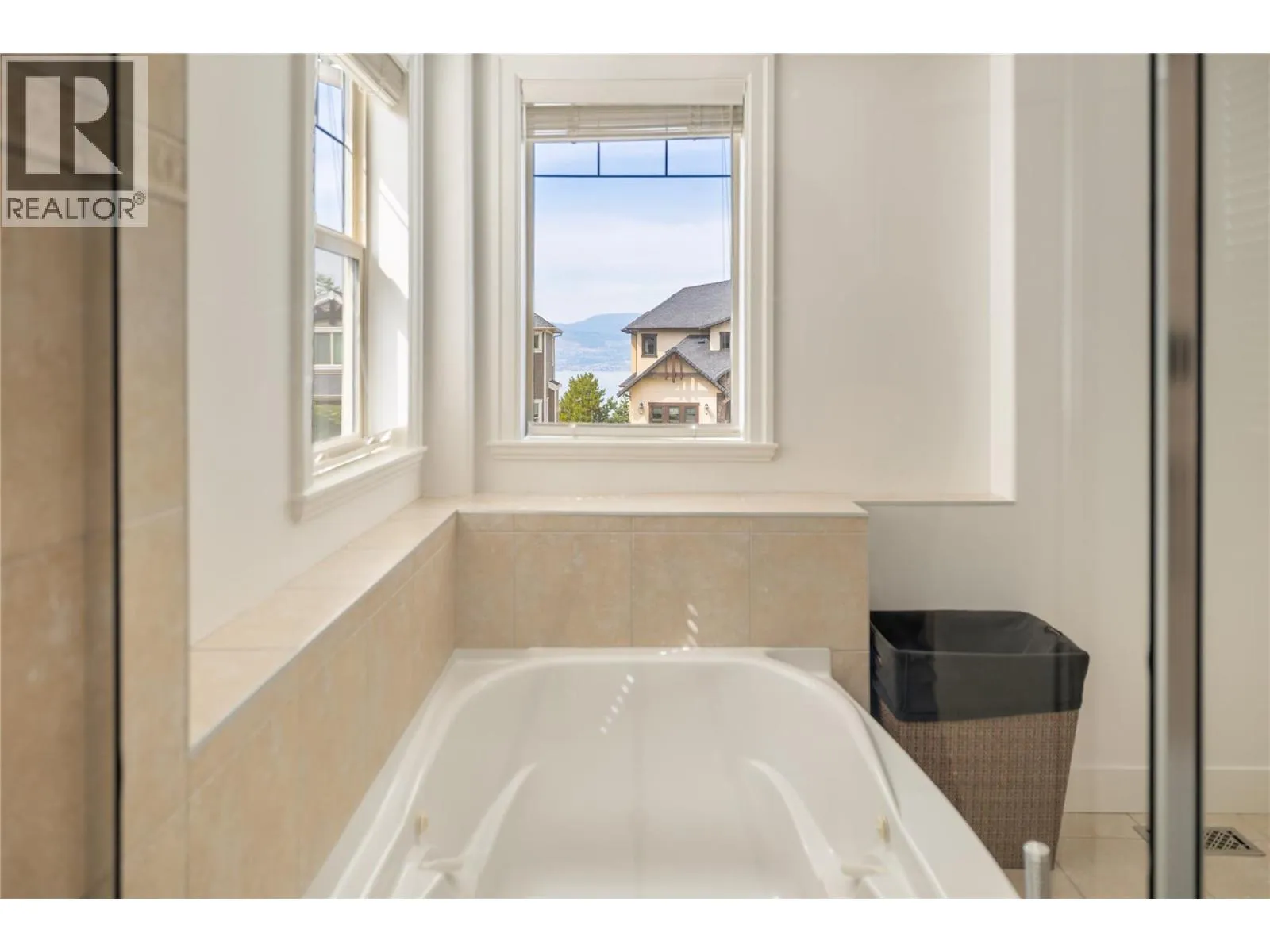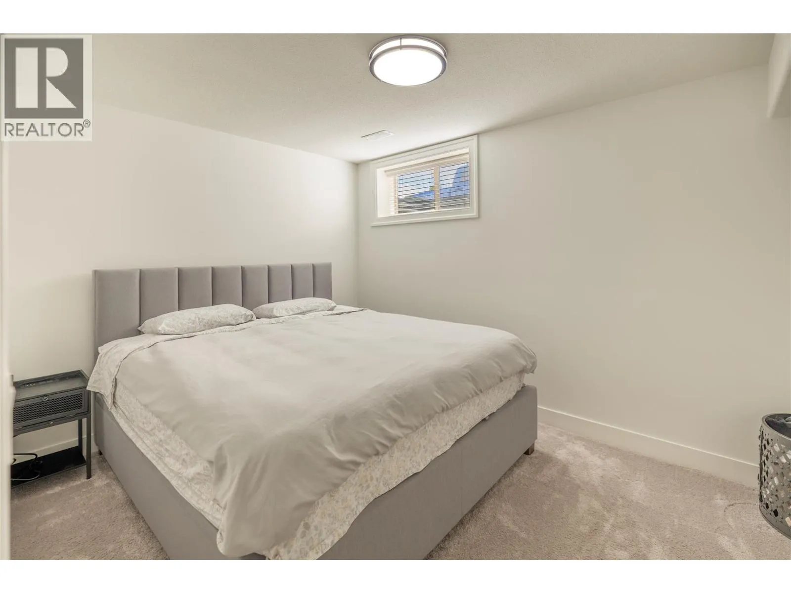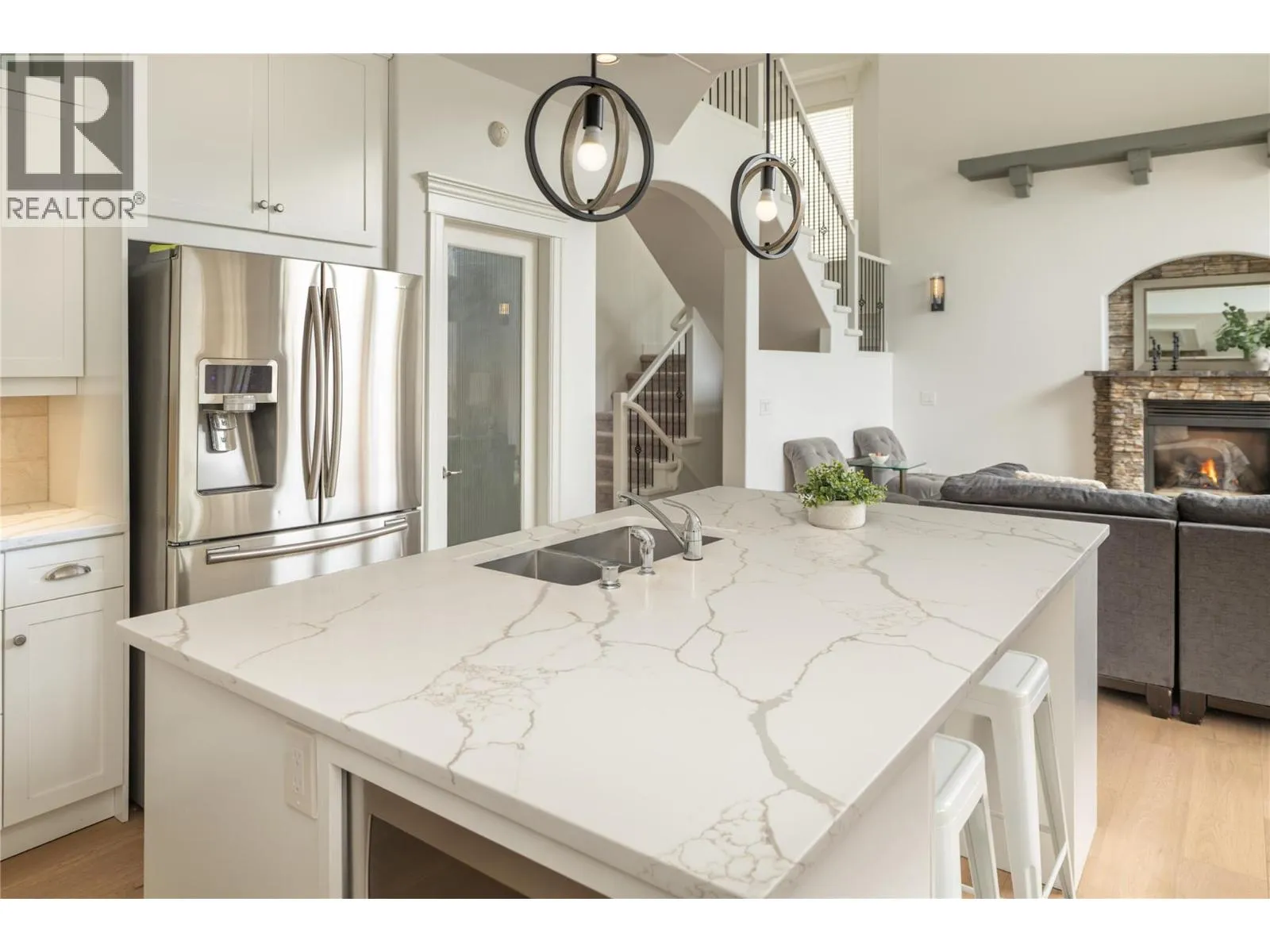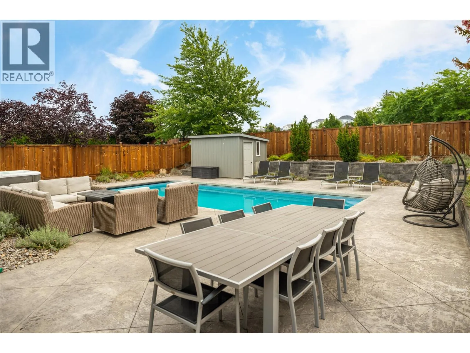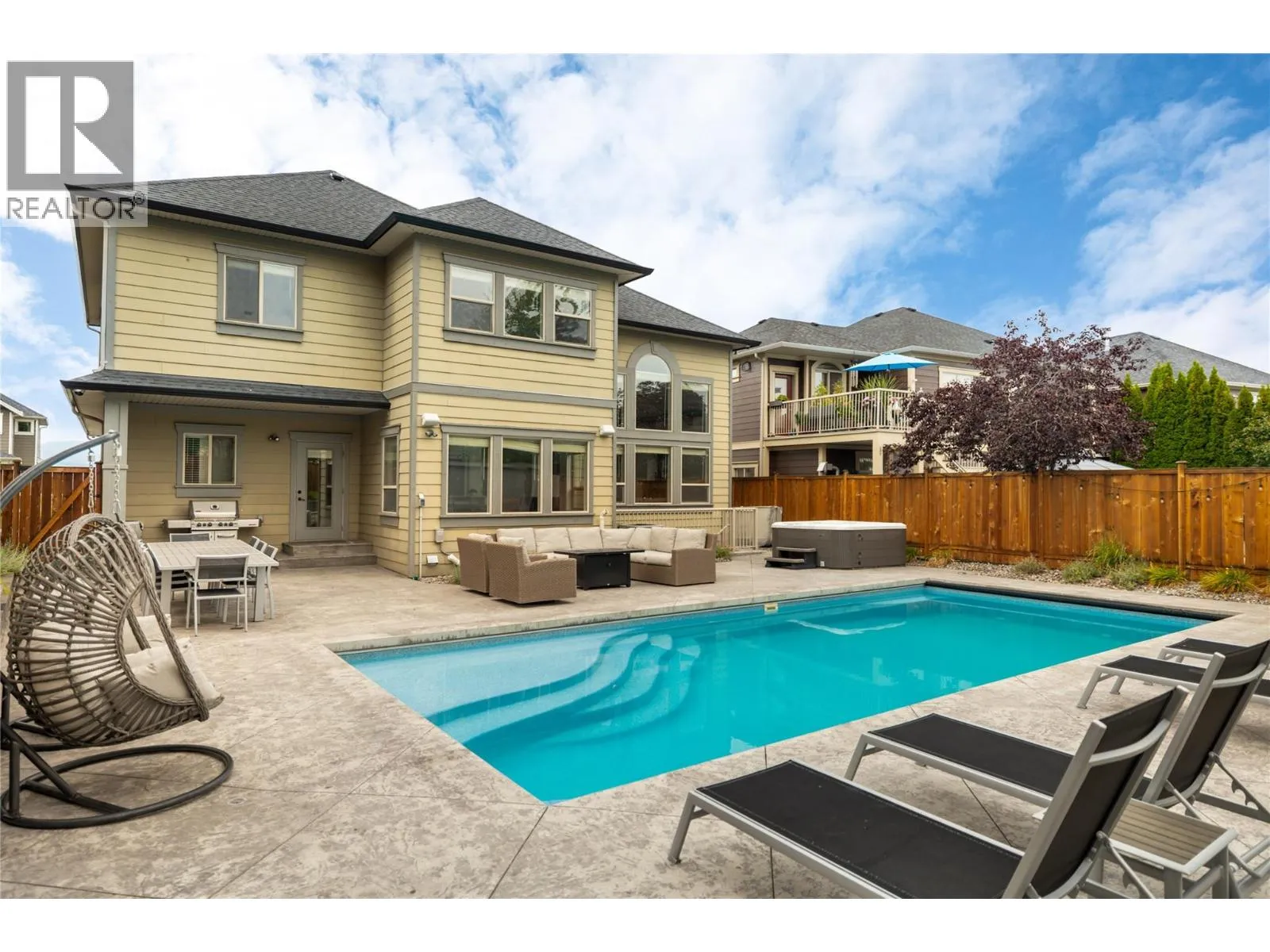 Discover this stunning 3,844 sq. ft. family home in the heart of Kettle Valley, perfectly designed for lifestyle and comfort. The backyard is a true retreat with a saltwater pool featuring an auto cover, a hot tub, and a fully fenced yard that backs directly onto Quilchena Park. The poolside patio flows seamlessly off the main level, allowing you to watch the family swim while preparing meals in the kitchen with its large island, pantry, and abundant storage. Inside, soaring ceilings and a gas fireplace create a warm, open-concept living space. The main floor also offers a bedroom, laundry, and a spacious double garage. Upstairs, three bedrooms plus a loft provide plenty of family space, while the expansive primary suite has double vanities, a soaking tub, walk-in shower, private water closet, and walk-in closet. The lower level adds even more versatility with a large rec room, office/den, additional bedroom and bathroom, plus a separate entrance. Updates include a brand-new high-efficiency furnace and heat pump, a new hot water tank plus a new auto cover for the pool (2023), while features such as a built-in vacuum add convenience. Ideally located within walking distance to schools, parks, coffee shops, and community stores, this home blends luxury with everyday ease. (id:27476)