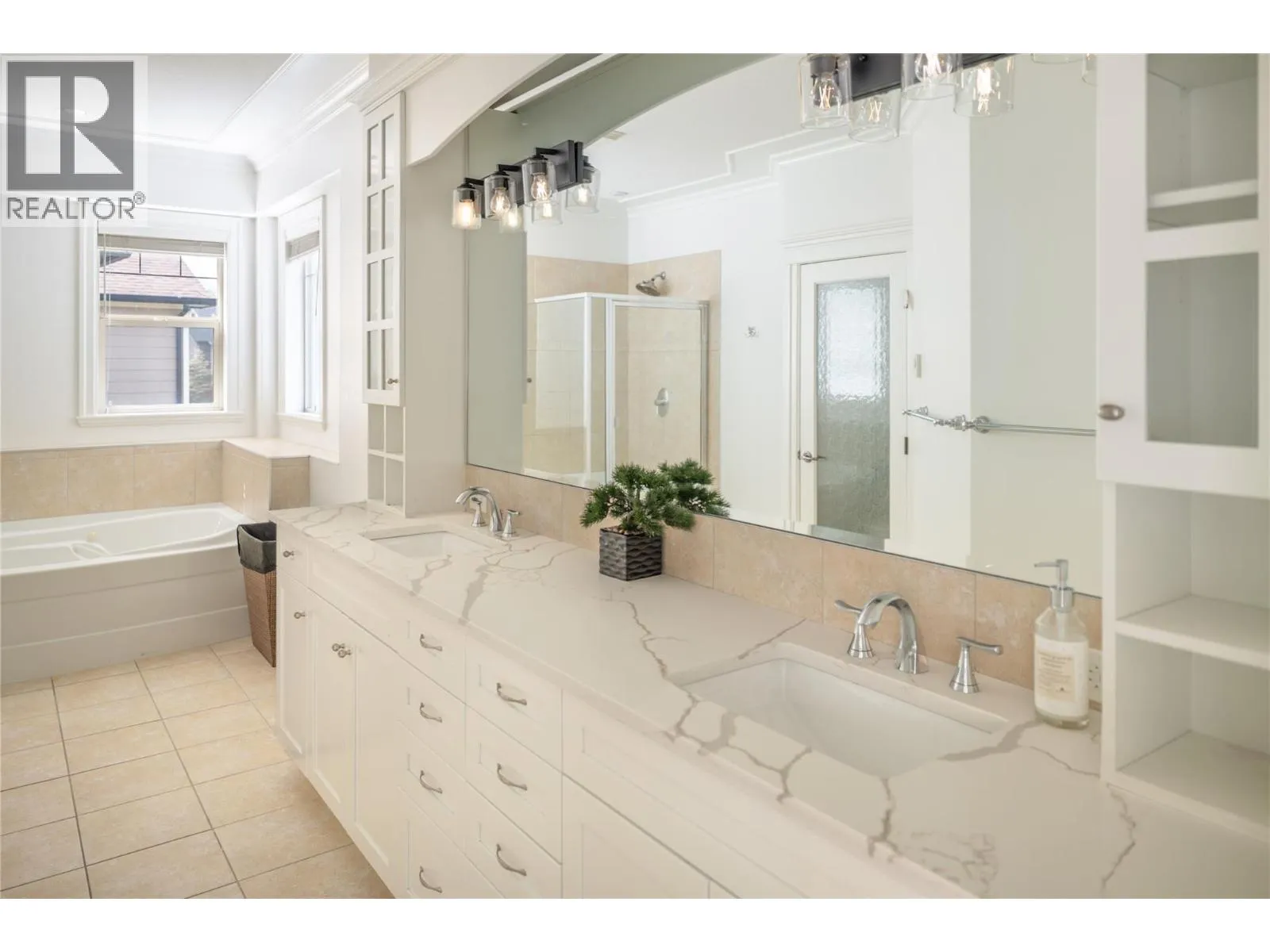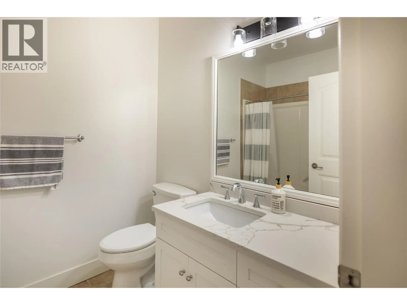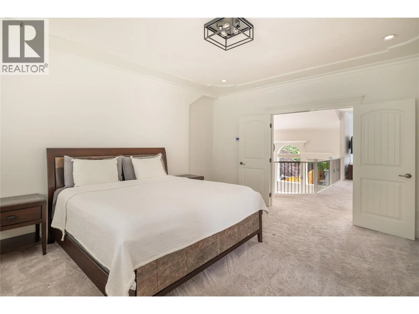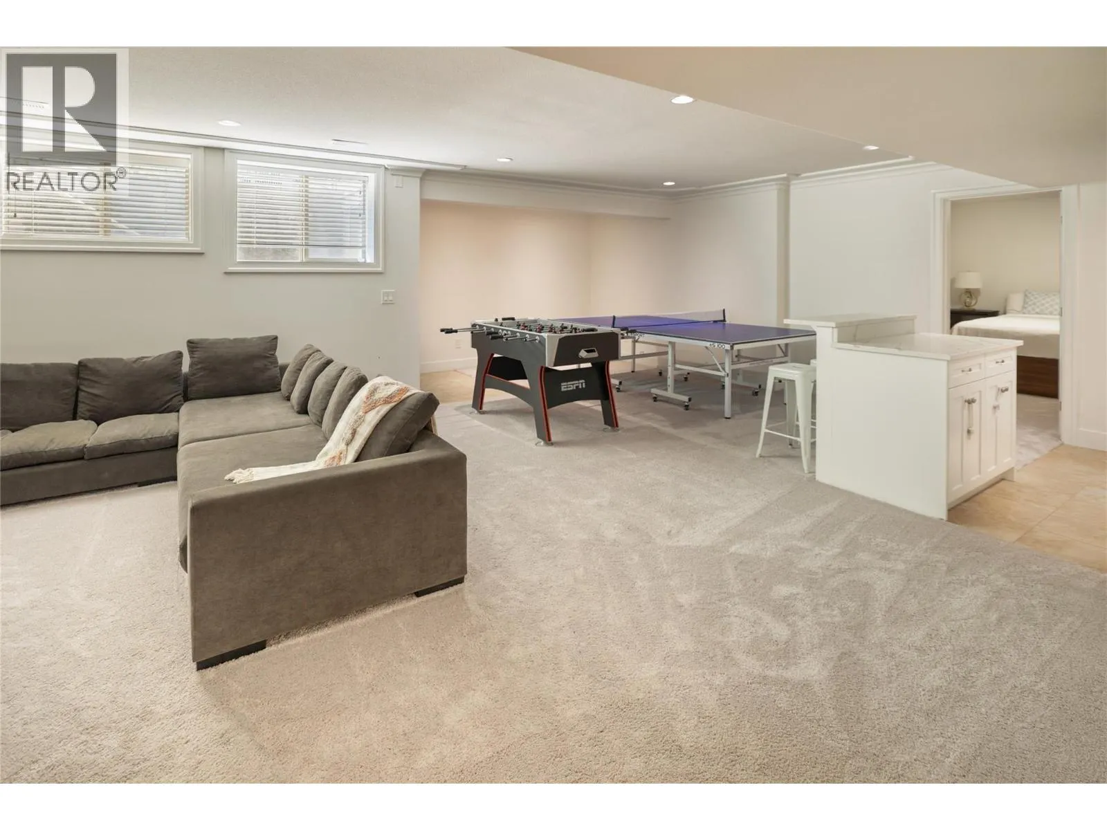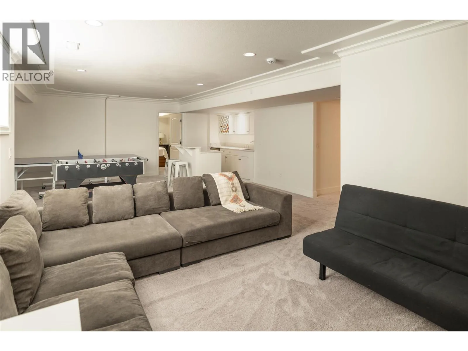 Discover this stunning 3,844 sq. ft. family home in the heart of Kettle Valley, perfectly designed for lifestyle and comfort. The backyard is a true retreat with a saltwater pool featuring an auto cover, a hot tub, and a fully fenced yard that backs directly onto Quilchena Park. The poolside patio flows seamlessly off the main level, allowing you to watch the family swim while preparing meals in the kitchen with its large island, pantry, and abundant storage. Inside, soaring ceilings and a gas fireplace create a warm, open-concept living space. The main floor also offers a bedroom, laundry, and a spacious double garage. Upstairs, three bedrooms plus a loft provide plenty of family space, while the expansive primary suite has double vanities, a soaking tub, walk-in shower, private water closet, and walk-in closet. The lower level adds even more versatility with a large rec room, office/den, additional bedroom and bathroom, plus a separate entrance. Updates include a brand-new high-efficiency furnace and heat pump, a new hot water tank plus a new auto cover for the pool (2023), while features such as a built-in vacuum add convenience. Ideally located within walking distance to schools, parks, coffee shops, and community stores, this home blends luxury with everyday ease. (id:27476)