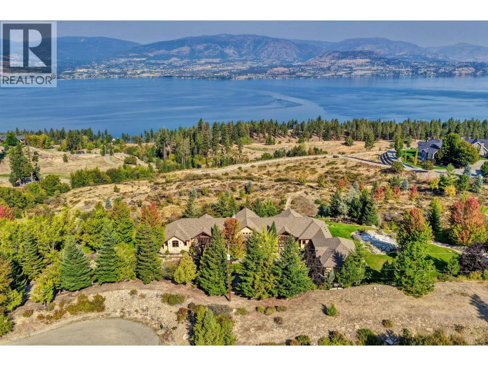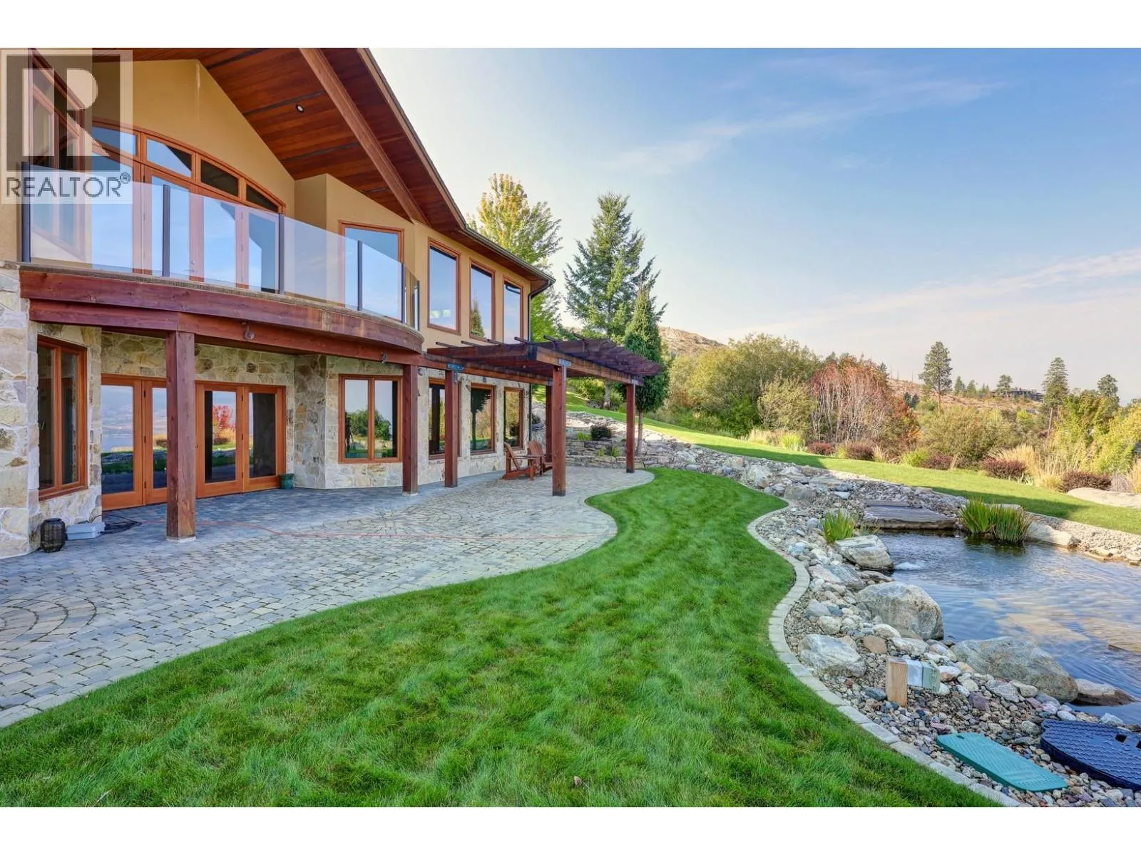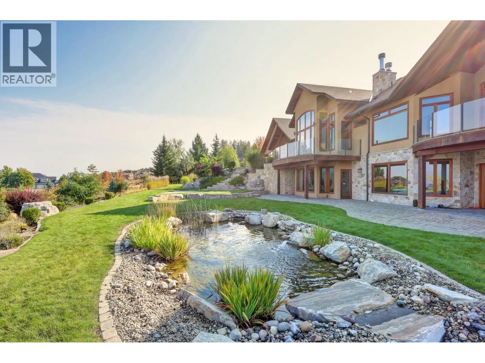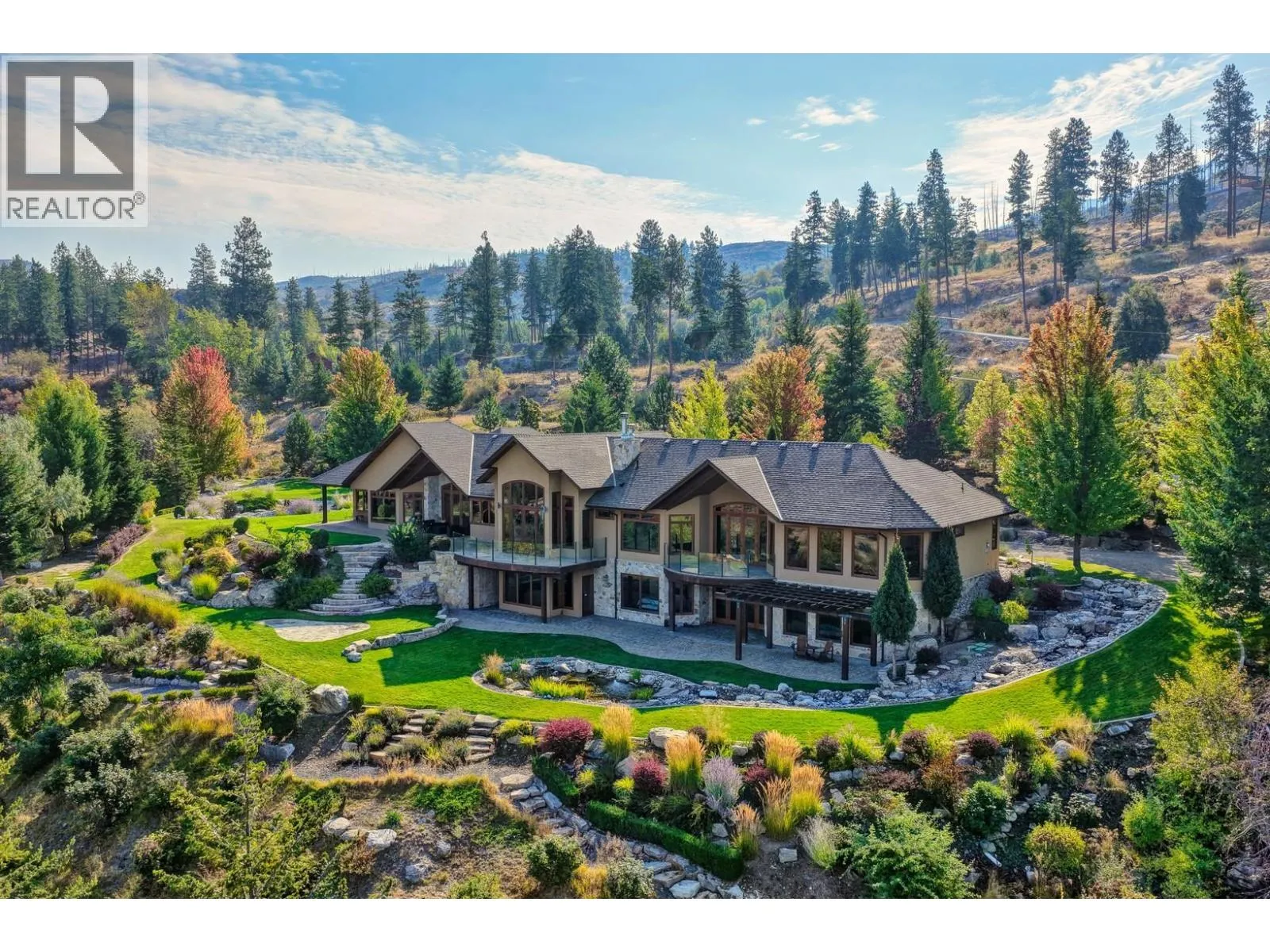A private oasis with panoramic lake views from nearly every room, this exceptional residence is set on nearly 10 acres in the prestigious Rim Rock subdivision. The fully usable acreage is beautifully integrated with the natural Okanagan landscape, featuring scenic trails, stone staircases, and cascading water features that flow into tranquil ponds. Inside, the custom-built home exudes warmth and sophistication. With 4 bedrooms + den and 6 bathrooms, every space is thoughtfully designed and impeccably finished. The vaulted great room, gourmet designer kitchen, and spacious dining area flow seamlessly together, framed by walls of glass that showcase breathtaking vista views. Perfect for the music enthusiast, the home includes a fully insulated piano room that transitions into a soundproof recording studio. The lower level offers approximately 1,500 sq. ft. of versatile space to suit your lifestyle needs. Outdoors, multiple patios invite you to relax and take in the serene surroundings. A level, meandering drive lined with lush plantings leads to an oversized double garage and carport for additional covered parking. With top-of-the-line mechanical systems, including geothermal heating and cooling, this estate offers ultimate tranquility and timeless luxury in a spectacular lake-view setting. (id:27476)