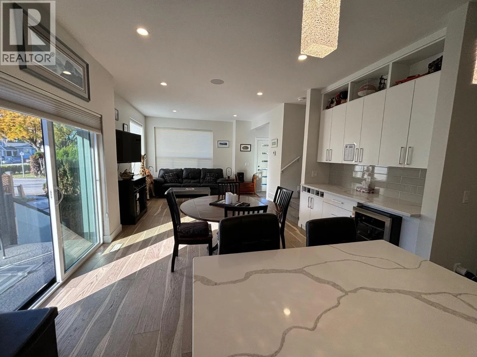 Stunning contemporary style townhome located in desirable South Kelowna - just a short walk to the beach, hospital, and South Pandosy shopping. 4-plex design with low strata fees & high-end finishings. Fantastic outdoor space featuring private roof top deck which is engineered for a hot-tub and plumbed for gas barbeque, plus there is a main floor side yard deck. 2 storey design unit with 2 beds, 2 baths and laundry on the 2nd floor. Open main floor with oak hardwood floors, built-in dining room bar with wine fridge, island kitchen with high quality stainless steel appliances including 5 burner gas range, plus half bath. Lower level consists of a large rec room which could be converted into a den plus a flex room. This level also features a full bathroom. Quality upgrades include quartz counter-tops, engineered hardwood floors, 3 zone home audio system, tank-less hot water heating frame-less glass shower, epoxy garage floor with glass/aluminum garage door. No rental or pet restrictions & low strata fees! Fantastic location, gorgeous designs and high-end finishings! (id:27476)