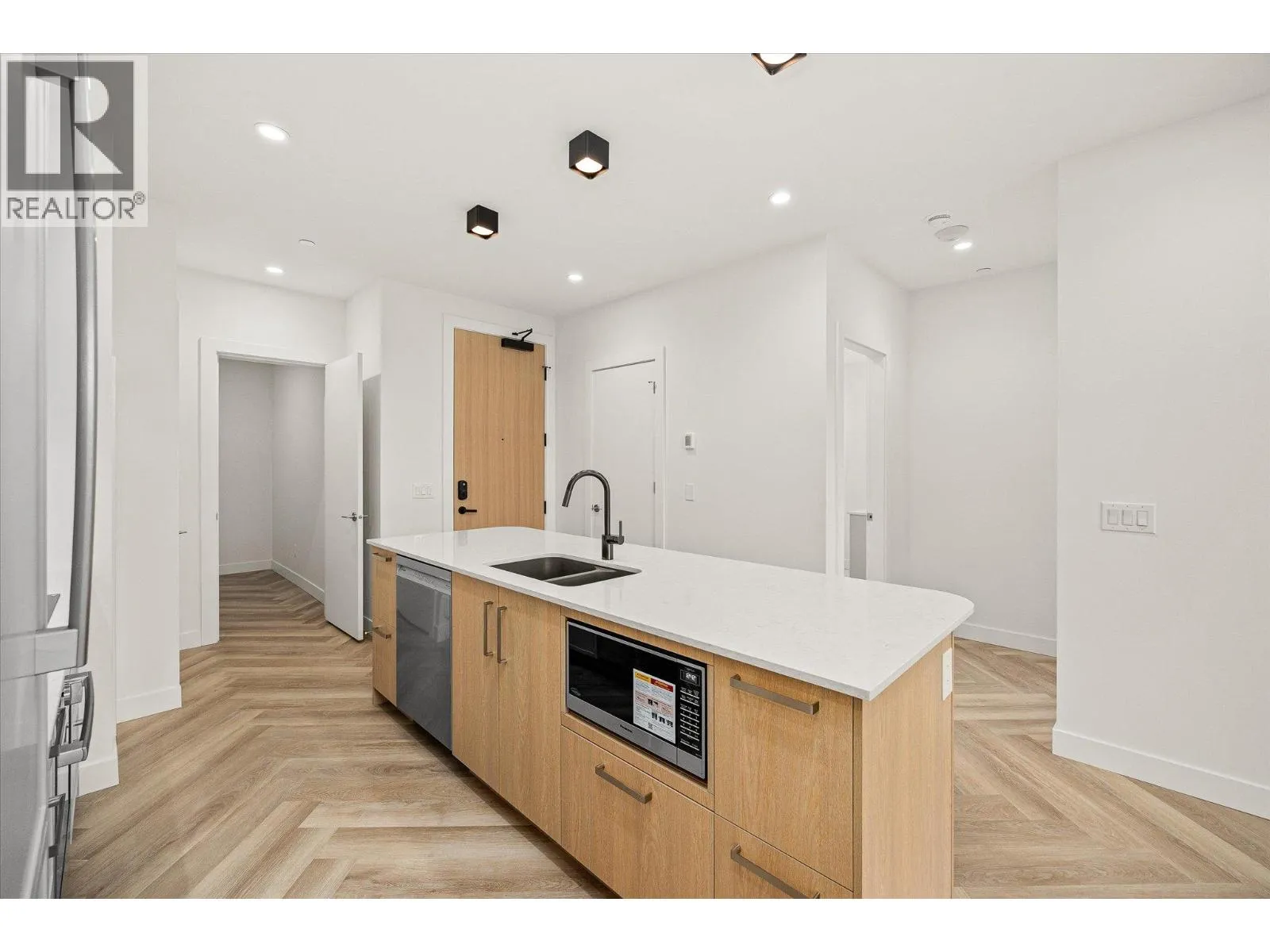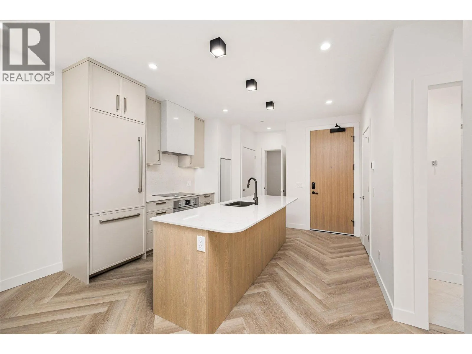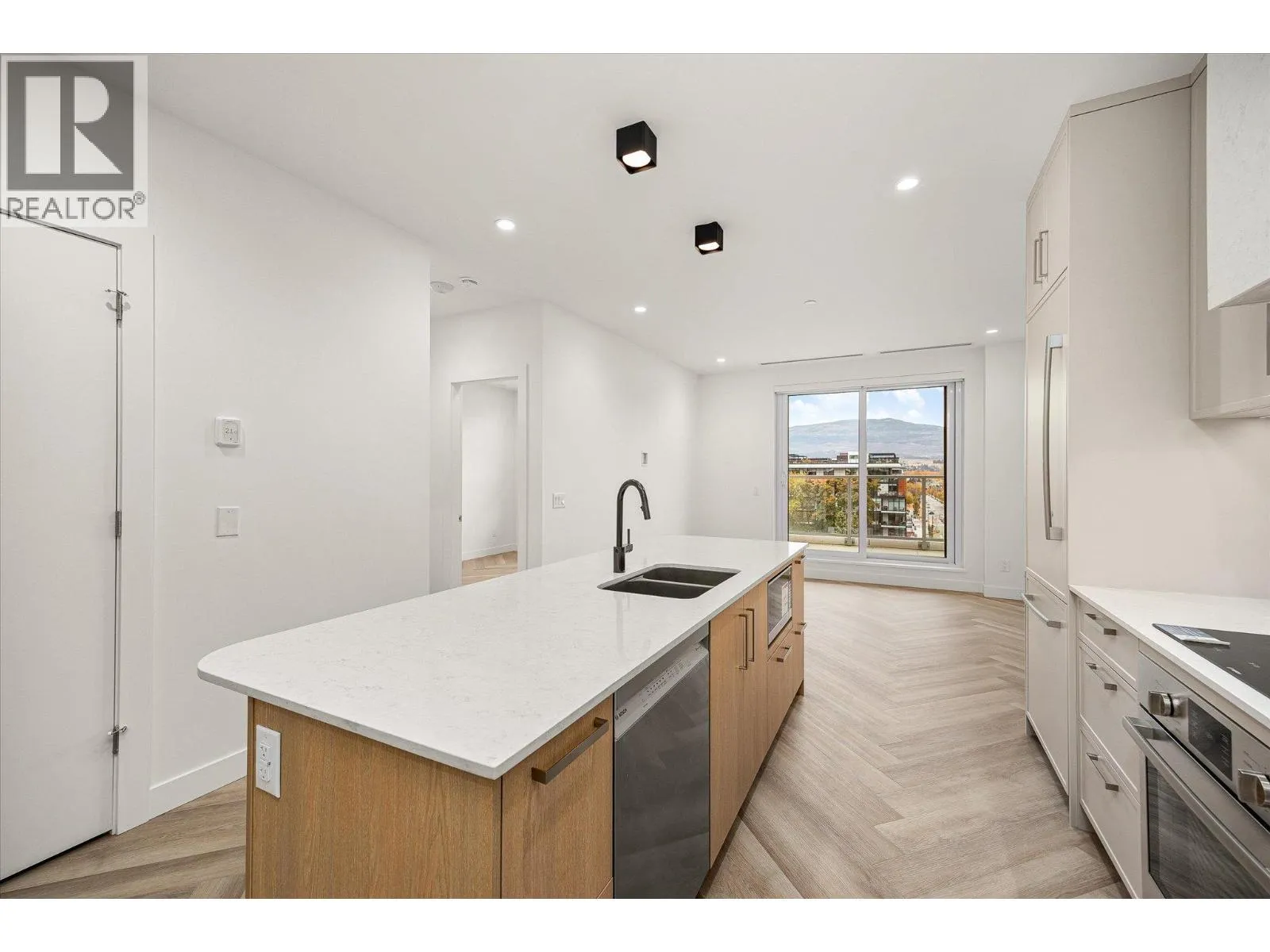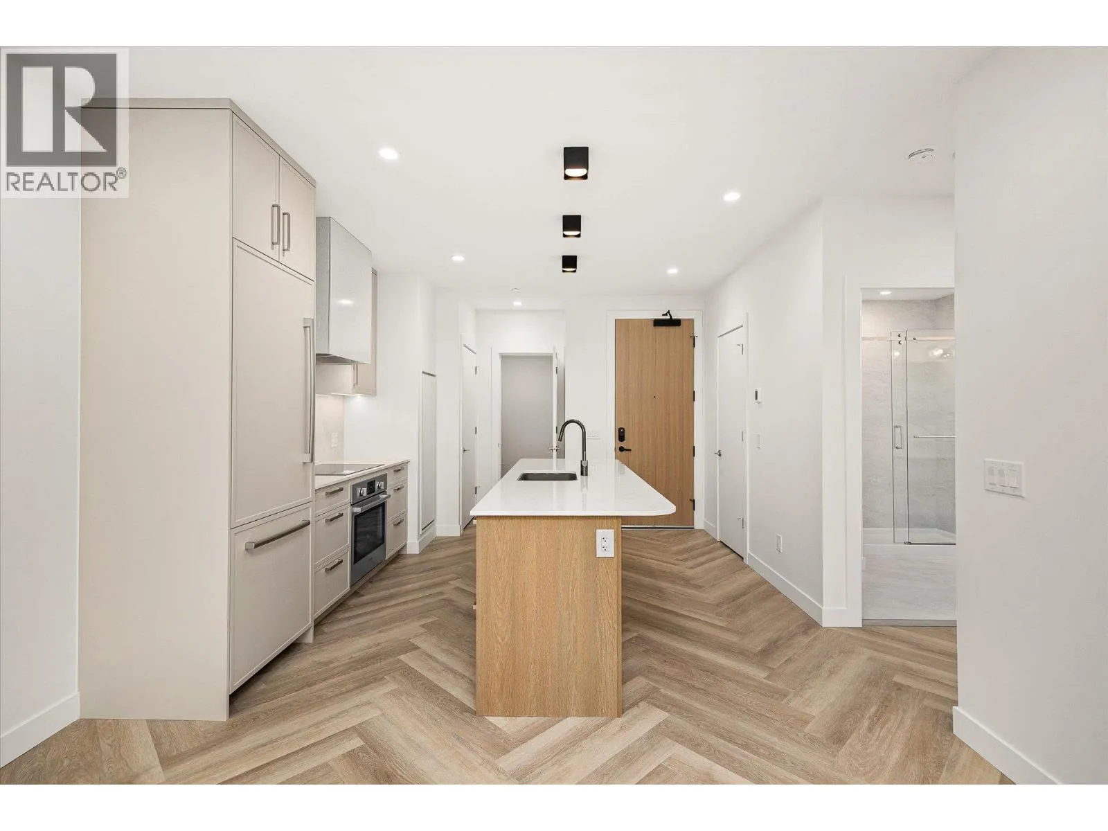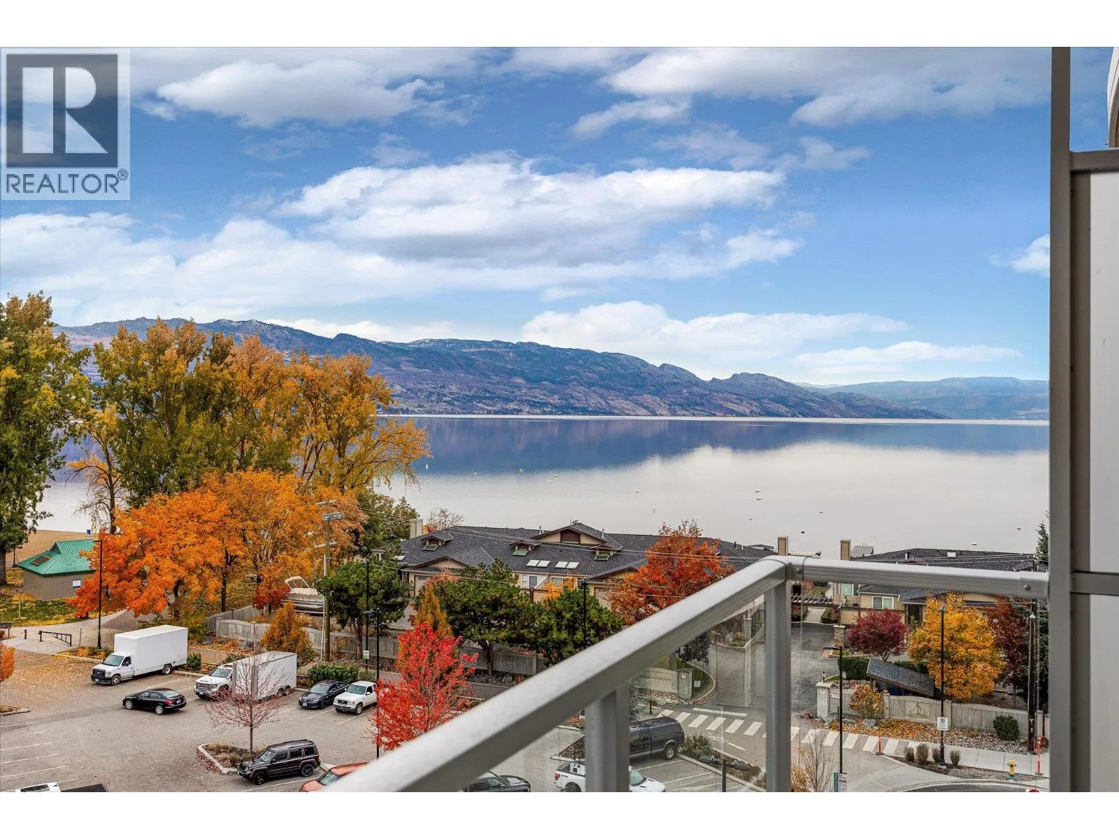 Modern Lakeside Amenity-Rich Living at Movala; Kelownaâs most anticipated new address, positioned between sandy beaches, vibrant eateries & boutique shopping! This gorgeous lakeview 1-bdrm+den condo combines modern design with functionality, creating an effortless urban retreat just steps to Pandosy Village. Beautifully crafted, featuring modern cabinetry, luxury vinyl plank flooring, quartz surfaces & 9ft ceilings. The chef-inspired kitchen offers premium SS appl. complemented by a fully integrated refrigerator. The spacious island offers plenty of prep space & casual seating for 4 - perfect for entertaining! The bright living area flows seamlessly to the covered south-facing patio w/natural gas hookup, where you can take in views of Okanagan Lake, Gyro Beach Park & soak up the Kelowna sunshine! The primary bdrm features a walk-in closet w/custom built-ins & large south-facing window, while the sleek 4pc bath boasts an oversized walk-in shower, dual sinks & modern tile finishes. A versatile den completes this cozy home & offers flexibility for guests or home office. Movala offers resort-inspired amenities - A lakeview pool & hot tub and cabanas surrounded by lush landscaped grounds with fire tables, bocce lawns & alfresco BBQ areas. Inside, enjoy a gym & yoga studio, co-working spaces, entertainment lounge, great room with casual seating, a library, private dining room + a guest suite & pet wash! Truly an unmatched lifestyle in an unmatched location! & GST has been paid! (id:27476)
