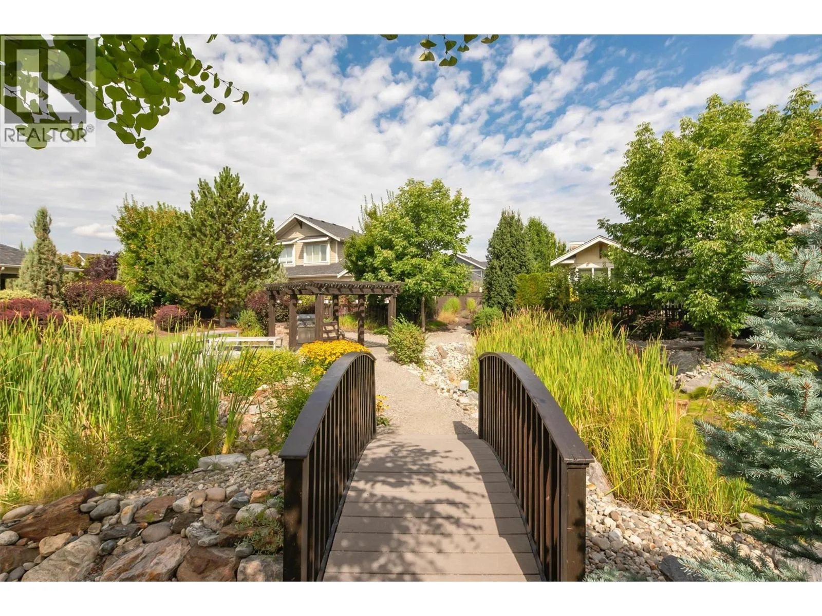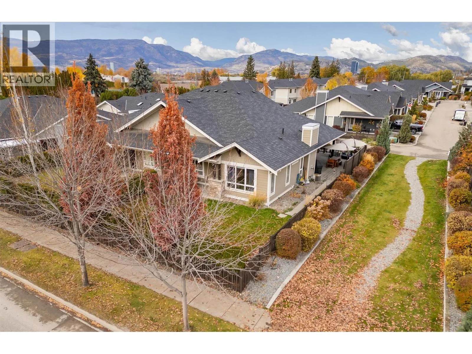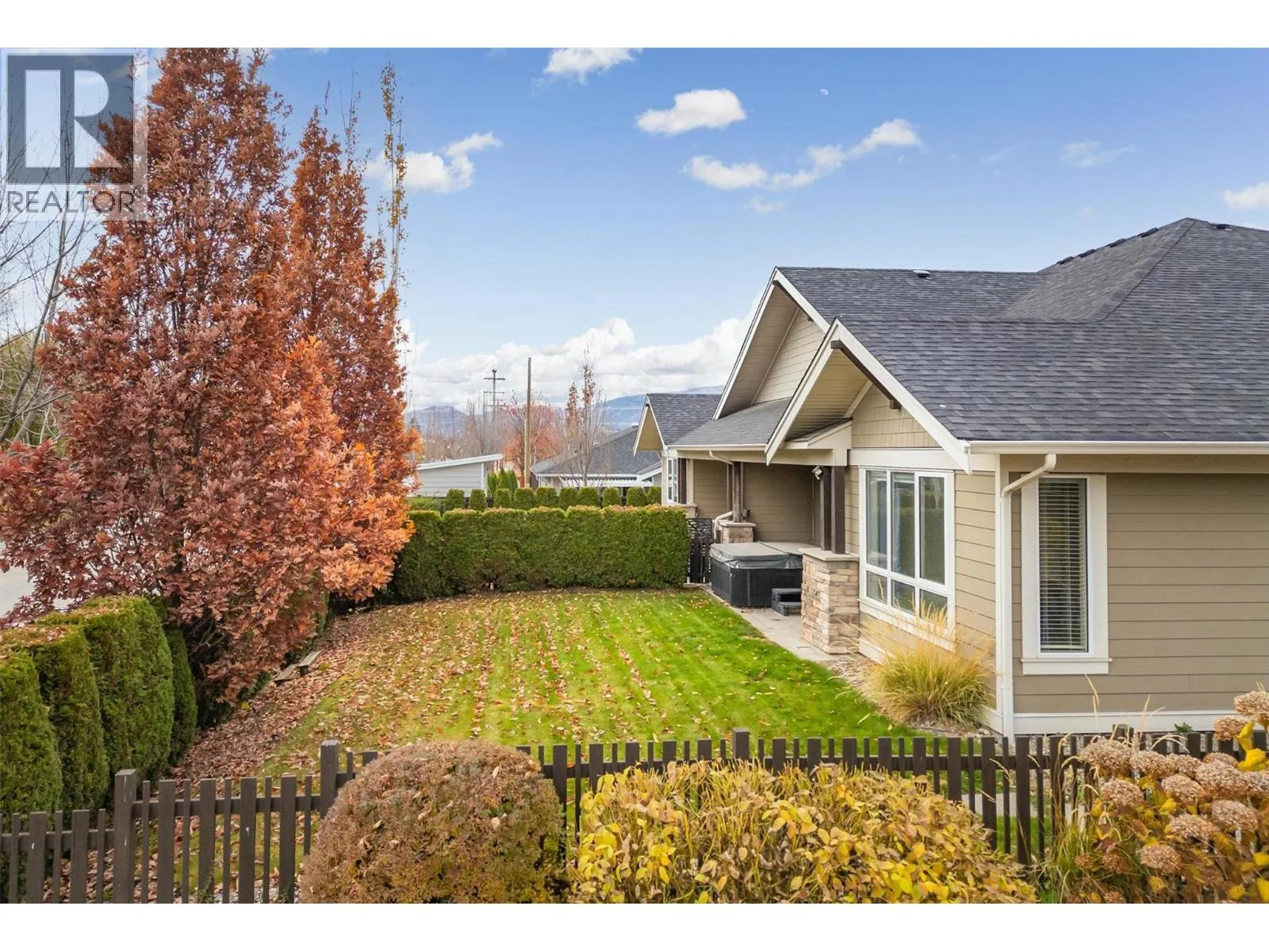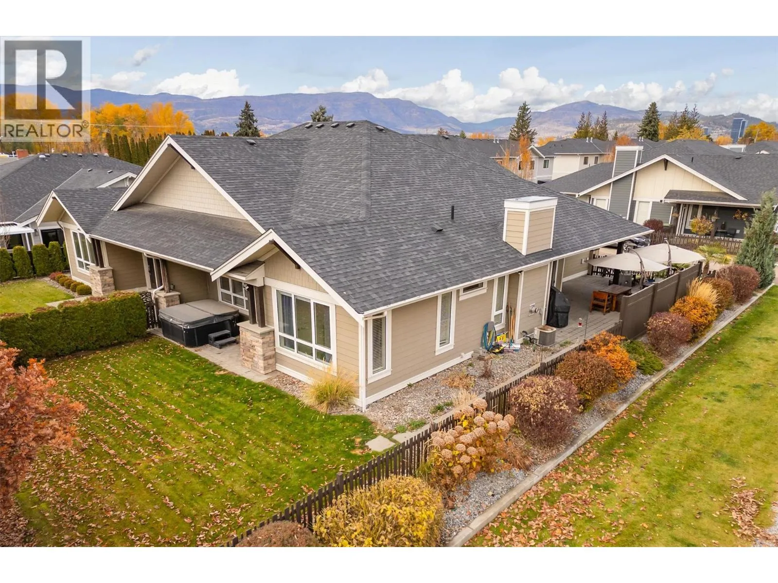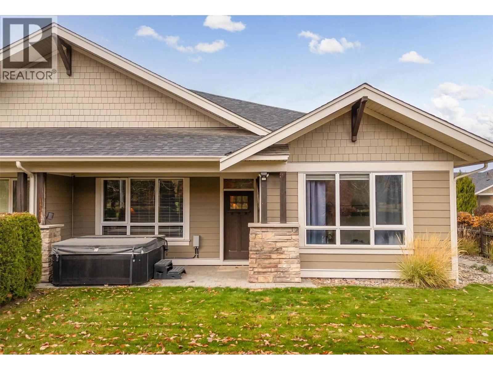 OPEN HOUSE SAT NOV 15 11am-1pm. UPSCALE Rancher style living in this beautifully appointed Townhome in desirable GableCraft! Ideally situated with a 180 degree view of Mission Creek Golf course, on an extra large lot allowing parking for 5! Minutes from town, Lake, Beach, College, and Orchard Park. Perfect for golf enthusiasts! Stylish warm interior with High 9â ceilings with recessed ceilings and a Rock gas feature fireplace in the open Great room, creates an inviting atmosphere for relaxation and entertainment. Gourmet Rich espresso shaker-style maple Kitchen with ample storage, granite counters, island. Easy-maintenance laminate flooring throughout the main areas, cosy plush carpets in bedrooms. Separate laundry room. 2 Big Bedrooms. Primary Suite features solid wood shiplap walls, a large walk-in closet, door to a back patio with rough-in for hot tub, and a huge picture window with views of the Golf course. Luxurious 5-piece ensuite with soaker tub and frameless glass shower. Large 2nd Bedroom is spacious, perfect for guests or family. 3 piece Ensuite with big walk in glass shower with built in seat. Impressive expanded outdoor Stone block Patio offers open and covered pergola areas perfect for entertaining, BBQs, outdoor enjoyment. 5 PARKING SPACES on your lot! Extra Large 23x20'7 Garage with attractive Polyaspartic floors. Large front row lots allowed 3 outside spaces, and permission for RV parking from April through October...Wow! (id:27476)