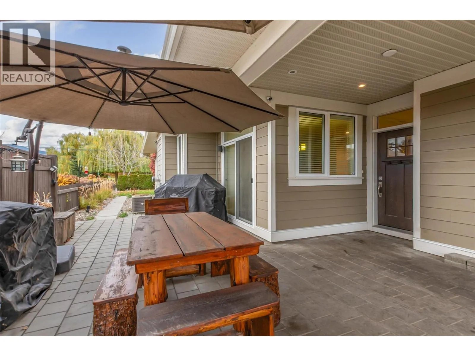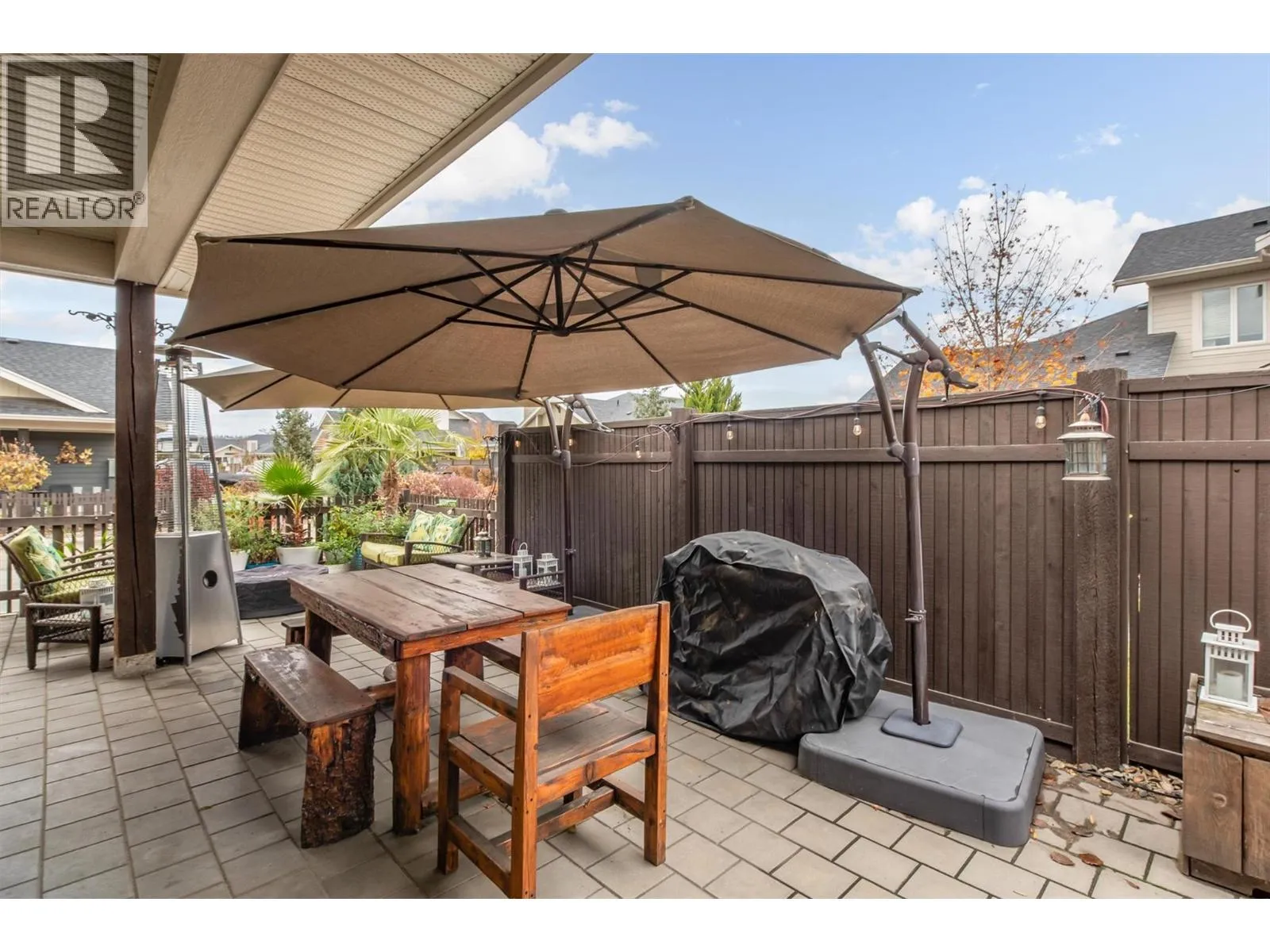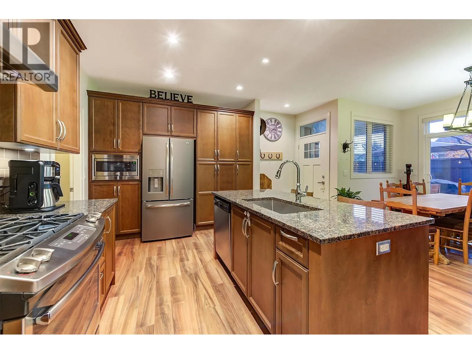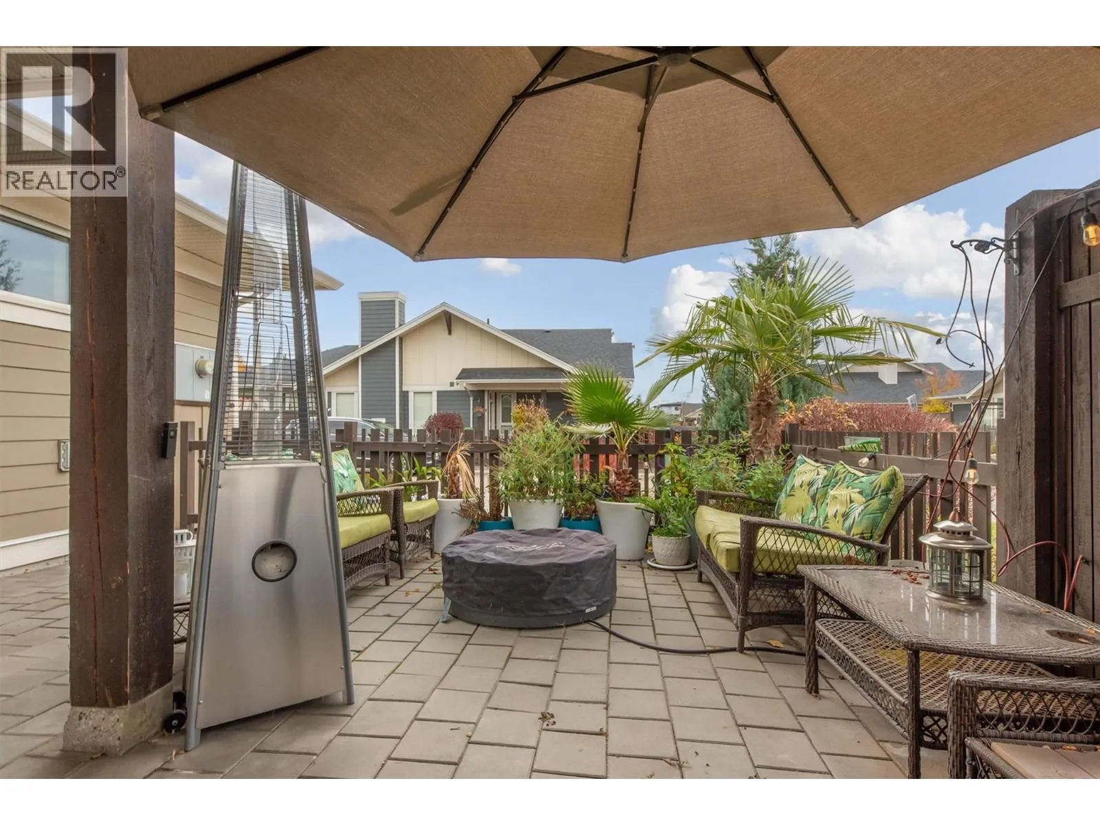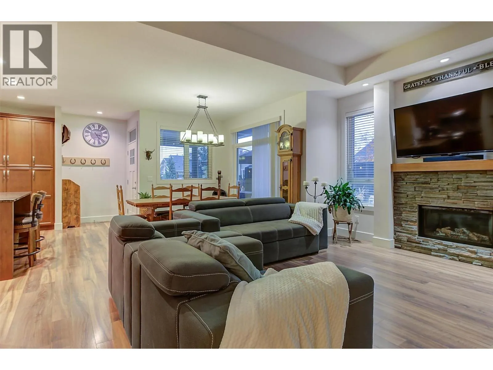 OPEN HOUSE SAT NOV 15 11am-1pm. UPSCALE Rancher style living in this beautifully appointed Townhome in desirable GableCraft! Ideally situated with a 180 degree view of Mission Creek Golf course, on an extra large lot allowing parking for 5! Minutes from town, Lake, Beach, College, and Orchard Park. Perfect for golf enthusiasts! Stylish warm interior with High 9â ceilings with recessed ceilings and a Rock gas feature fireplace in the open Great room, creates an inviting atmosphere for relaxation and entertainment. Gourmet Rich espresso shaker-style maple Kitchen with ample storage, granite counters, island. Easy-maintenance laminate flooring throughout the main areas, cosy plush carpets in bedrooms. Separate laundry room. 2 Big Bedrooms. Primary Suite features solid wood shiplap walls, a large walk-in closet, door to a back patio with rough-in for hot tub, and a huge picture window with views of the Golf course. Luxurious 5-piece ensuite with soaker tub and frameless glass shower. Large 2nd Bedroom is spacious, perfect for guests or family. 3 piece Ensuite with big walk in glass shower with built in seat. Impressive expanded outdoor Stone block Patio offers open and covered pergola areas perfect for entertaining, BBQs, outdoor enjoyment. 5 PARKING SPACES on your lot! Extra Large 23x20'7 Garage with attractive Polyaspartic floors. Large front row lots allowed 3 outside spaces, and permission for RV parking from April through October...Wow! (id:27476)