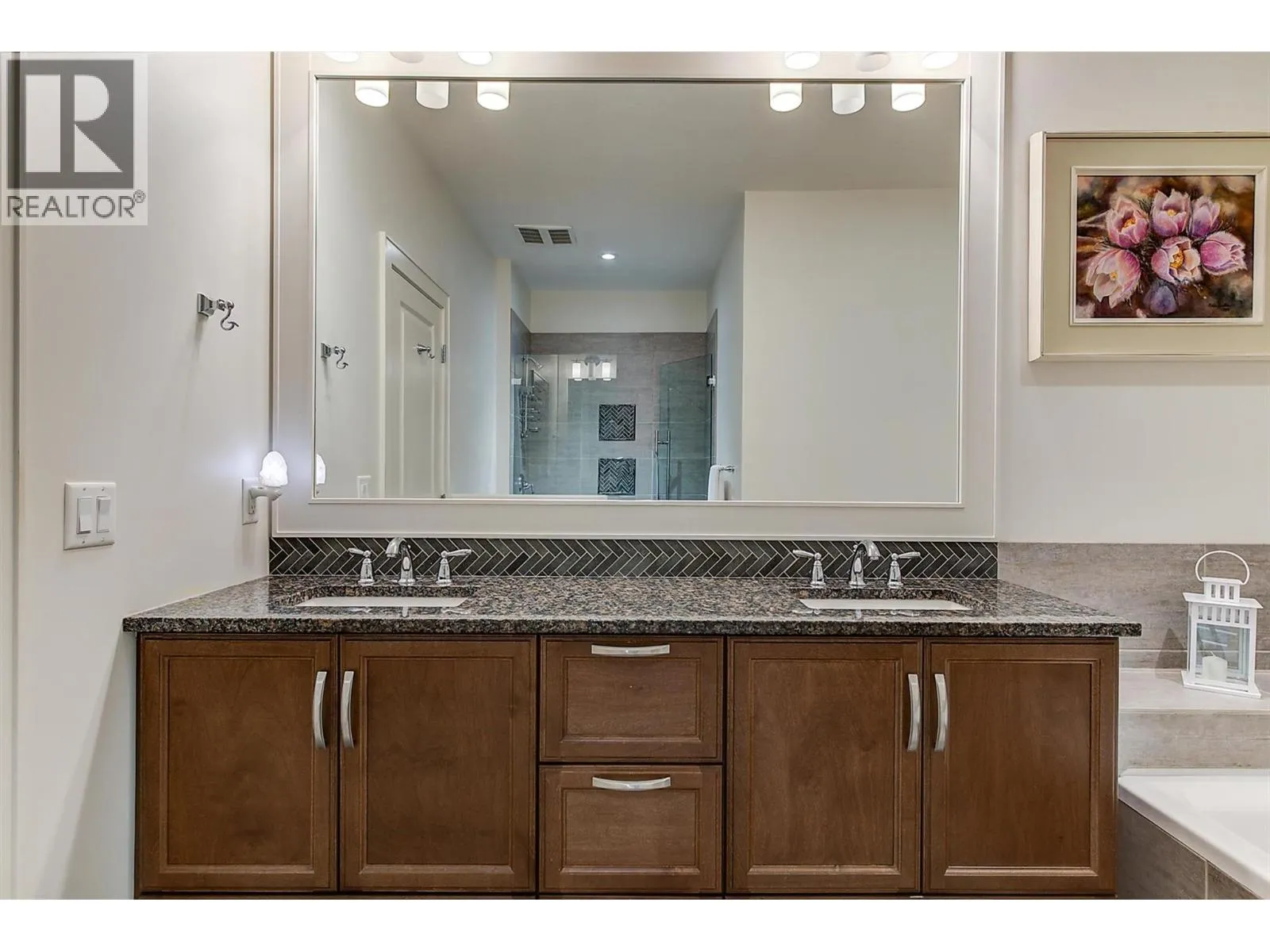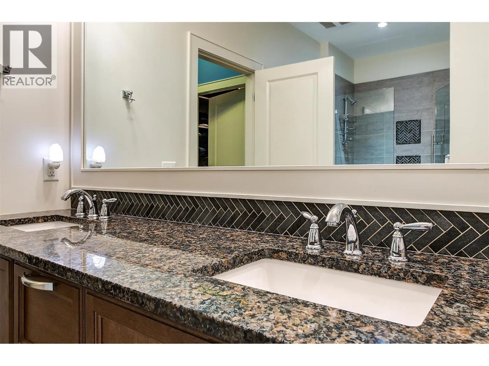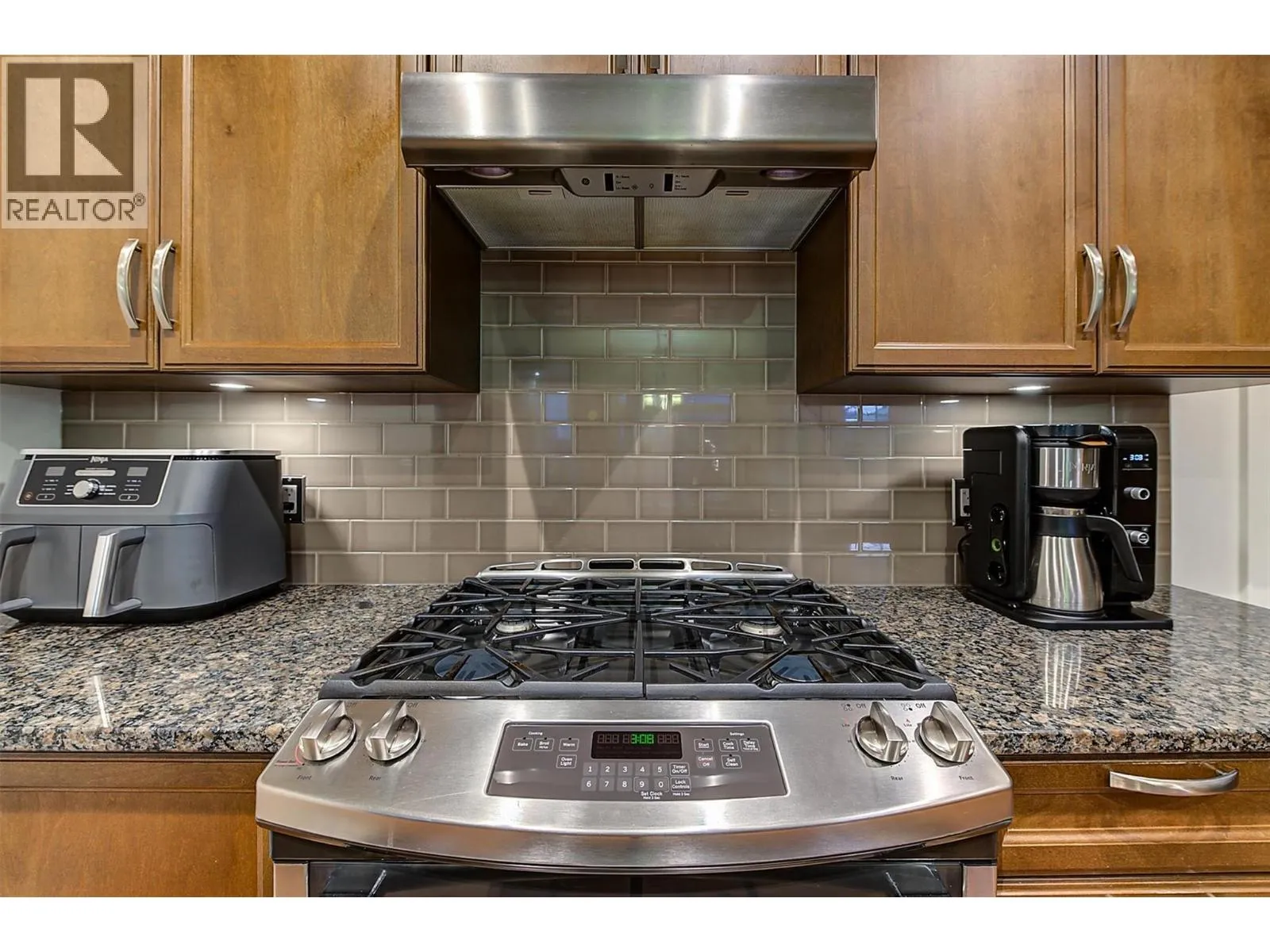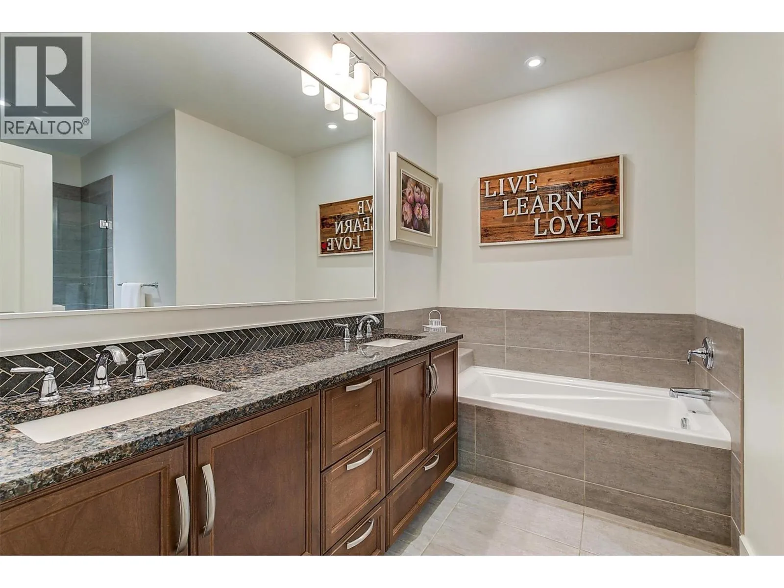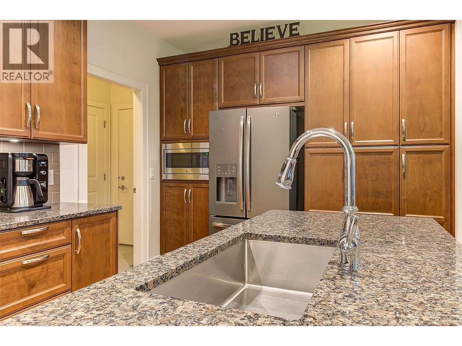 OPEN HOUSE SAT NOV 15 11am-1pm. UPSCALE Rancher style living in this beautifully appointed Townhome in desirable GableCraft! Ideally situated with a 180 degree view of Mission Creek Golf course, on an extra large lot allowing parking for 5! Minutes from town, Lake, Beach, College, and Orchard Park. Perfect for golf enthusiasts! Stylish warm interior with High 9â ceilings with recessed ceilings and a Rock gas feature fireplace in the open Great room, creates an inviting atmosphere for relaxation and entertainment. Gourmet Rich espresso shaker-style maple Kitchen with ample storage, granite counters, island. Easy-maintenance laminate flooring throughout the main areas, cosy plush carpets in bedrooms. Separate laundry room. 2 Big Bedrooms. Primary Suite features solid wood shiplap walls, a large walk-in closet, door to a back patio with rough-in for hot tub, and a huge picture window with views of the Golf course. Luxurious 5-piece ensuite with soaker tub and frameless glass shower. Large 2nd Bedroom is spacious, perfect for guests or family. 3 piece Ensuite with big walk in glass shower with built in seat. Impressive expanded outdoor Stone block Patio offers open and covered pergola areas perfect for entertaining, BBQs, outdoor enjoyment. 5 PARKING SPACES on your lot! Extra Large 23x20'7 Garage with attractive Polyaspartic floors. Large front row lots allowed 3 outside spaces, and permission for RV parking from April through October...Wow! (id:27476)