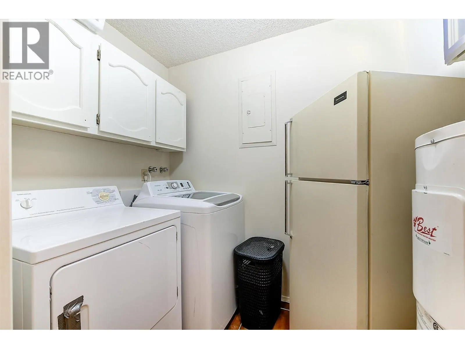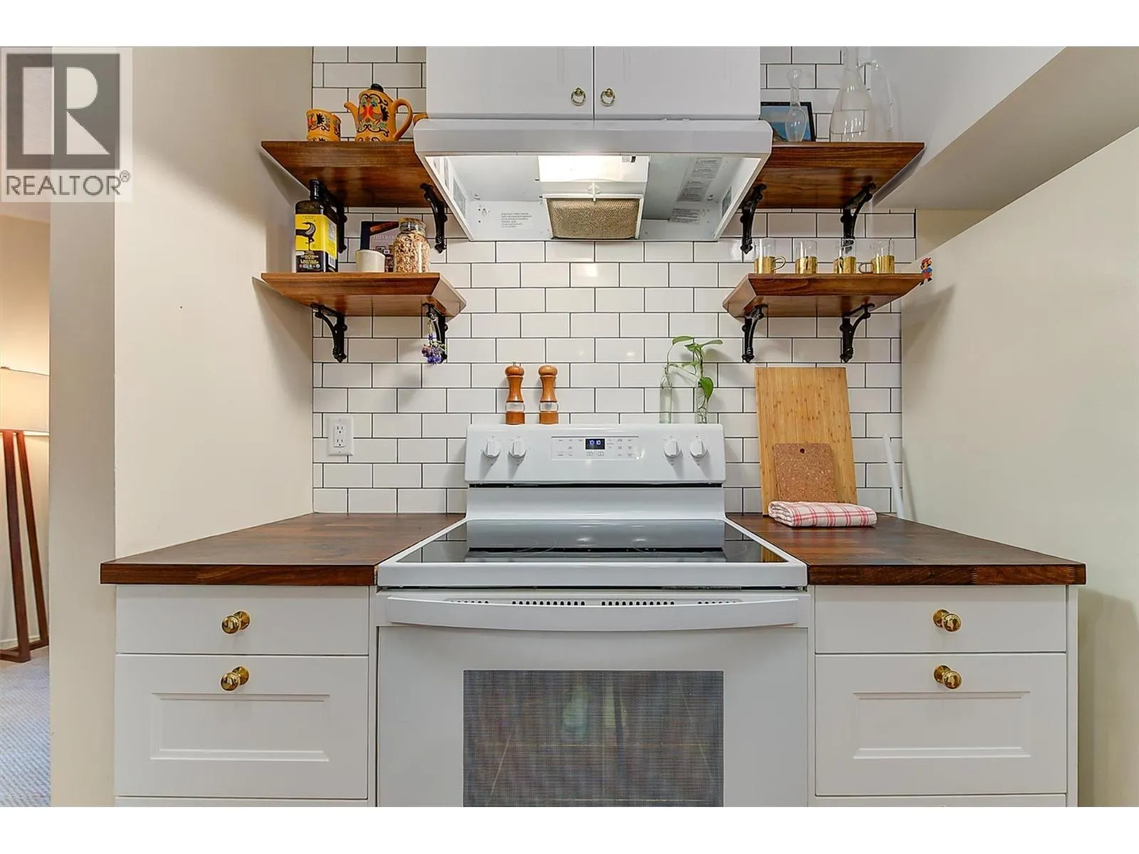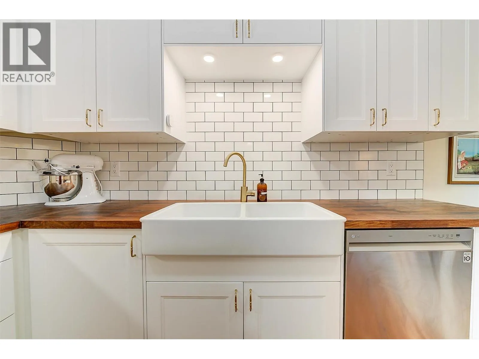 Renovated 2-Bedroom Condo on Prestigious Bernard Avenue. Discover modern living in this beautifully updated 1216 sq ft condo at 205-983 Bernard Ave. This bright, well-appointed unit combines tasteful upgrades with thoughtful design throughout. The completely renovated kitchen is a showstopper featuring crisp white shaker cabinets, rich butcher block countertops, subway tile backsplash, farmhouse sink, and brass fixtures. New Appliances were also installed during the renovation. The adjacent living room centers around a striking brick fireplace and flows seamlessly to your private covered balcony. Two generous bedrooms including a primary suite with balcony access and 4-piece ensuite. The main bathroom features a soaking tub with decorative tile surround. Multiple outdoor spaces include a covered balcony perfect for dining and entertaining, complete with overhead lighting and mature birch tree views. In-suite laundry room, abundant storage throughout, new terra cotta tile flooring in kitchen, hallways and bathrooms, with recently steam cleaned carpet in the bedrooms. Prime Bernard Avenue address puts you in the heart of Kelowna with easy access to downtown amenities, shopping, and services. This move-in ready unit offers the perfect blend of urban convenience and comfortable living. 2 dogs (20 inch height restriction at the shoulder) and 2 cats allowed. 1 Large Storage Locker included (id:27476)