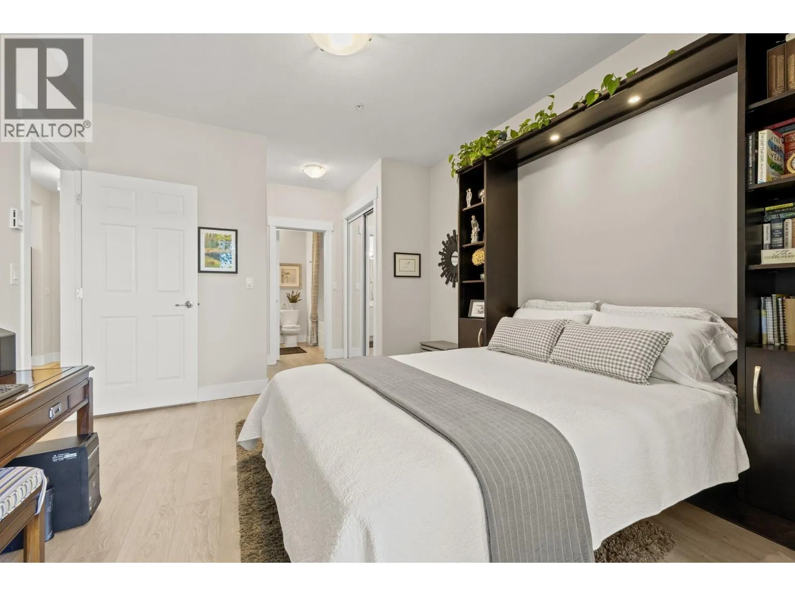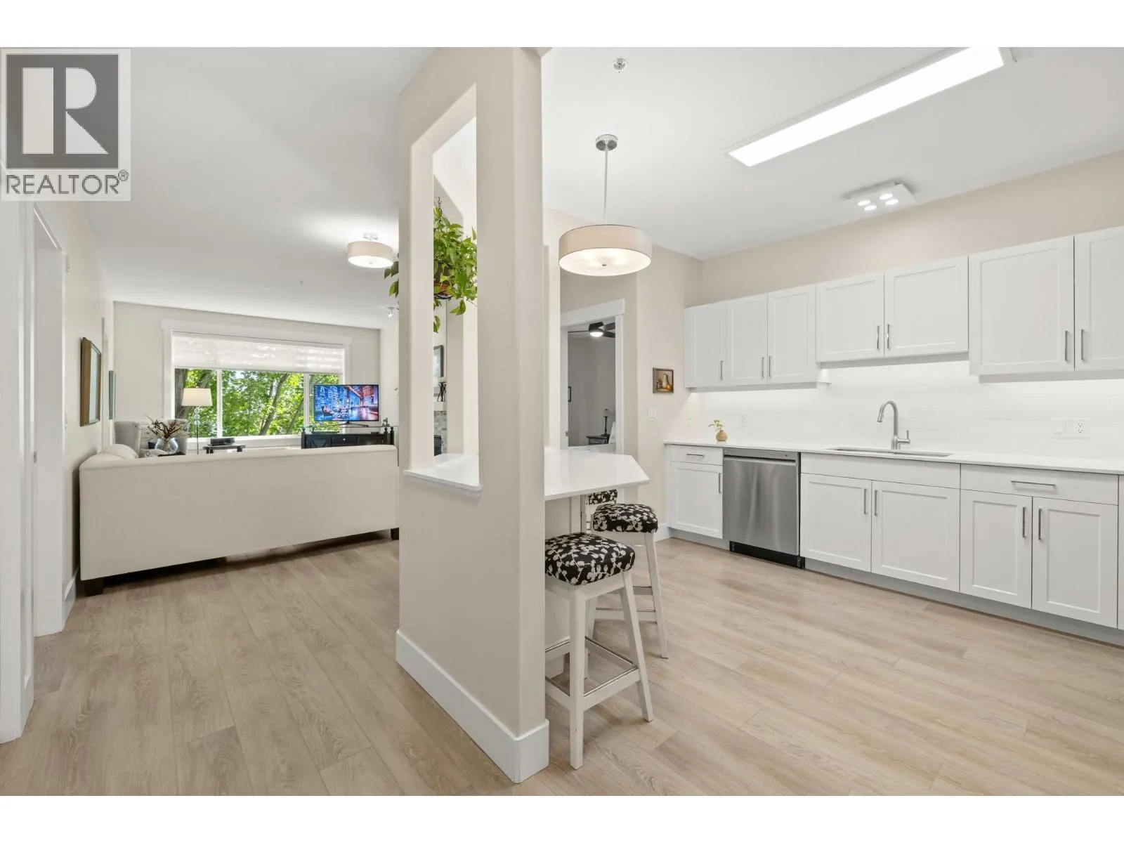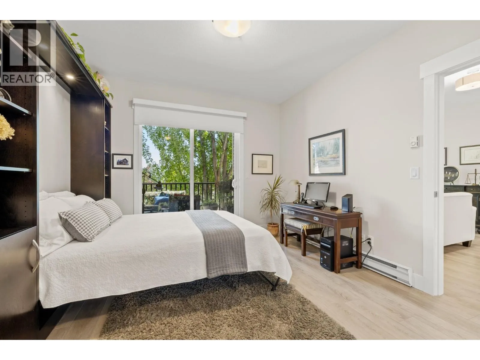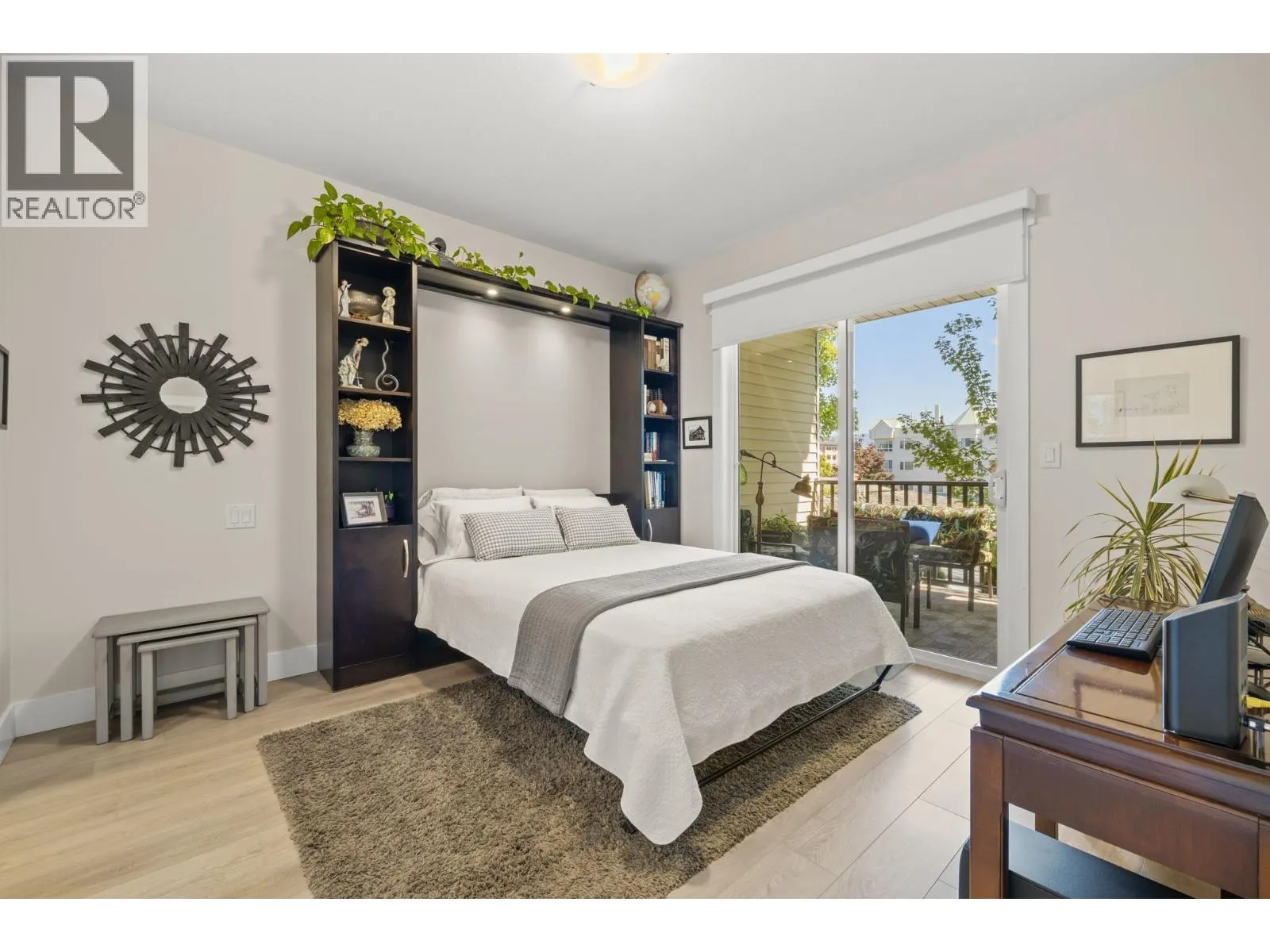 Bright and spacious 2 Bedroom, 2 Bathroom Condo featuring 9â ceilings with a desirable split bedroom layout and open concept design. Each bedroom offers its own private covered patio, perfect for morning coffee or quiet relaxation. With the open floor plan and big windows this unit feels very bright and welcoming with its cosy gas fireplace in the main living area. The kitchen is spacious and modern with quartz counter tops, under cabinet lighting, stainless steel appliances, including a gas range. Additional conveniences include in-suite laundry, Murphy bed, one dedicated parking stall, storage locker, bike storage & recycling bins in the garage. On the 1st and 2nd floors you will find a well equipped fitness room with access to a pool table and a lovely social room. Super location near Okanagan College, Kelowna Hospital, H2O fitness centre, Walking and Biking Trails, Schools Nearby, Good Bus Service and Great Shopping. (id:27476)