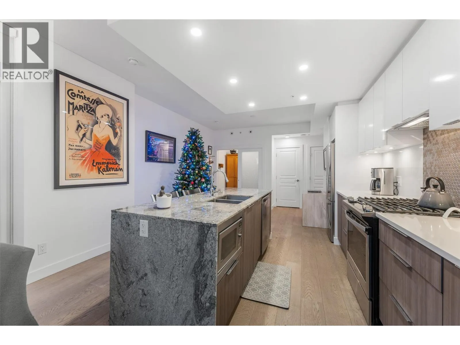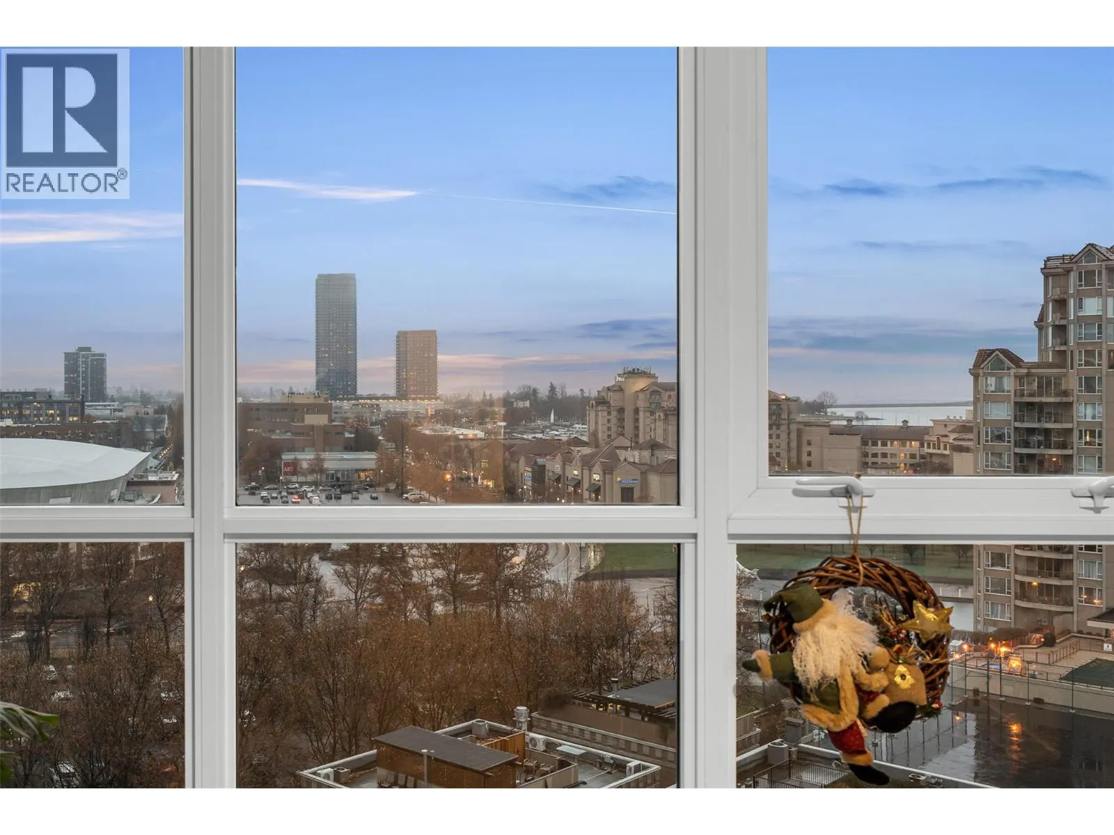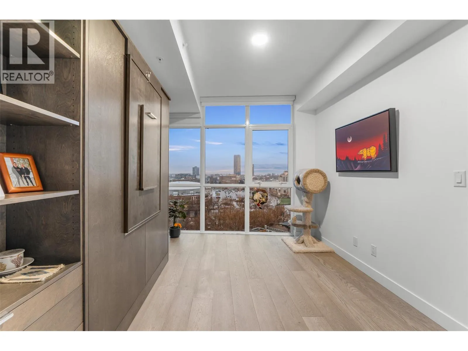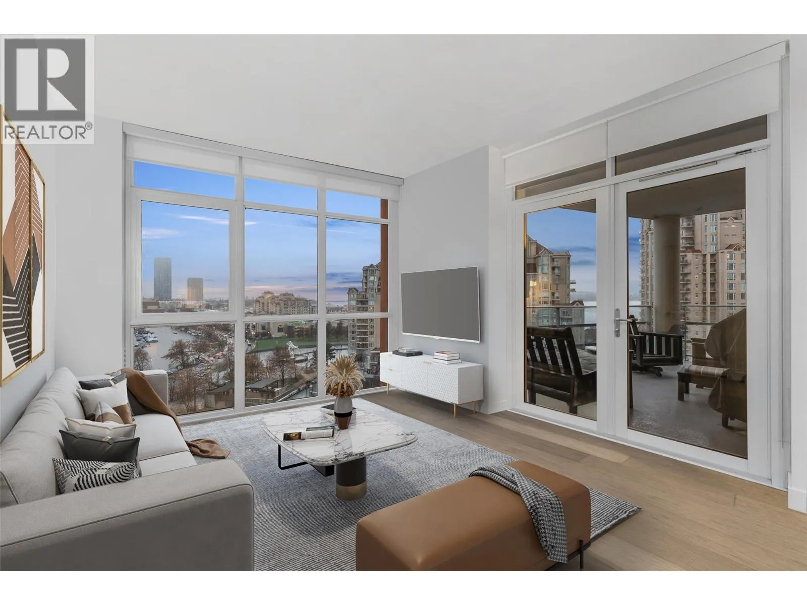 Beautifully updated 2 bedroom, 3 bath residence set in the heart of downtown Kelowna, just steps from the waterfront, dining and cultural amenities. Framed by floor-to-ceiling windows, the home captures sweeping views of the lake, bridge, mountains and city skyline, creating an effortless connection to the Okanagan lifestyle. Thoughtfully updated in 2020, the home features custom closets, a redesigned pantry, modern Murphy bed with integrated desk, and new washer/dryer. Lutron smart lighting enhances the ambiance throughout. The contemporary kitchen is a standout with quartz countertops, a waterfall-edge island with seating for 4, soft-close two-tone cabinetry, and premium Whirlpool appliances including a gas range. The open-concept living and dining area flows seamlessly to a generous covered deck, an exceptional outdoor extension with gas, power, and panoramic views. The primary suite offers private deck access, a custom walk-in closet, and a spa-inspired 5-piece ensuite with a freestanding tub positioned before a wall of glass. A well-appointed guest suite includes a walk-through closet and its own 4-piece bath. A sliding-door den, ample in-suite storage, and central A/C add to the comfort. Residents enjoy access to various amenities including a plunge pool, gym, and meeting room. 2 parking stalls. With its refined finishes, thoughtful upgrades, and unmatched walkability, this home offers the best of downtown living paired with gorgeous Okanagan views. (id:27476)