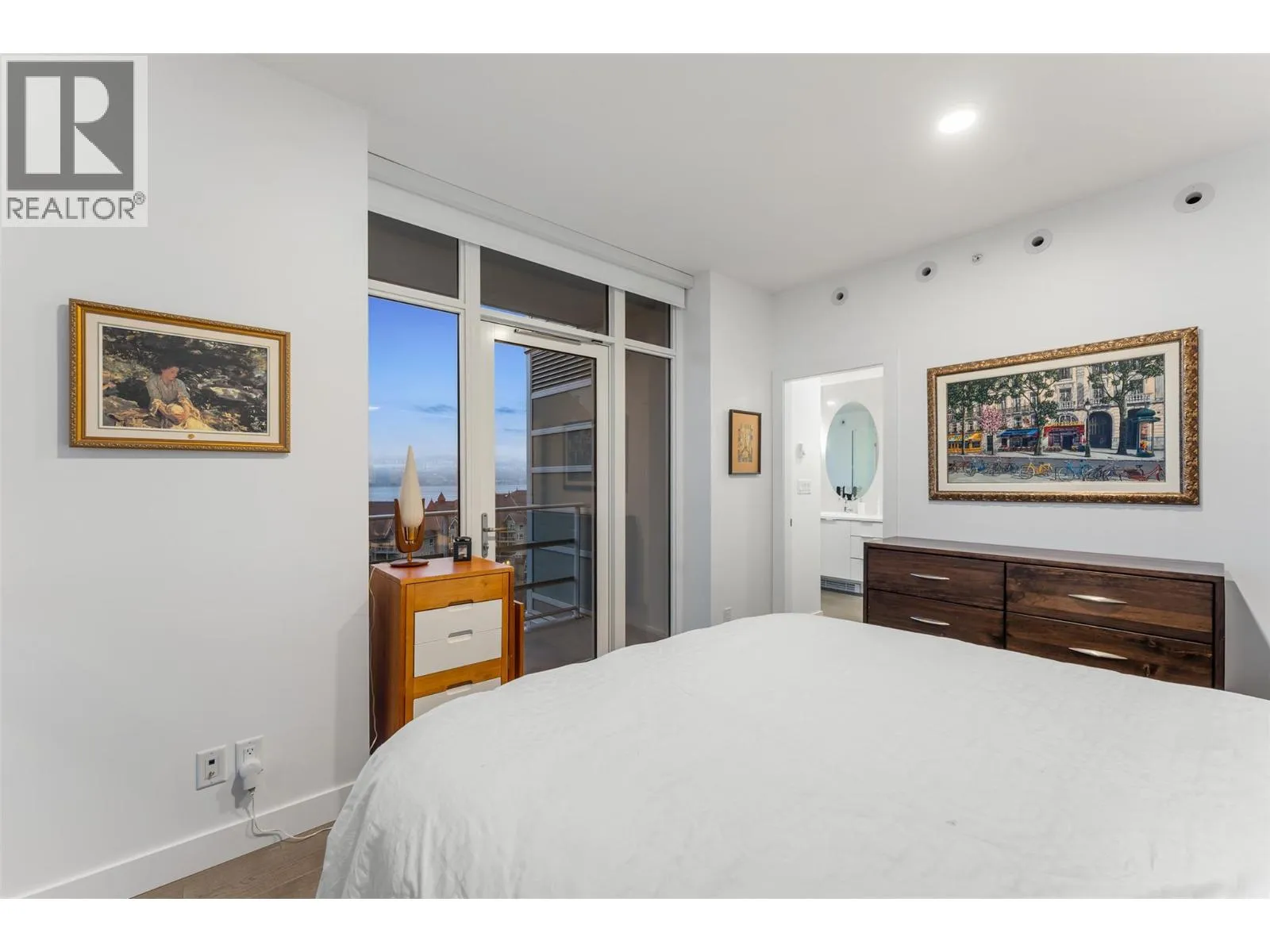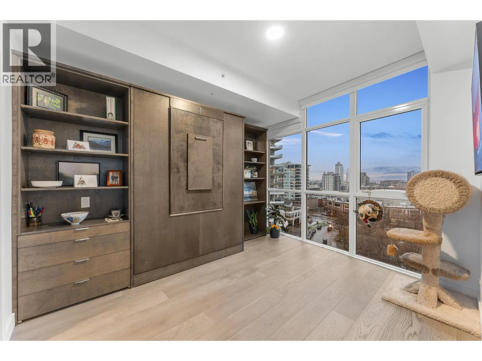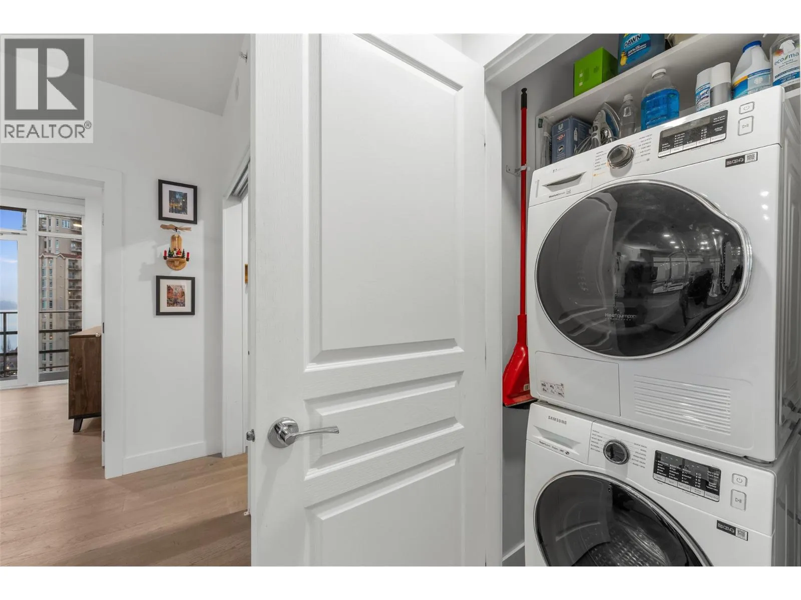 Beautifully updated 2 bedroom, 3 bath residence set in the heart of downtown Kelowna, just steps from the waterfront, dining and cultural amenities. Framed by floor-to-ceiling windows, the home captures sweeping views of the lake, bridge, mountains and city skyline, creating an effortless connection to the Okanagan lifestyle. Thoughtfully updated in 2020, the home features custom closets, a redesigned pantry, modern Murphy bed with integrated desk, and new washer/dryer. Lutron smart lighting enhances the ambiance throughout. The contemporary kitchen is a standout with quartz countertops, a waterfall-edge island with seating for 4, soft-close two-tone cabinetry, and premium Whirlpool appliances including a gas range. The open-concept living and dining area flows seamlessly to a generous covered deck, an exceptional outdoor extension with gas, power, and panoramic views. The primary suite offers private deck access, a custom walk-in closet, and a spa-inspired 5-piece ensuite with a freestanding tub positioned before a wall of glass. A well-appointed guest suite includes a walk-through closet and its own 4-piece bath. A sliding-door den, ample in-suite storage, and central A/C add to the comfort. Residents enjoy access to various amenities including a plunge pool, gym, and meeting room. 2 parking stalls. With its refined finishes, thoughtful upgrades, and unmatched walkability, this home offers the best of downtown living paired with gorgeous Okanagan views. (id:27476)