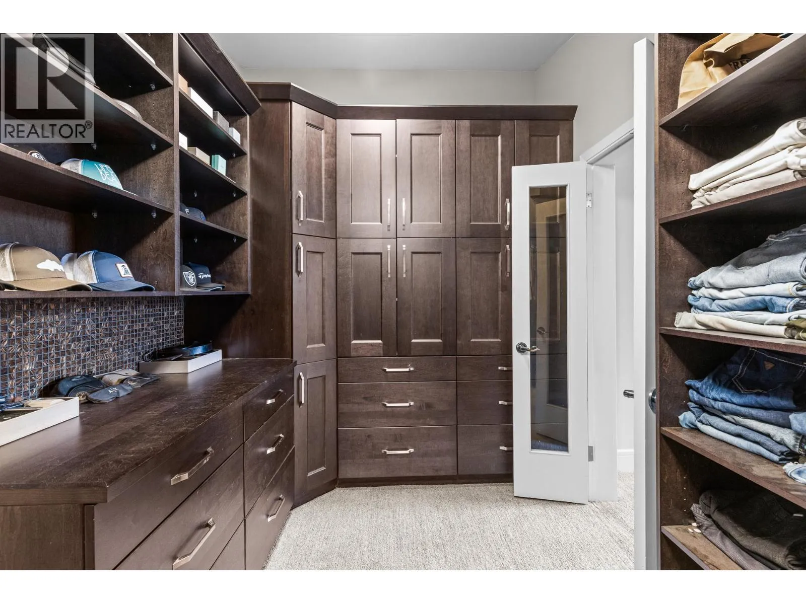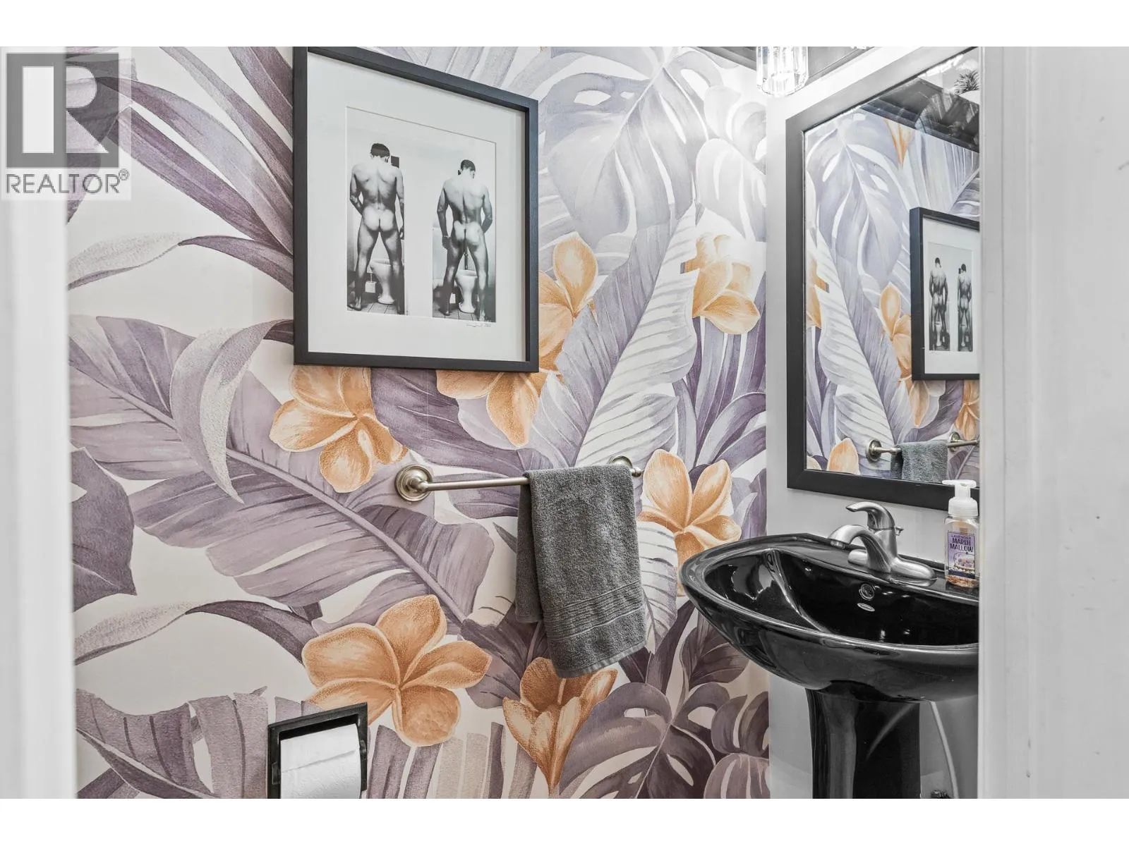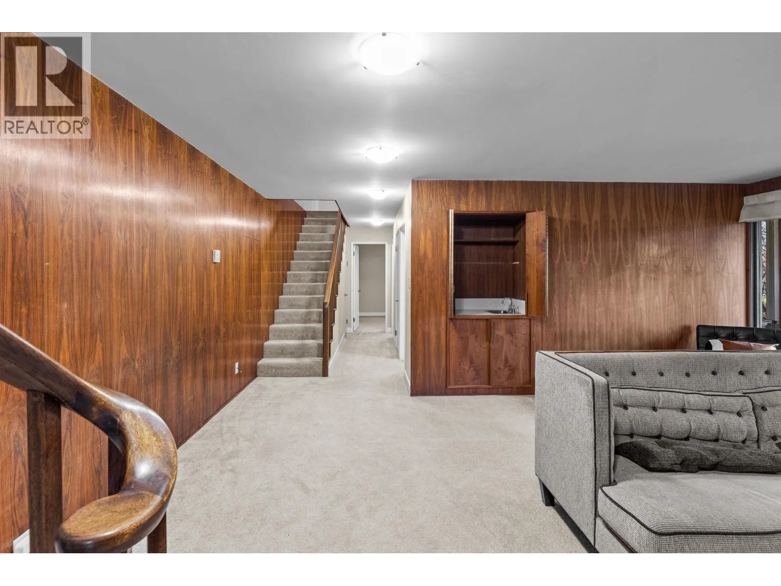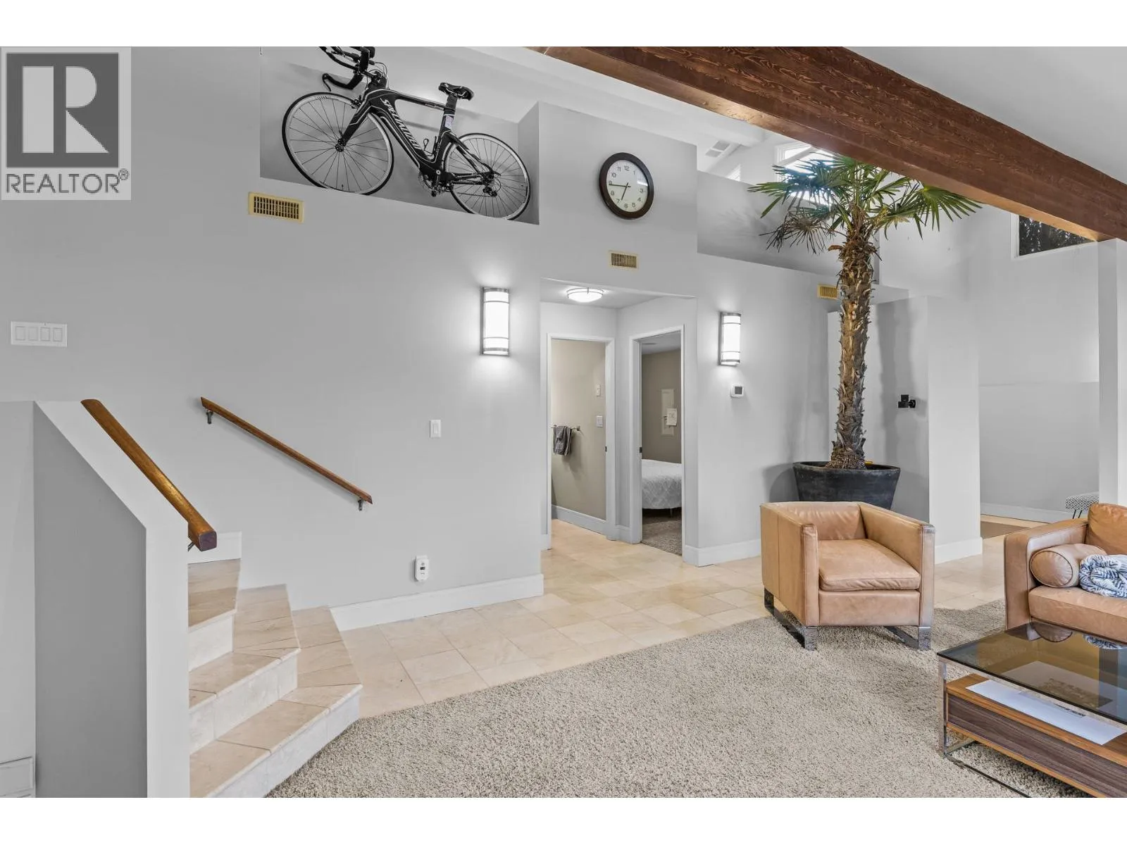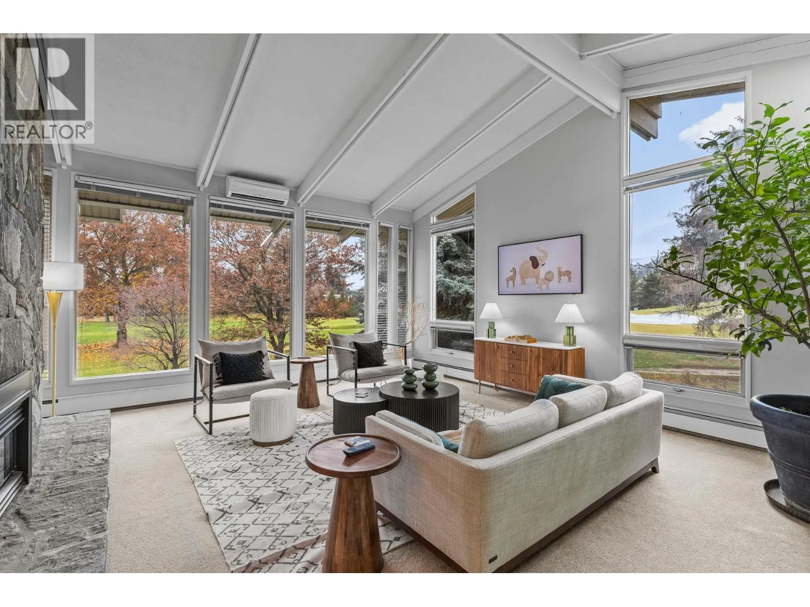 Rare opportunity to own a private home backing directly onto the Kelowna Golf & Country Club. This 4,628 sq. ft. West Coast contemporary home is set on one of Kelownaâs most desirable and tightly held streets with it's central location and great golf course views. This home has been beautifully maintained and features exposed natural wood beams, a floor-to-ceiling rock faced fireplace, and abundant south-facing windows that capture natural light and peaceful golf course views. The main level offers a spacious primary bedroom with a full ensuite and walk-in closet, an additional bedroom, an office/den (currently used as a bedroom) a full bathroom, and a powder room. The kitchen and dining areas open onto a covered deck with natural gas hookups, perfect for year-round outdoor entertaining. A bright loft overlooks the main living area and provides a great flex space for an office or additional lounge. The fully finished walkout lower level includes a large family room, rec room, bedroom, full bath, laundry, and direct access to the covered patio and private yard. Updates include a newer kitchen and 50-year architectural shingles. An attached double garage completes this exceptional property along with plenty of outdoor parking spots. Enjoy the close proximity to all of Kelowna and the privacy and views created by backing onto the golf course on a no through road. A truly special offering on the Kelowna Golf & Country Club. (id:27476)