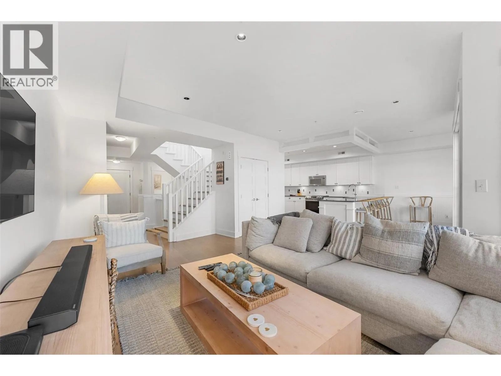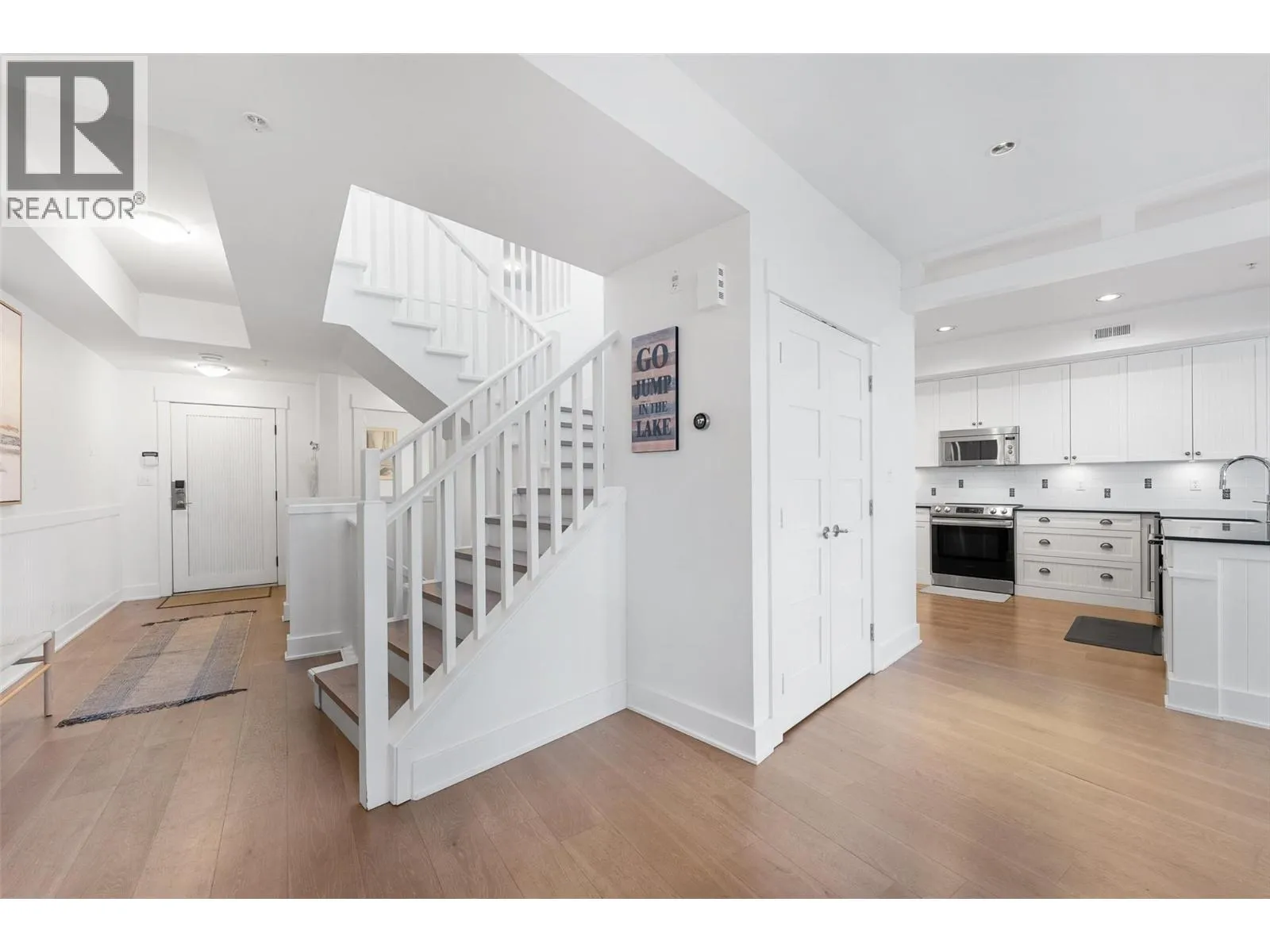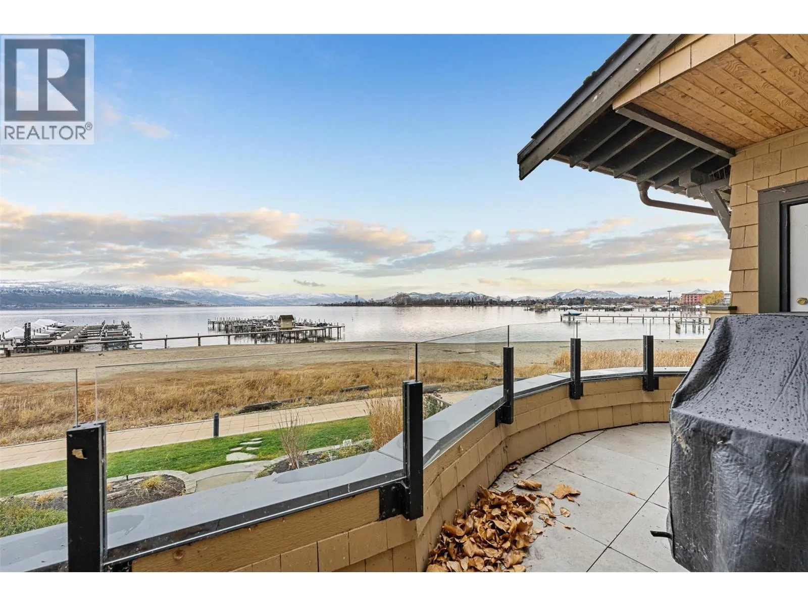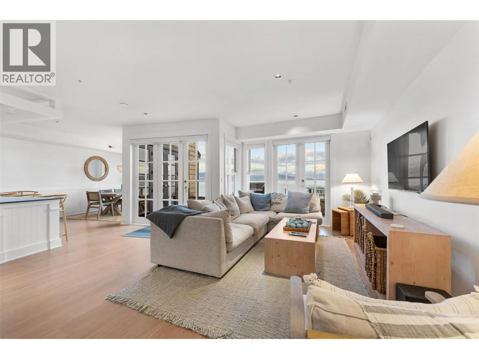 Experience true waterfront living at Mission Shores in this light-filled 3-bedroom, 4-bath townhome set along one of Kelownaâs most sought-after stretches of Lake Okanagan. Blending a refined beach-house feel with front-row views, this spacious residence offers bright, open-concept living and seamless indoorâoutdoor flow. The main level features wide-plank hardwood floors, high ceilings, and a kitchen with a large quartz peninsula island, shaker cabinetry, and premium appliances. The dining and living areas open through French doors to a generous lakeview deck with gas BBQ hookup perfect for sunset gatherings. A private main-floor bedroom with ensuite is ideal for guests. Upstairs, the lakeview primary retreat impresses with vaulted ceilings, walk-in closet, 5-piece ensuite, and access to a private deck overlooking the shoreline. A second upper-level bedroom offers vaulted ceilings, walk-in closet, and its own 3-piece ensuite. A bright landing with a large skylight fills the home with natural light. Additional features include two parking spots, two private entrances, one directly from the garage, ample storage, gated courtyard entry, and in-unit laundry. A dedicated 8,000 lb. boat slip (#26) completes this exceptional offering. Residents of Mission Shores enjoy a lakeside pool and hot tub, fitness centre, meeting room, and beautifully landscaped paths just steps to the beach, restaurants, and all Lower Mission amenities. (id:27476)