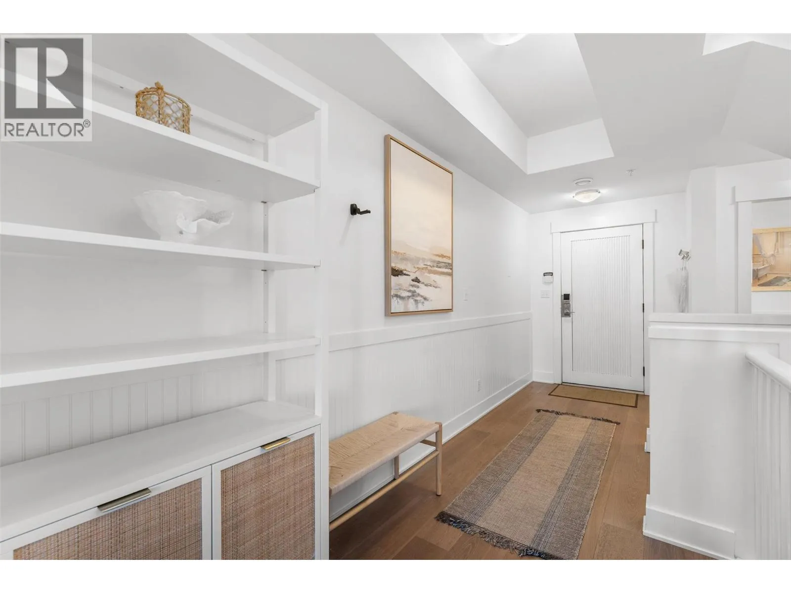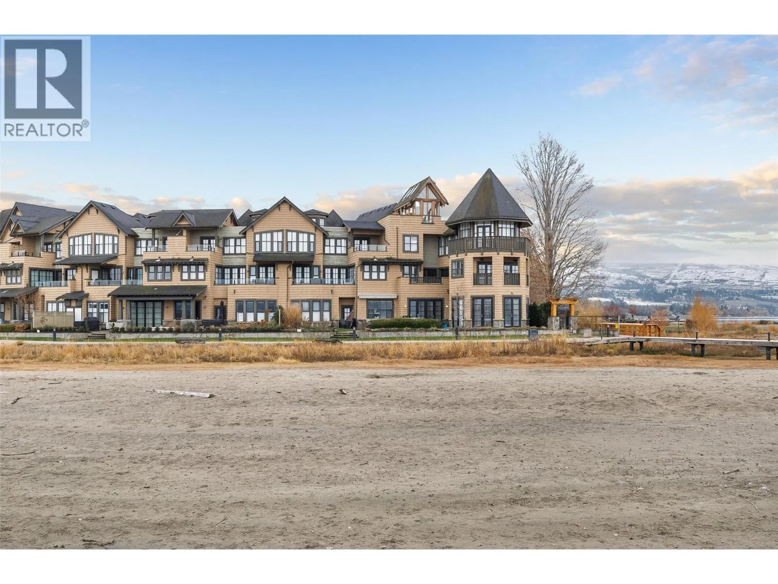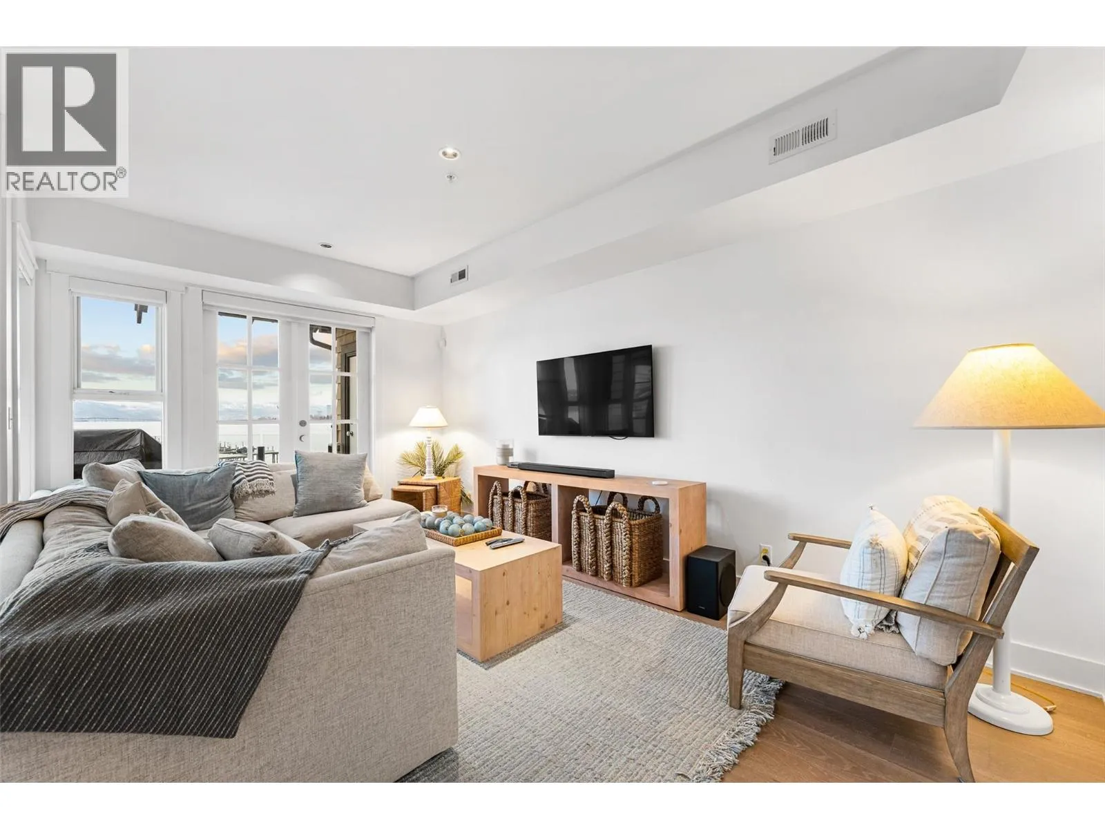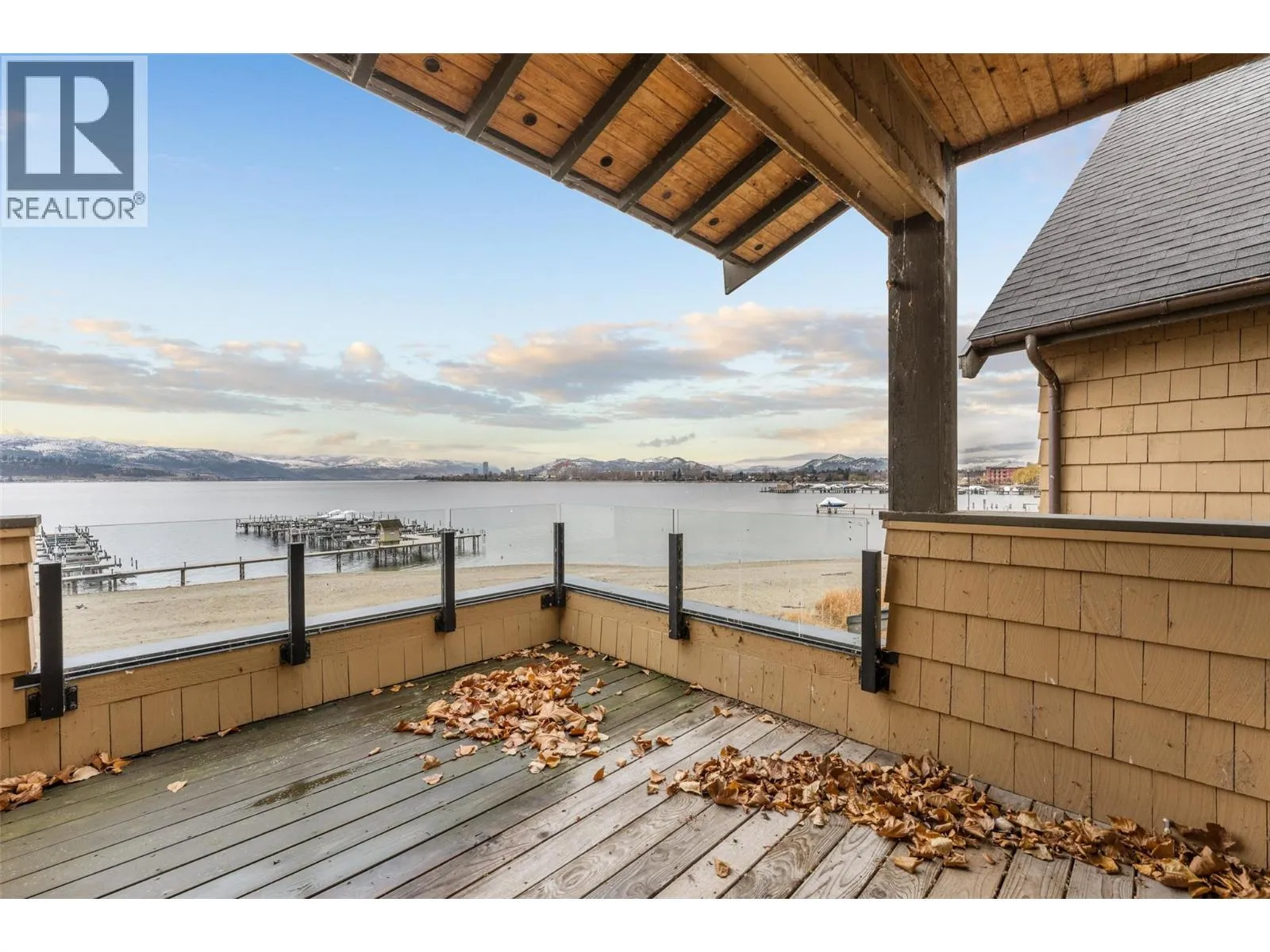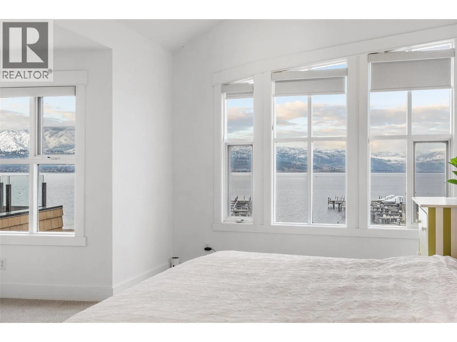 Experience true waterfront living at Mission Shores in this light-filled 3-bedroom, 4-bath townhome set along one of Kelownaâs most sought-after stretches of Lake Okanagan. Blending a refined beach-house feel with front-row views, this spacious residence offers bright, open-concept living and seamless indoorâoutdoor flow. The main level features wide-plank hardwood floors, high ceilings, and a kitchen with a large quartz peninsula island, shaker cabinetry, and premium appliances. The dining and living areas open through French doors to a generous lakeview deck with gas BBQ hookup perfect for sunset gatherings. A private main-floor bedroom with ensuite is ideal for guests. Upstairs, the lakeview primary retreat impresses with vaulted ceilings, walk-in closet, 5-piece ensuite, and access to a private deck overlooking the shoreline. A second upper-level bedroom offers vaulted ceilings, walk-in closet, and its own 3-piece ensuite. A bright landing with a large skylight fills the home with natural light. Additional features include two parking spots, two private entrances, one directly from the garage, ample storage, gated courtyard entry, and in-unit laundry. A dedicated 8,000 lb. boat slip (#26) completes this exceptional offering. Residents of Mission Shores enjoy a lakeside pool and hot tub, fitness centre, meeting room, and beautifully landscaped paths just steps to the beach, restaurants, and all Lower Mission amenities. (id:27476)