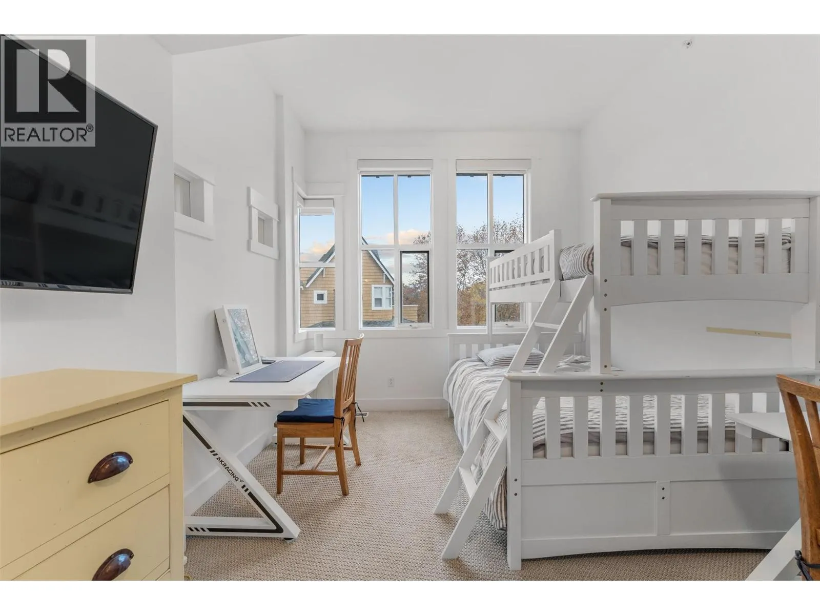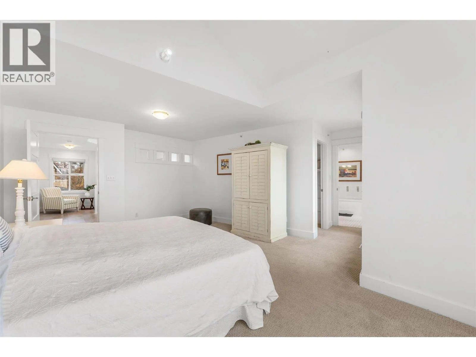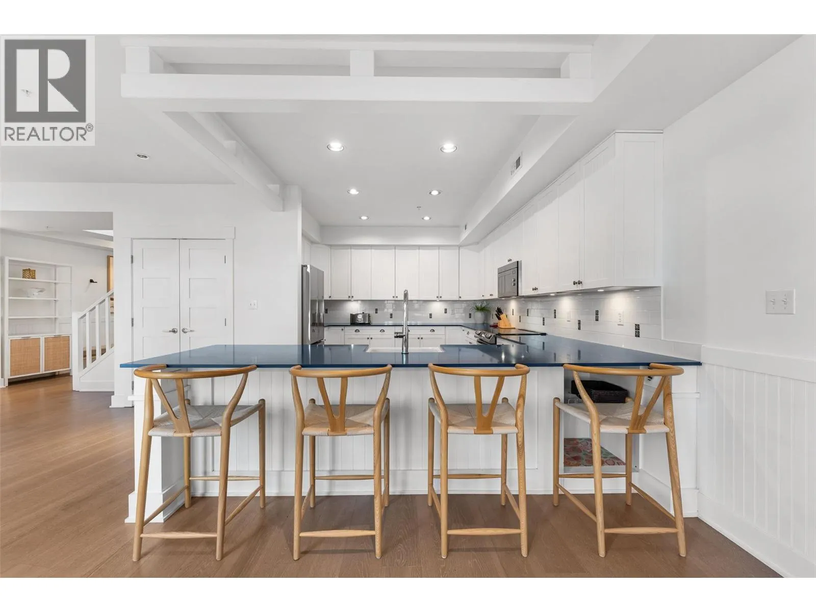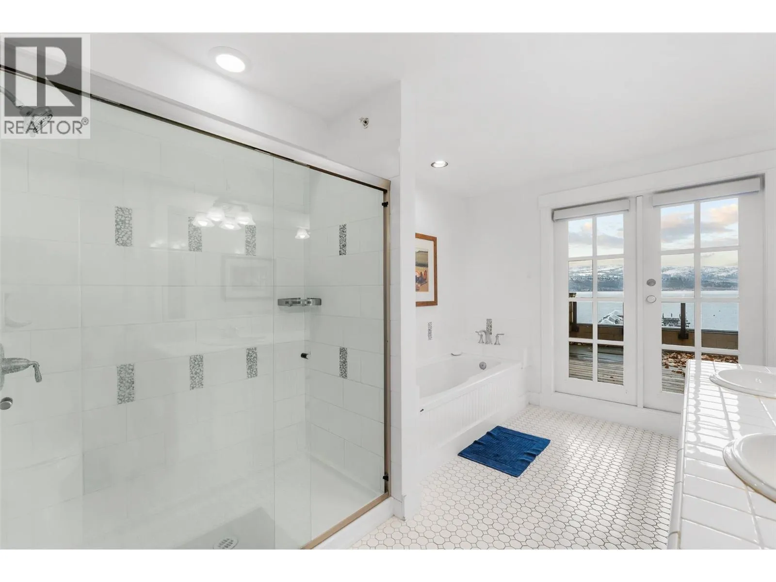Experience true waterfront living at Mission Shores in this light-filled 3-bedroom, 4-bath townhome set along one of Kelownaâs most sought-after stretches of Lake Okanagan. Blending a refined beach-house feel with front-row views, this spacious residence offers bright, open-concept living and seamless indoorâoutdoor flow. The main level features wide-plank hardwood floors, high ceilings, and a kitchen with a large quartz peninsula island, shaker cabinetry, and premium appliances. The dining and living areas open through French doors to a generous lakeview deck with gas BBQ hookup perfect for sunset gatherings. A private main-floor bedroom with ensuite is ideal for guests. Upstairs, the lakeview primary retreat impresses with vaulted ceilings, walk-in closet, 5-piece ensuite, and access to a private deck overlooking the shoreline. A second upper-level bedroom offers vaulted ceilings, walk-in closet, and its own 3-piece ensuite. A bright landing with a large skylight fills the home with natural light. Additional features include two parking spots, two private entrances, one directly from the garage, ample storage, gated courtyard entry, and in-unit laundry. A dedicated 8,000 lb. boat slip (#26) completes this exceptional offering. Residents of Mission Shores enjoy a lakeside pool and hot tub, fitness centre, meeting room, and beautifully landscaped paths just steps to the beach, restaurants, and all Lower Mission amenities. (id:27476)