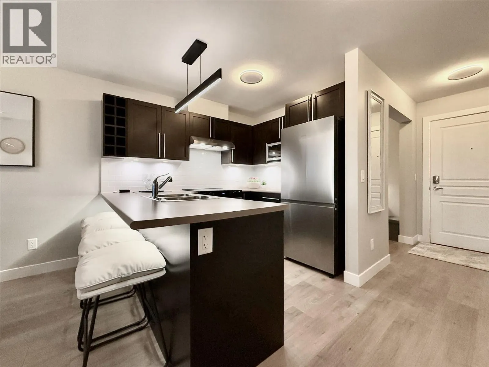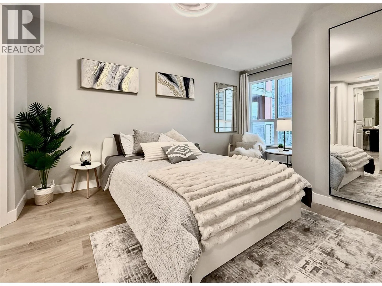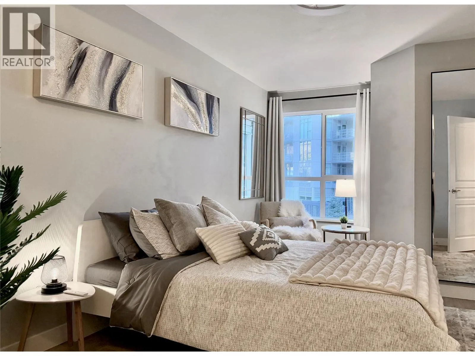 FULLY FURNISHED + ACCESSORIES AND MORE! Unpack your bags and move right into this fully furnished, completely renovated executive condo offering the largest floor plan in its class, featuring an oversized bedroom with extra sitting area plus a versatile bonus room. Located in the highly sought-after Waterscapes resort-style community, youâre steps to restaurants, bars, shopping, and the cultural district, while enjoying premium finishes, accessories, and appliances throughout. Highlights include a new 55â Samsung âThe Frameâ 4K TV, new Samsung S/S appliances, upgraded flooring, dimmable & tuneable lighting, a flush-mount bedroom ceiling fan, Whirlpool washer and dryer, Blackout curtains, new patio furniture with planter boxes, premium linens, queen bed, and an extensive collection of new furniture, decor, artwork, and accessories (all items in photos included, excluding laptop). Residents enjoy exceptional amenities including a hotel-style pool, two hot tubs (one heated year-round), a fully equipped fitness centre, and the Cascade Lounge with billiards, fireplace, BBQs, and more, this building is directly connected to the amenities so no need to go outside. The 735 sq. ft. condo also offers underground parking next to the elevator, a fully covered balcony with propane BBQ, A/C, espresso kitchen cabinetry, oversized bedroom with walk-in closet, office-style bonus room (or guest space), shower/tub combo, pet-friendly, storage lockers, and underground EV charging stations. (id:27476)