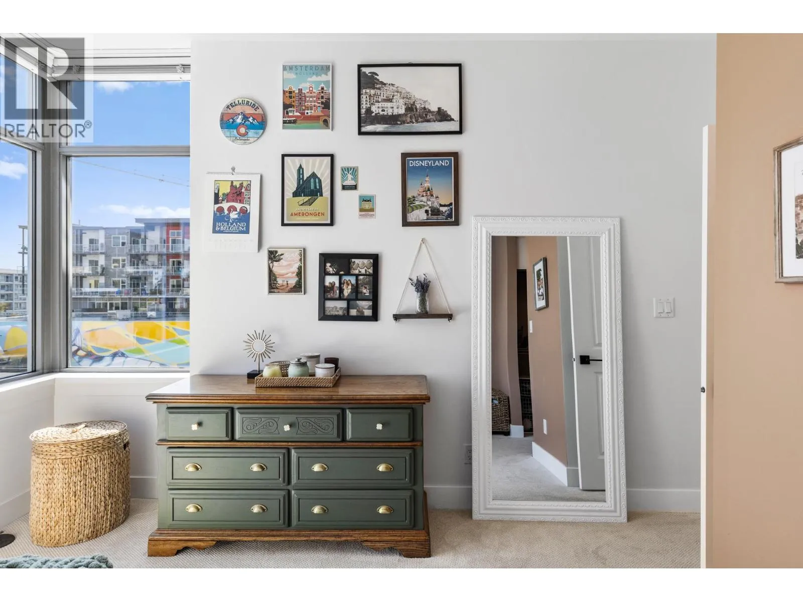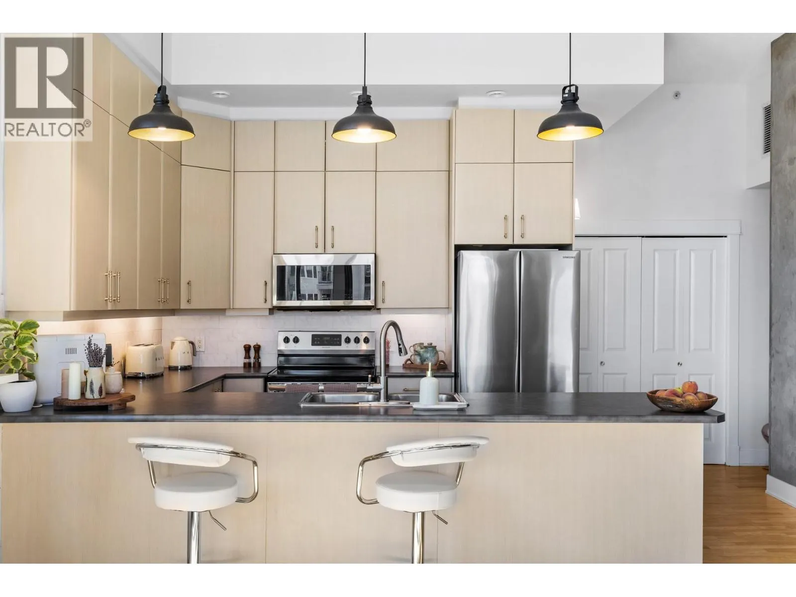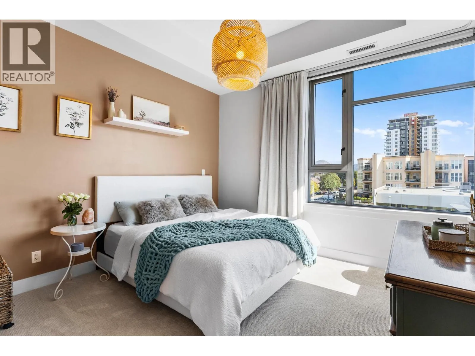 Step into a stylish new lifestyle in one of Kelownaâs most sought-after concrete high-rises. This architecturally striking one-bedroom plus den, 1.5-bath home is among the largest one-bedroom layouts in the city, designed to impress with its soaring 11-foot ceilings and oversized SE facing windows that flood the home w/ sunlight and frame views of the city & mountains. The generous size, natural light, and modern aesthetic make this home truly stand out. Recently updated from top to bottom; with newer appliances, heating & cooling system, renovated bathrooms with sleek Dekton countertops, new carpet in the bedroom, fresh paint, and updated lighting. Exposed concrete features highlight the buildingâs original architecture while lending a unique, modern edge. The open layout flows seamlessly, with a spacious den large enough to serve as a home office, dining room, or guest space. Step onto your private balcony with a gas hookup, perfect for summer barbecues and enjoy the peace of the quiet side of the building while being only steps from the vibrancy of Kelownaâs Cultural District. Entertainment venues, dining, cafes, pilates studios, and galleries are right outside your door, with the lakefront and upcoming UBCO downtown campus just steps away. The building offers a fitness room, secure bike storage, a storage locker, underground parking, and lounge that opens onto a social deck for private gatherings or community events. Bring your furry friends 2 cats are permitted. (id:27476)