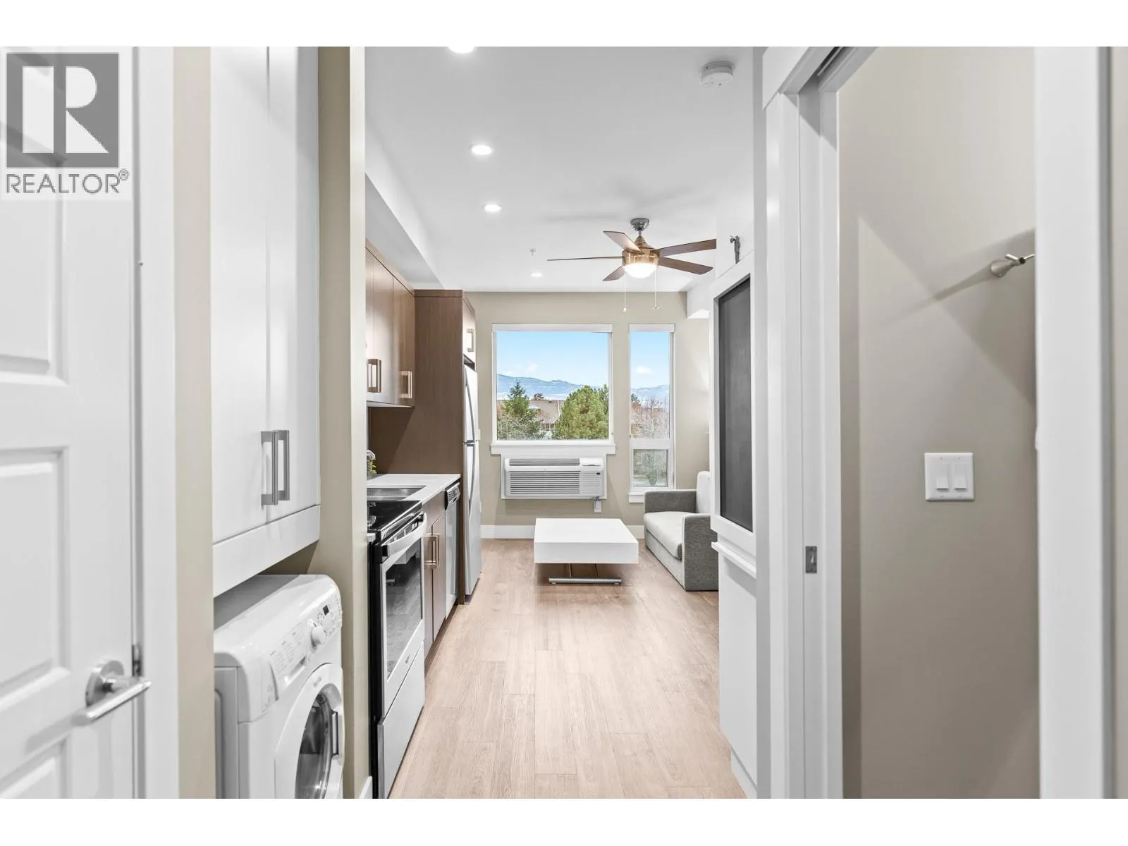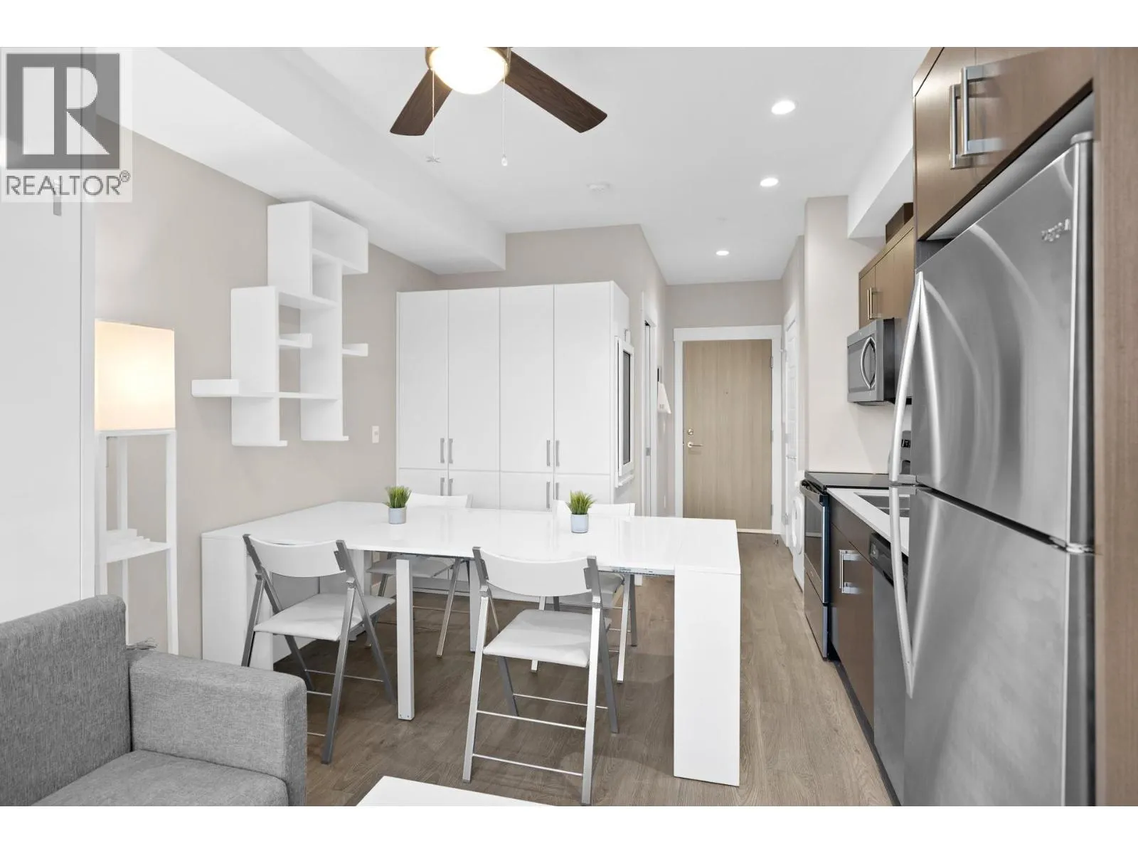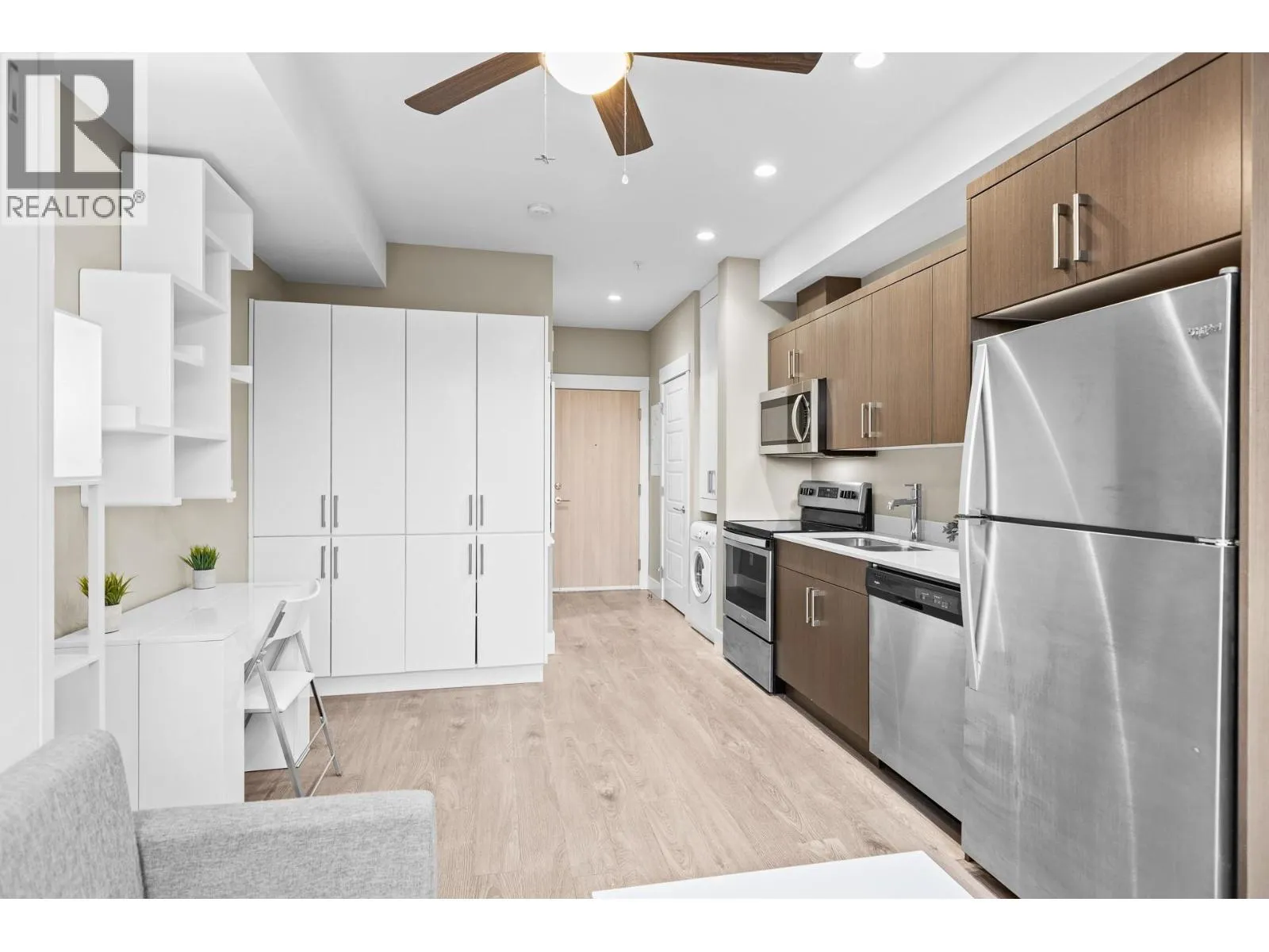 Welcome to Cambridge House - offering exceptional urban convenience in the heart of Kelowna. This 319 sq ft south-facing micro suite has been thoughtfully upgraded to maximize function and comfort featuring a custom Murphy Bed and built-in storage. The home is freshly painted and offered fully furnished, including sofa, TV, standing lamps, desk, chairs, and more, providing a turnkey living opportunity for owners or investors. The efficient layout includes stainless steel appliances, durable vinyl plank flooring, an in-suite washer/dryer, a 3-piece bathroom, and an in-wall heat pump/AC unit for year-round climate control. A covered parking stall and convenient same-floor 3' x 4' storage locker are included. Residents of Cambridge House enjoy an impressive selection of amenities, including a fully equipped fitness centre, residentsâ lounge with games and seating areas and a landscaped garden terrace with BBQ area. The building is also pet-friendly (up to two pets, max 25 lbs each). Located steps from downtown, transit, and everyday amenities, this property appeals to first-time buyers, students, and investors seeking low-maintenance living in a central location. (id:27476)