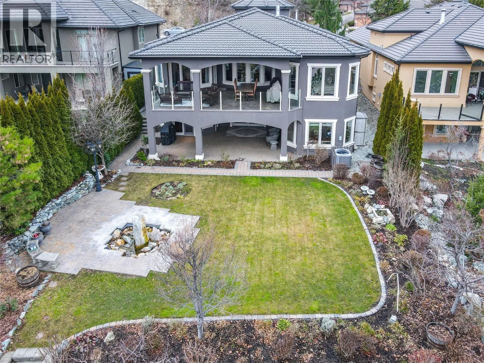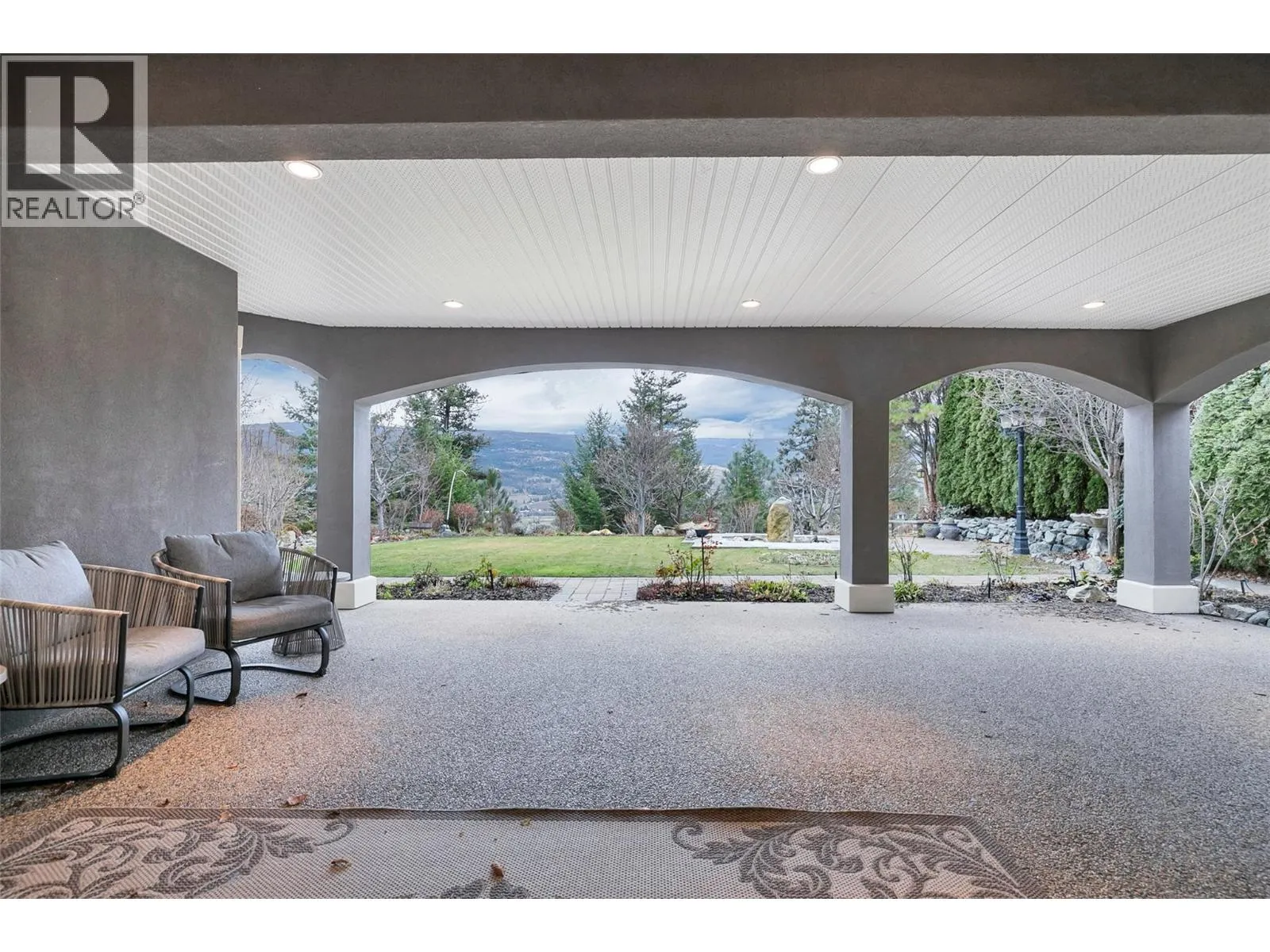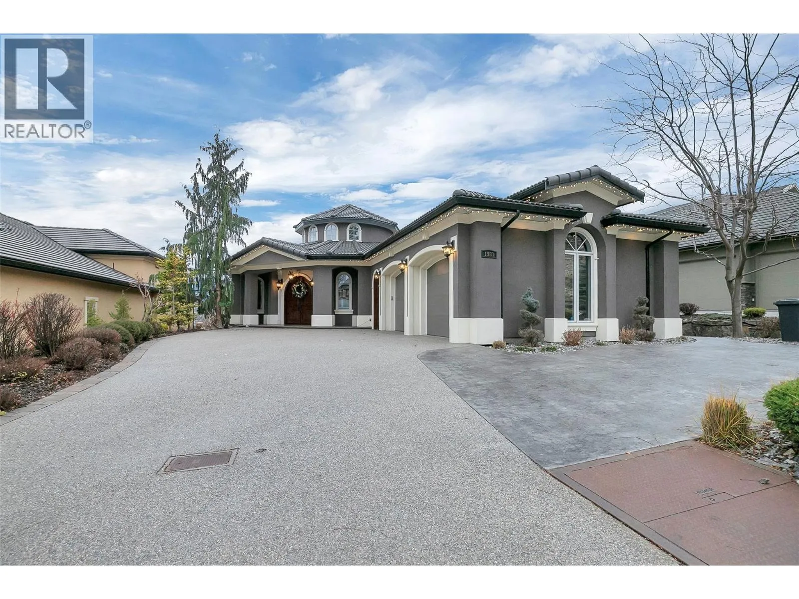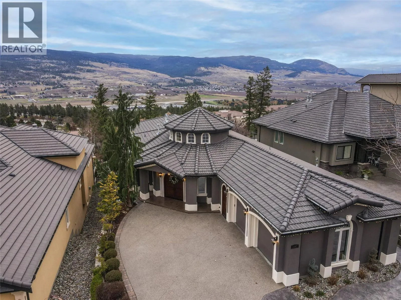 Welcome to an exceptional residence where timeless elegance meets breathtaking scenery. Enter through the grand rotunda foyer and be immediately drawn into the expansive living room, an architectural showpiece with high ceilings and walls of windows framing uninterrupted valley and mountain views. Designed for both refined entertaining and everyday luxury, the chefâs kitchen is a true centerpiece featuring an oversized island and stainless steel appliances. The adjoining dining room easily accommodates large gatherings while enjoying stunning outlooks. The primary suite is a private retreat offering walk-out access, sweeping vistas, and a spa-inspired ensuite finished in granite and tile, complete with a Jacuzzi soaker tub, bidet, and walk-in closet, creating an ideal sanctuary at dayâs end. A dedicated office and a second bedroom or guest suite with a multi-jetted shower complete the upper level. A curved custom staircase leads to the finished walk-out lower level, offering a spacious recreation room, entertainment kitchen and bar, theatre room, gym space, two additional bedrooms, and a full bathroom. Outdoors, covered patios and a fountain-accented backyard provide the perfect setting for entertaining or quiet relaxation. Ideally located near golf courses like The Okanagan Golf Club, parks and trails, and everyday amenities, with convenient access to YLW, this home offers luxury, scale, and unforgettable views in a highly sought-after setting. Make it yours today! (id:27476)