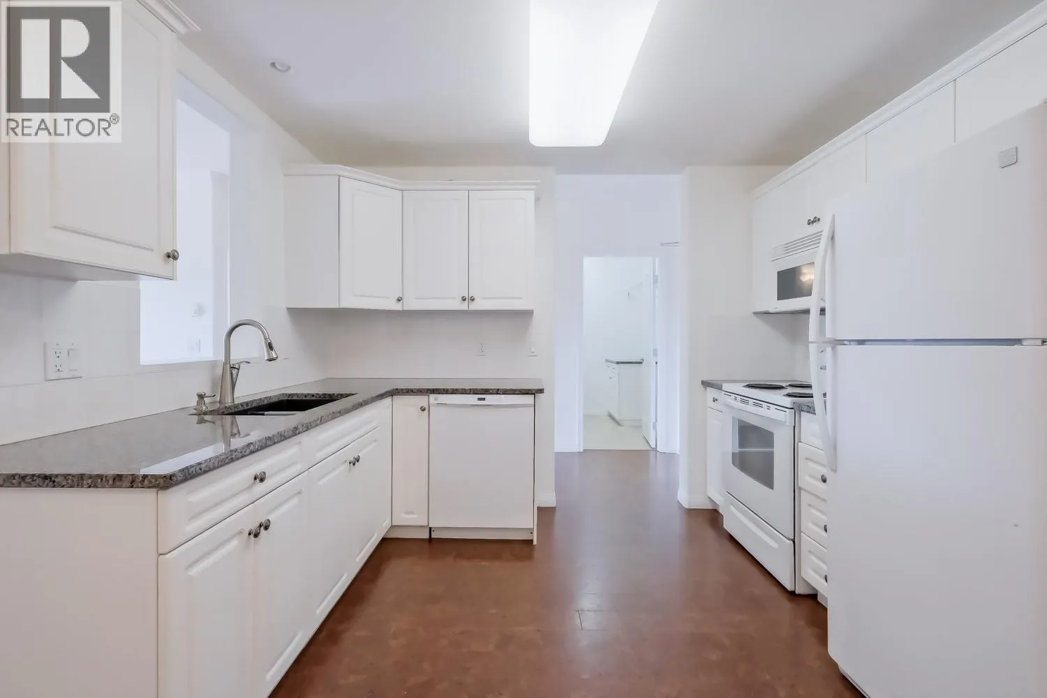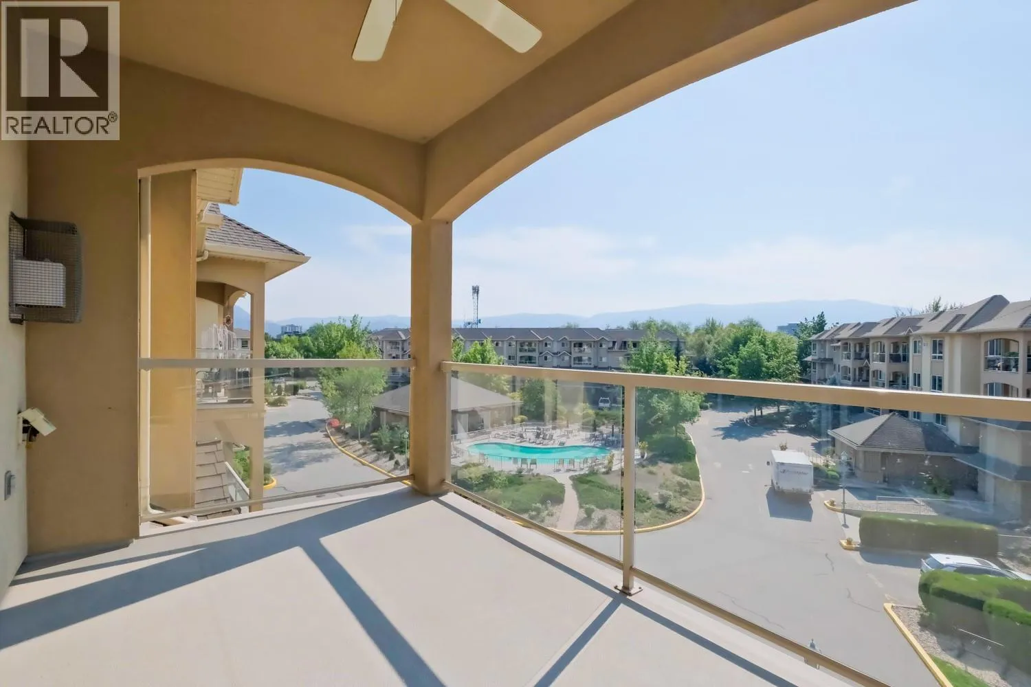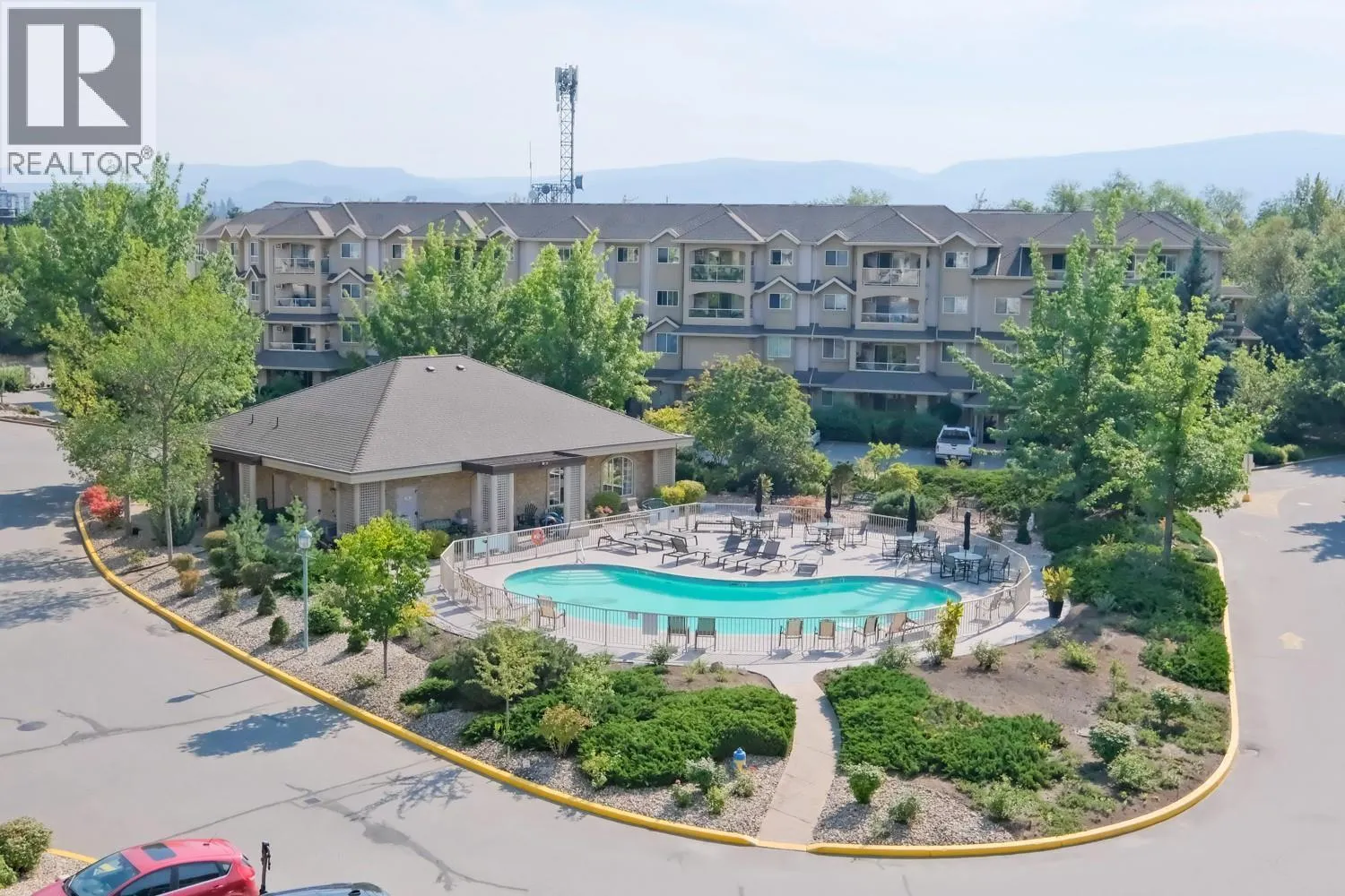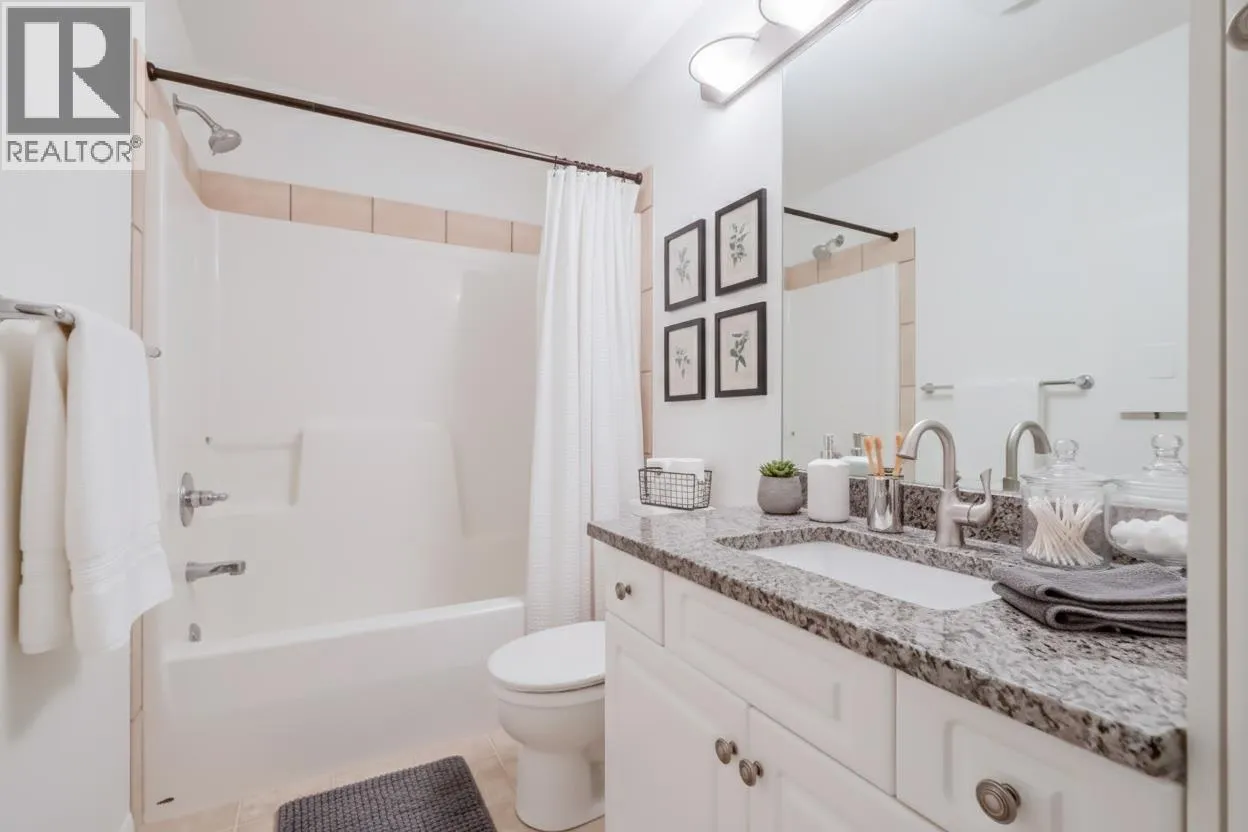 TOP FLOOR! Enjoy beautiful views of the pool and mountains from your covered balcony. The perfect spot for your morning coffee in the sunshine. This 2-bedroom, 2-bathroom condo offers a desirable split-bedroom layout for added privacy. The kitchen and bathrooms feature granite countertops, complemented by fresh paint throughout and a newer A/C unit. The spacious primary bedroom includes a full ensuite with double closets. Cozy up to the warmth of your gas fireplace in the winter or host endless barbeques in the summer, with gas conveniently included in your strata fees. Additional perks include a storage locker located just down the hall and a dedicated bicycle/tire storage room in the underground parkade. Meadowbrook is sought after for its resort feel. Whether you like lounging poolside in the sun or having some laughs over a game of pool with friends in the newly remodelled clubhouse, it's a perfect place to call home. Amongst the amenities are 3 guests suites with low nightly rates. Meadowbrook is centrally located, just a stoneâs throw away from transit, shopping, recreation & the rail trail. (id:27476)