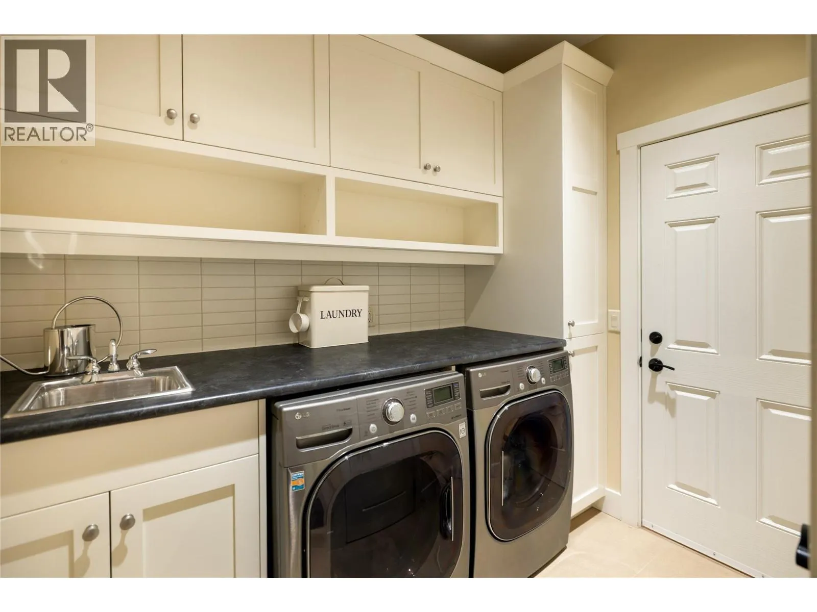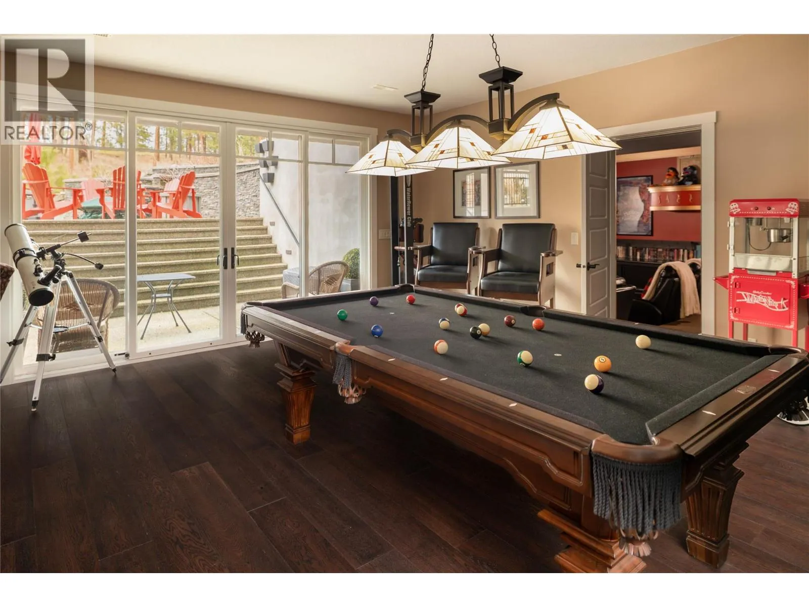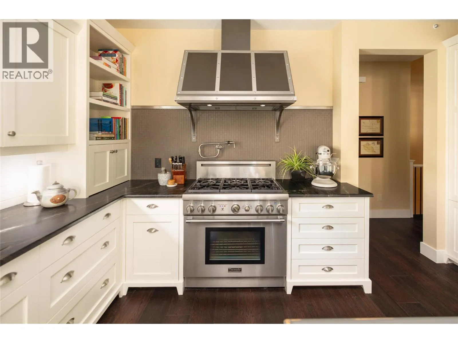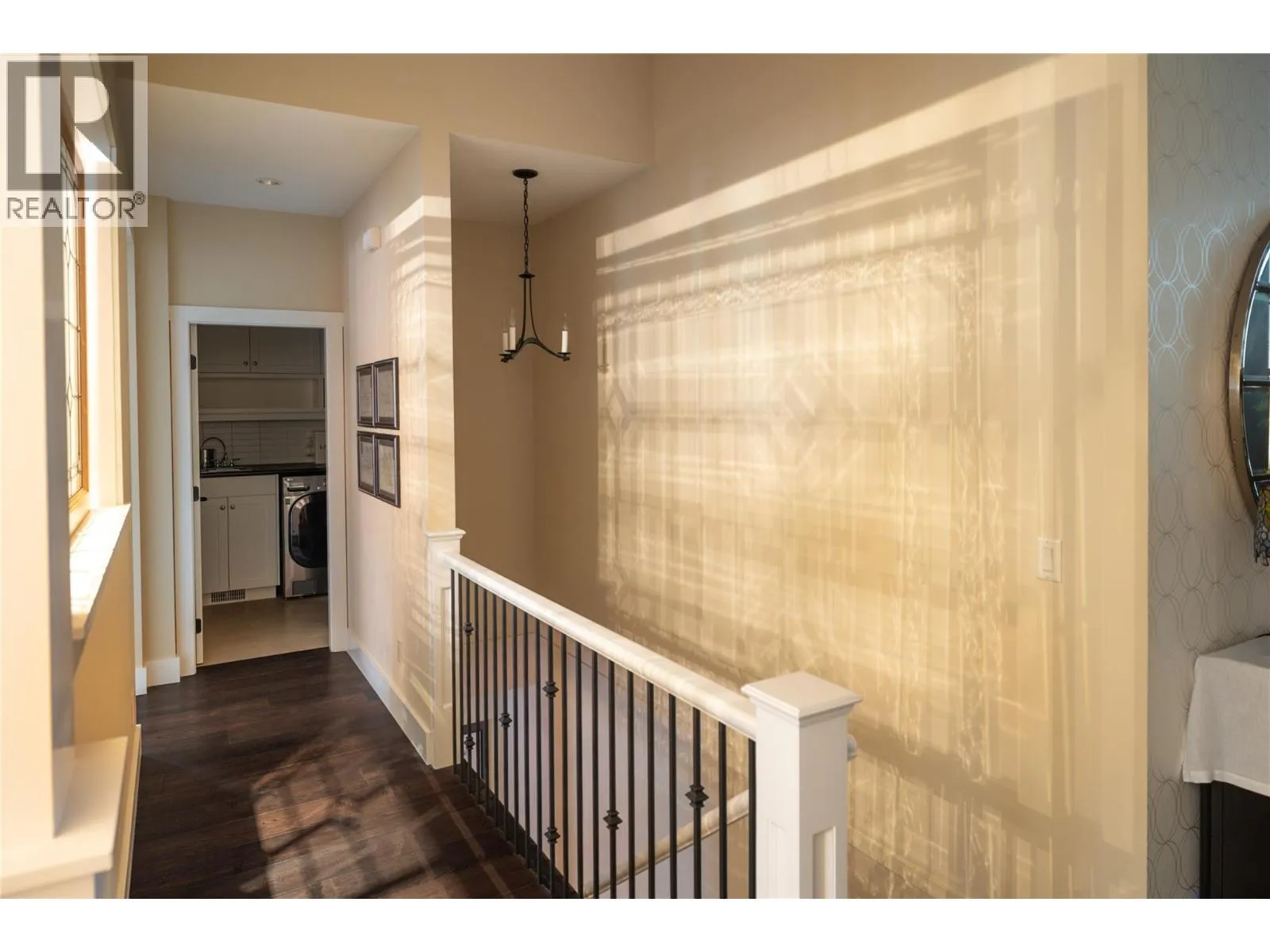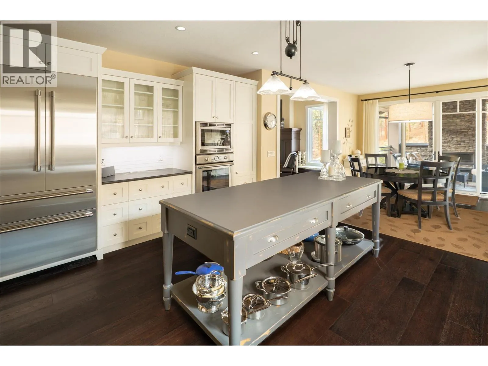 Privately positioned in an exceptionally quiet setting with no neighbours in front or behind, this thoughtfully designed residence is surrounded by mature trees and meticulous landscaping, offering a rare sense of seclusion. Built with longevity and quality in mind, the FireSmart Hardie Board exterior, concrete tile roof, Loewen windows, and handcrafted fir front door set the tone for the level of finish carried throughout. Engineered hardwood flooring, solid core doors, and all-wood casings create a cohesive, timeless interior. The kitchen is the heart of the home, featuring Brazilian soapstone countertops, solid maple cabinetry, an expansive custom island, six-burner gas range, Thermador appliance package, and a dedicated beverage centre. Indoor-outdoor living is seamless with a covered upper deck complete with gas fireplace and BBQ hookup. The walk-out lower level offers impressive ceiling heights, a custom wet bar, gas fireplace, theatre room, and access to a private patio with Beachcomber hot tub and Restoration Hardware fire bowl. A hybrid heat pump/gas furnace, EV-ready 3 car garage, grade-level windows, and thoughtful accessibility features further enhance this exceptional home designed for comfort, privacy, and everyday enjoyment. Set within the prestigious Gallaghers Canyon community, residents enjoy an unmatched lifestyle with world-class golf, scenic walking trails, and a strong sense of communityâjust minutes from Kelownaâs amenities. A rare combination of privacy, craftsmanship, and lifestyle â this is a must-see to be fully appreciated. (id:27476)
