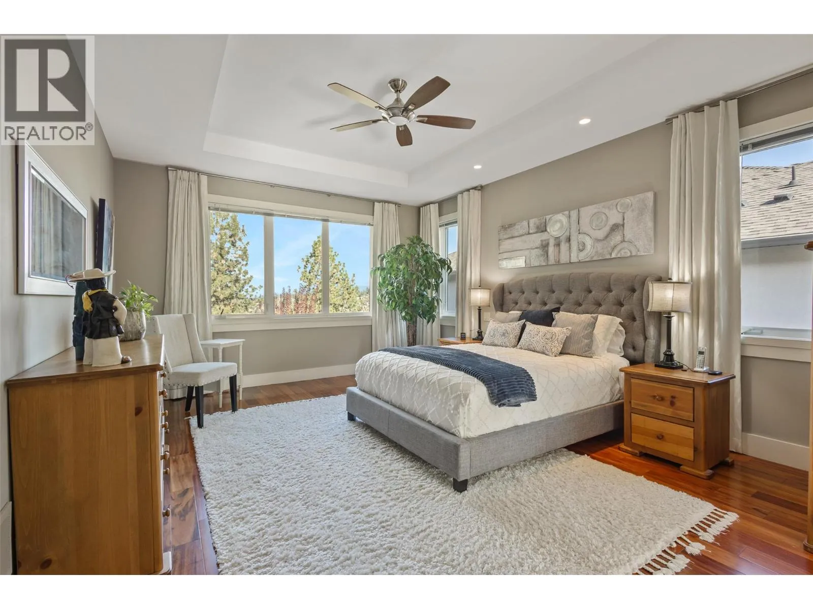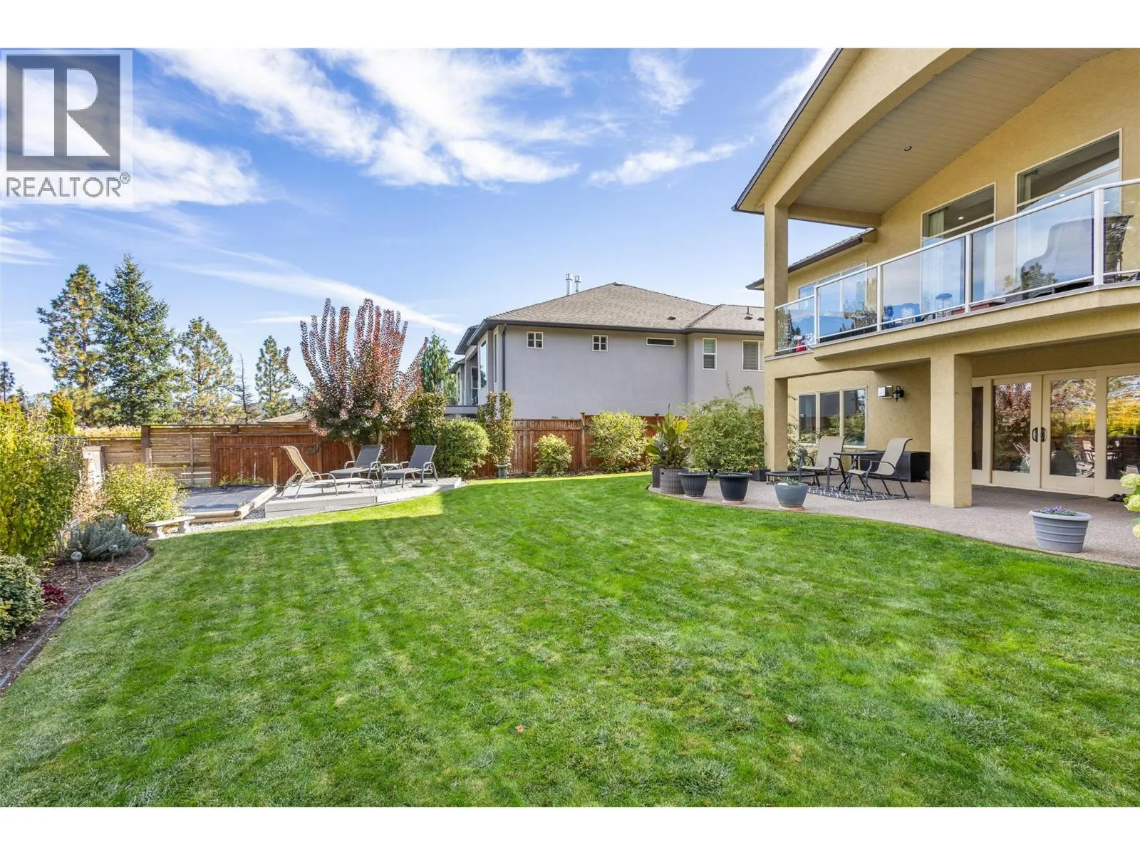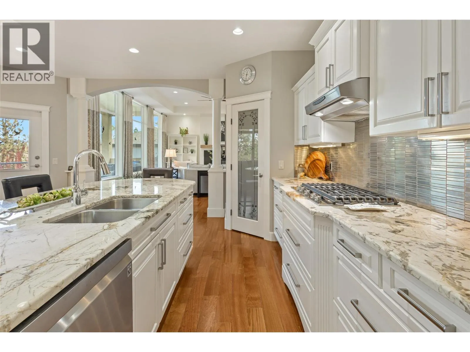 Meticulously maintained and built to impress, this 3,600+ sq. ft. walkout rancher blends timeless craftsmanship with modern comfort. From the moment you enter, 15-foot ceilings and sun-filled windows create an elevated sense of space and warmth. The main level features 11-foot ceilings and refinished Brazilian cherry hardwood that showcases pride of ownership. The open layout connects a spacious great room, gourmet kitchen with granite counters and raised island, and a large covered deck perfect for entertaining. The luxurious primary suite offers a spa-like ensuite with heated floors, his-and-hers sinks, a double soaker tub, and a separate shower. A bright south facing office or possible bedroom rounds out the main floor. Downstairs, the bright walkout basement is ideal for family or guests, complete with an in-law suite with separate laundry, two additional bedrooms, adjacent to a large bathroom with his and her sinks, a generous games and family room, and a cozy gas fireplace. Outside, the private yard is pool-sized, hot-tub ready, and framed by meticulous landscaping. With 200-amp service, newer A/C and hot water tank, underground sprinklers, and countless thoughtful upgrades, every detail has been carefully considered. Located just steps from the brand-new shopping centre, top schools, and scenic trails, and now priced below assessed value, this home offers an exceptional opportunity in one of Kelownaâs most desirable neighbourhoods. (id:27476)
