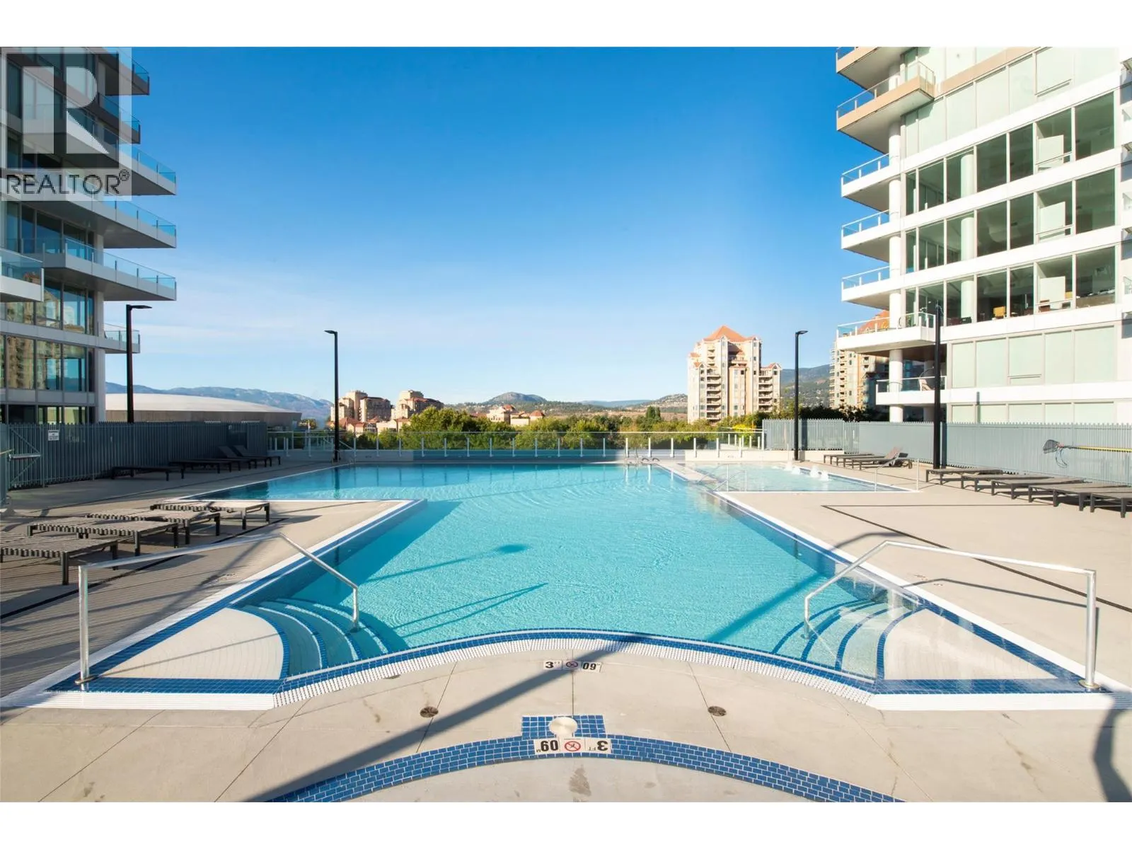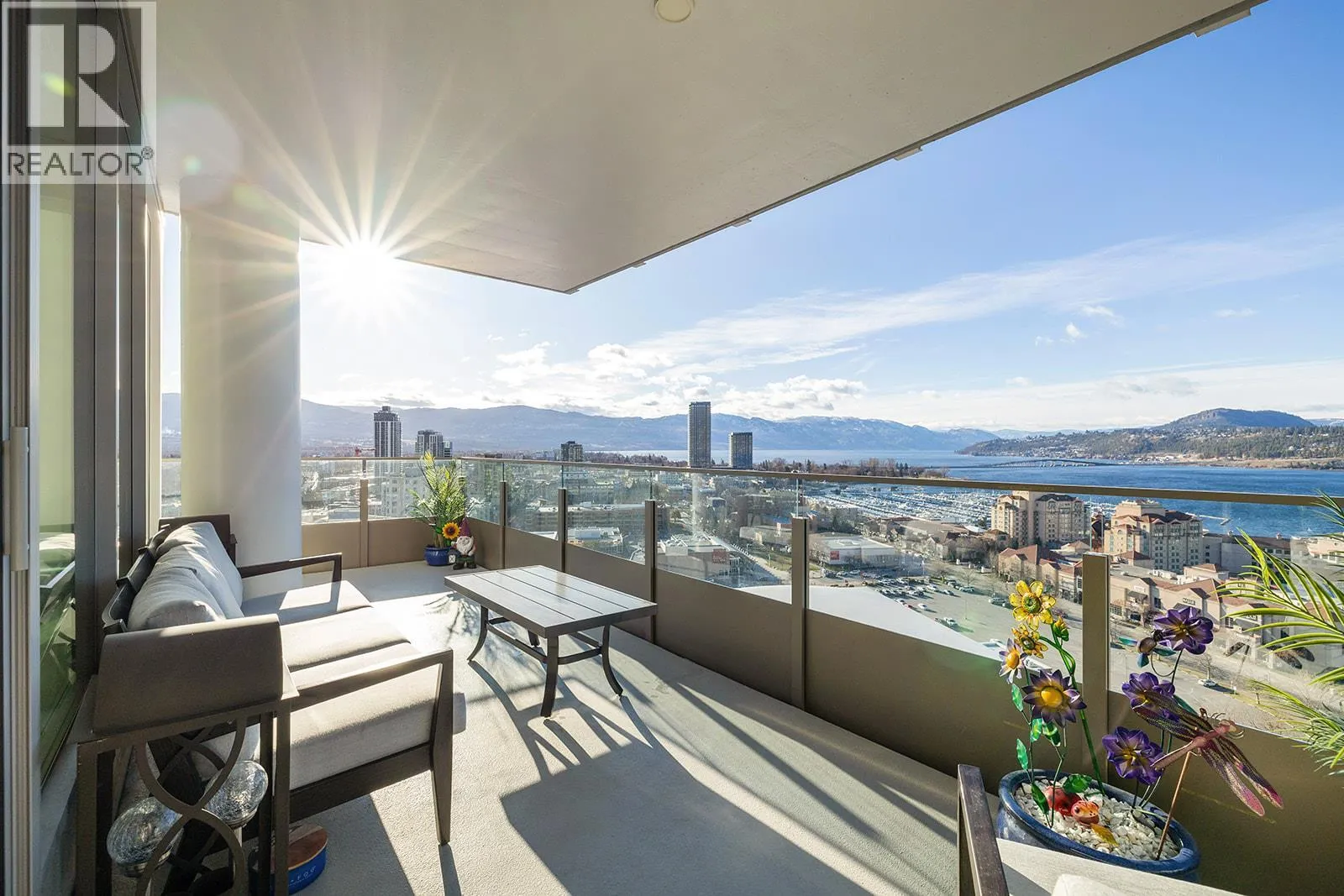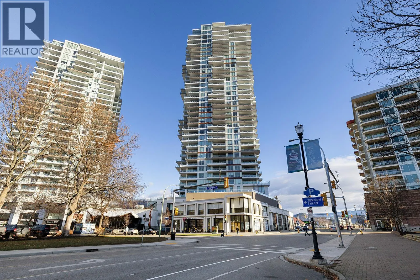 Experience elevated luxury in this stunning corner-unit residence, located at One Water. Step out onto the extended covered deck to take in the most majestic views in Kelowna. Equipped with a gas BBQ hookup, this outdoor space offers a front-row seat to the Yacht Club, the William R. Bennett Bridge, and breathtaking panoramic views of Okanagan Lake and the city skyline. The views continue throughout the home that has approximately $80,000 in meticulous upgrades designed to maximize functionality, storage, and style. The gourmet kitchen features a waterfall quartz countertop, a gas stove, upgraded microwave/convection oven, custom pull-out drawers, water purifier, and a dedicated pantry room with added shelving. The living area is highlighted by custom pot lighting above the hutch, while designer dimmer switches throughout allow you to set the perfect ambiance. The primary suite features custom cabinets with integrated lighting for added storage and aesthetics. The den has been professionally transformed into a functional workspace with a built-in office and cabinetry. Even the utility space has been enhanced with added storage beside the laundry. This offering is completed by a private storage locker that is conveniently larger than most of the standard units in the building. Residents of One Water enjoy first class amenities including two pools, hot tub, fire pits, fitness centre, guest suites and more, all within walking distance to the beach and all downtown has to offer! (id:27476)