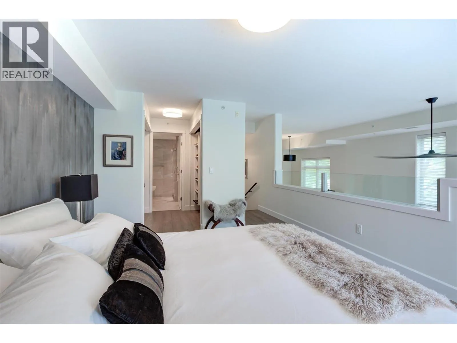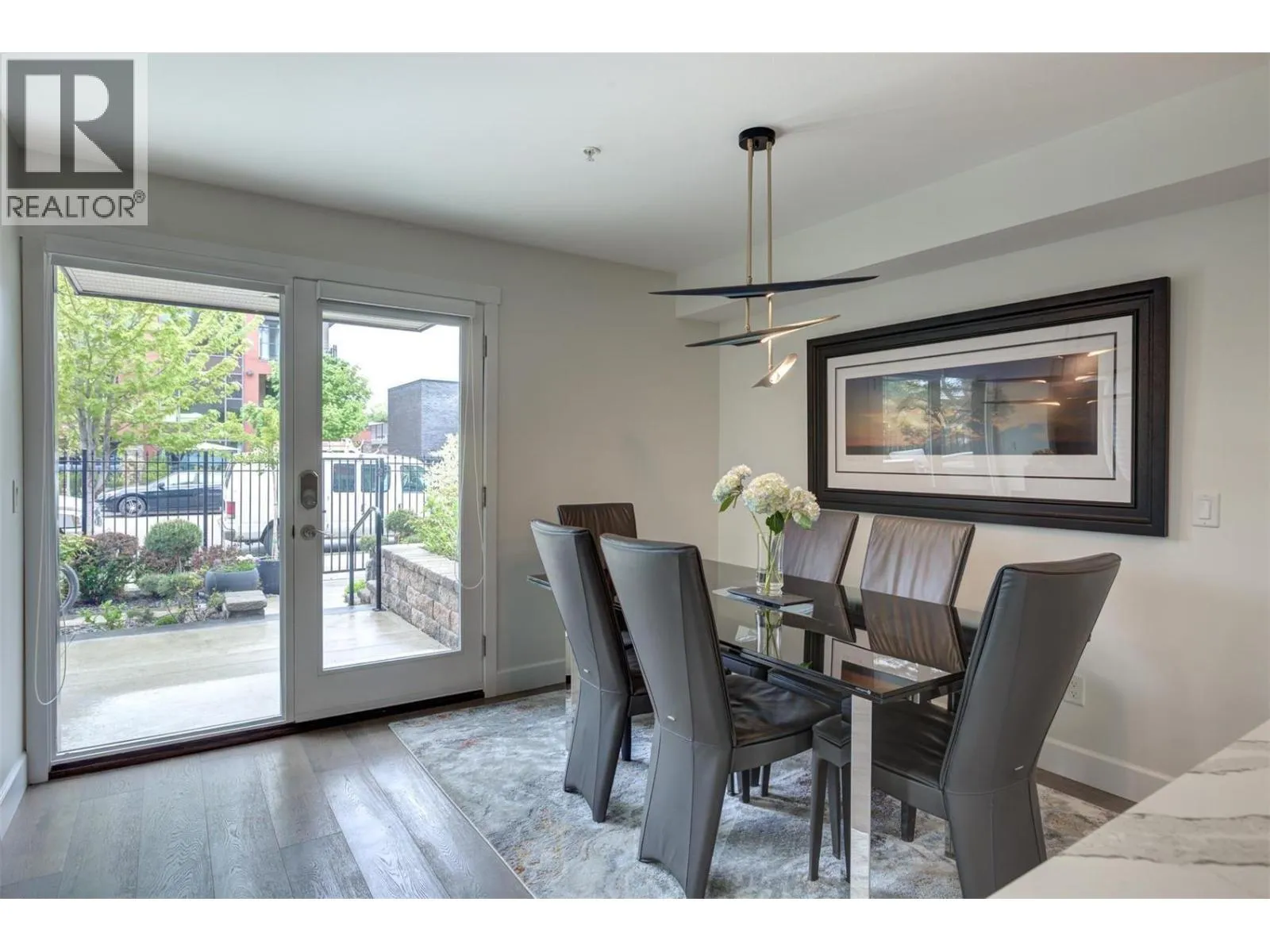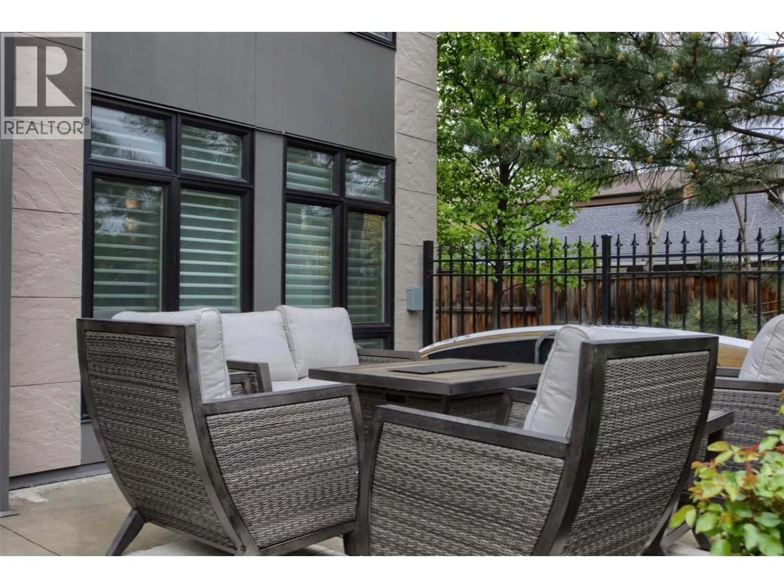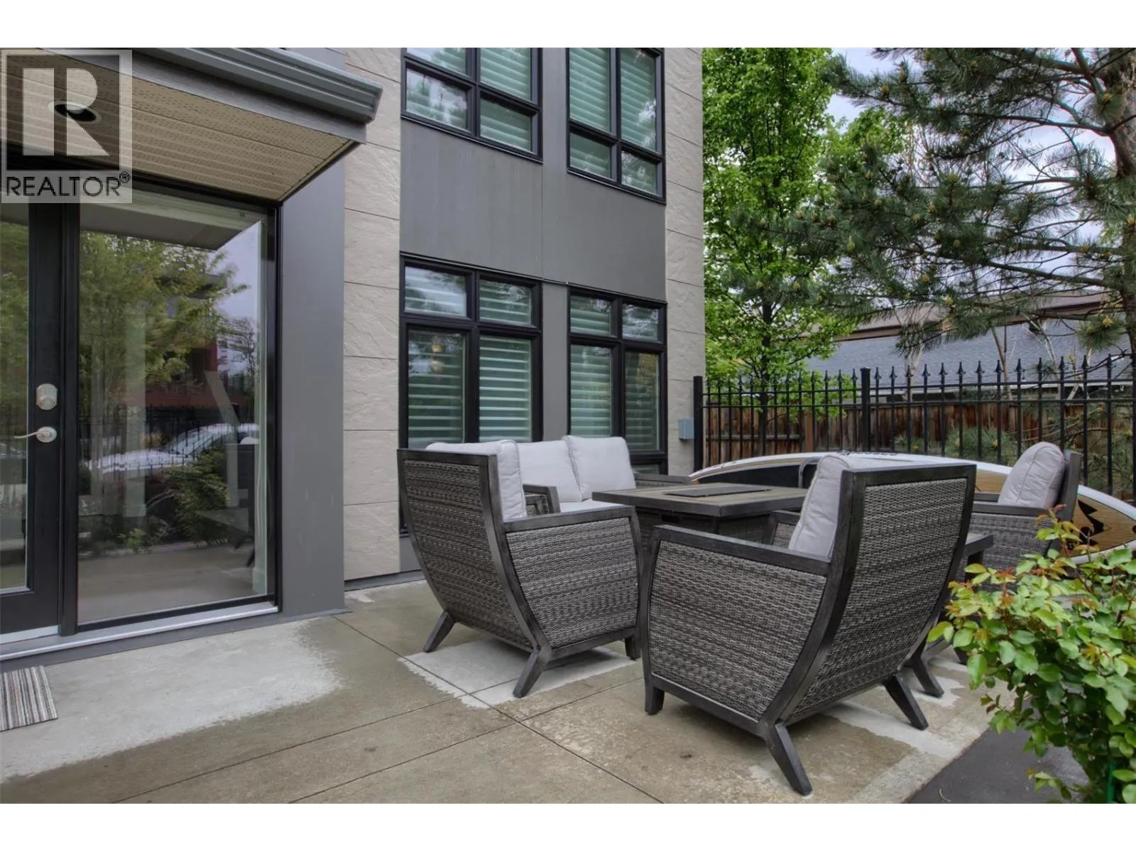 SOPHISTICATION AND LUXURY, 2 bedroom + den Brownstone style TRUE CORNER with PRIVATE ACCESS through YOUR OWN BEAUTIFUL FULLY FENCED PATIO AND COURTYARD. Located in the highly desirable, prestigious, popular and trendy Pandosy District known for its unique shopping, coffee houses, pubs, restaurants, groceries, + only a 1/2 block to Okanagan Lake, walking distance to Kelowna General Hospital and everything else. Gorgeous floor to ceiling windows, boasting natural light, 18-foot ceilings, engineered rich Oak hardwood floors as well as an open concept design. The main living area includes a natural mineral limestone feature wall including built-in electric fireplace + a newer kitchen complete with marbled quartz countertops and SS appliances. Open style spacious lofted primary bedroom, with natural mineral limestone painted feature wall, double sided closets + a modern renovated 5-piece bathroom with Bespoke Italian Marble. There is also a large second bedroom, den, full size laundry room, + 3-piece bath with Bespoke Italian tile on the second level. EV CHARGER ALREADY INSTALLED in the secured parking garage with a 2nd access to the unit from inside if so desired. Strata fees include private storage locker on the same floor, Geothermal heating/cooling, water, sewer, garbage collection & recycling, building insurance, management, snow removal, building repair & maintenance. A fabulous townhome that offers the turn-key lifestyle you desire in a neighborhood that is continually increasing in value. Pets and rentals welcome! Pride of ownership is evident, and this home must be seen to be appreciated. PET FRIENDLY! (id:27476)