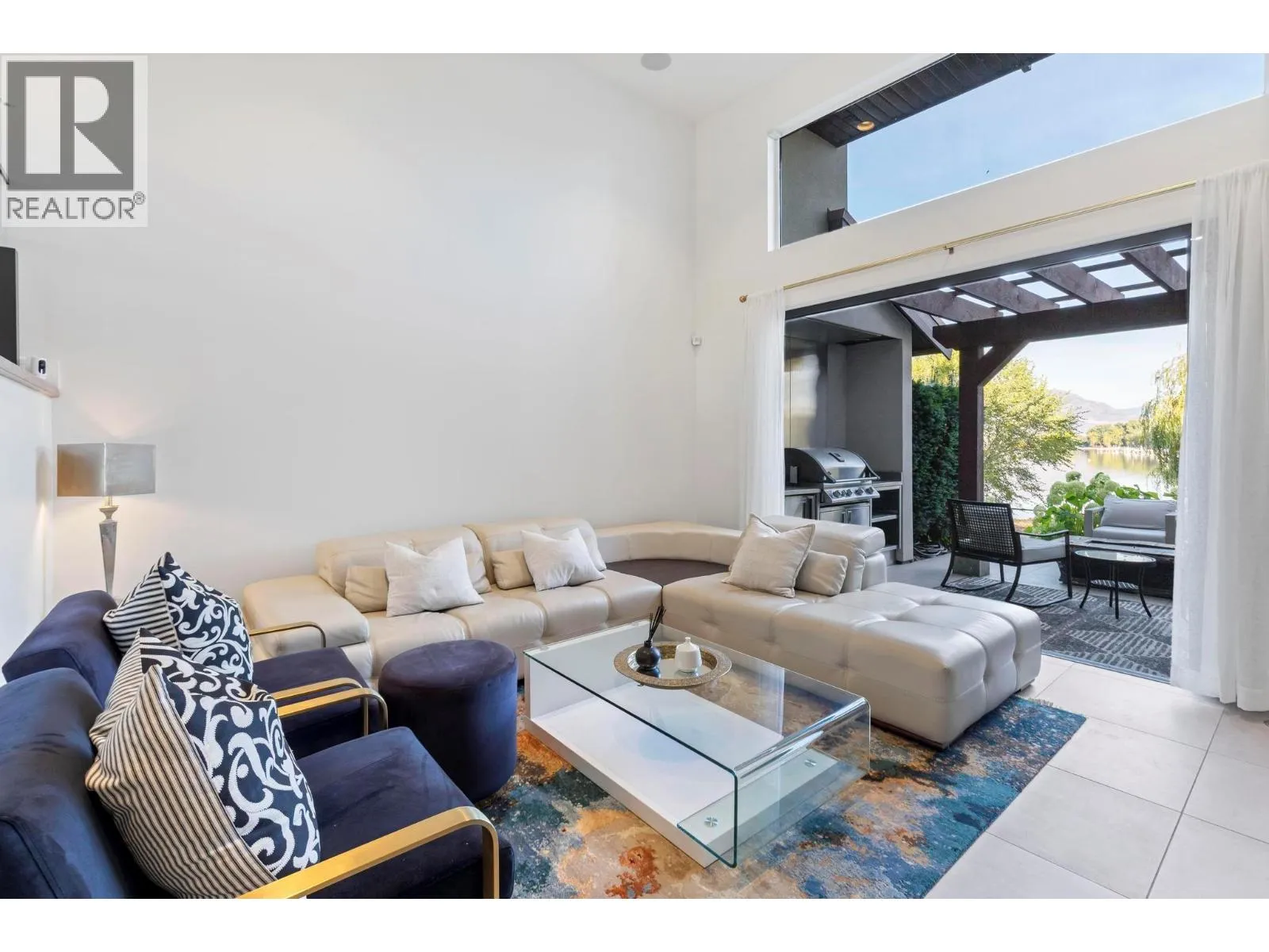 Live the ultimate Okanagan lakefront lifestyle at Lakeshore at Manteo! This luxurious 3 bedroom, 3 bathroom townhome includes your own private boat slip and lift, offering effortless access to Okanagan Lake right from your doorstep. Inside, youâll find soaring ceilings and a bright, open concept layout with an elevated kitchen and dining area overlooking the living space below. The chef inspired kitchen features a Wolf gas range, premium appliances, an elegant recessed wine display with accent lighting, a wine fridge, and quartz countertops, blending modern elegance with everyday functionality. Expansive folding glass doors open to a private patio overlooking Rotary Beach and the lake, creating a seamless indoor outdoor living experience. Upstairs, the primary suite provides a true retreat with a private balcony overlooking the water, perfect for morning coffee or unwinding at sunset. Two additional bedrooms and a full bathroom complete the upper level. With built in speakers throughout the home and patio, every detail is designed for entertainment and relaxation. Thereâs also parking for up to three vehicles, a rare luxury in a waterfront community. Enjoy resort style amenities including an outdoor pool, hot tub, and lakeside fire pits, all just steps from the sand and shoreline. With direct access to Rotary Beach and Okanagan Lake in Kelownaâs coveted Lower Mission, youâre minutes from Gyro Beach, the Eldorado, and Manteo Resort. This is lakeside living at its finest. (id:27476)