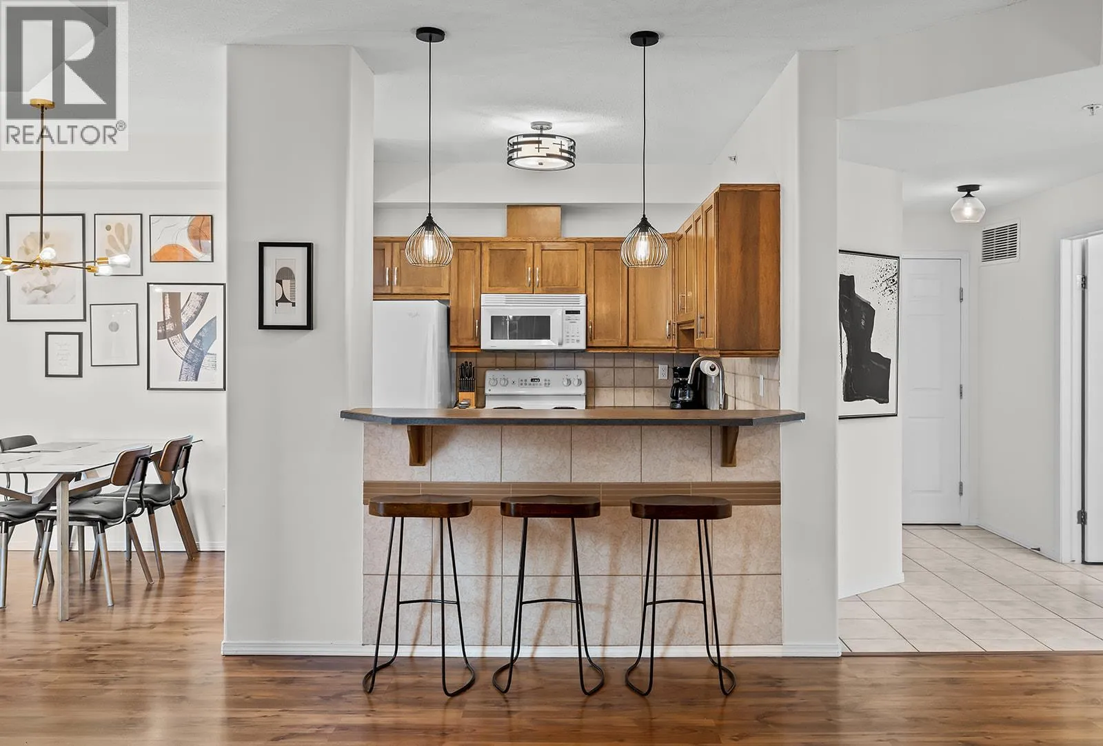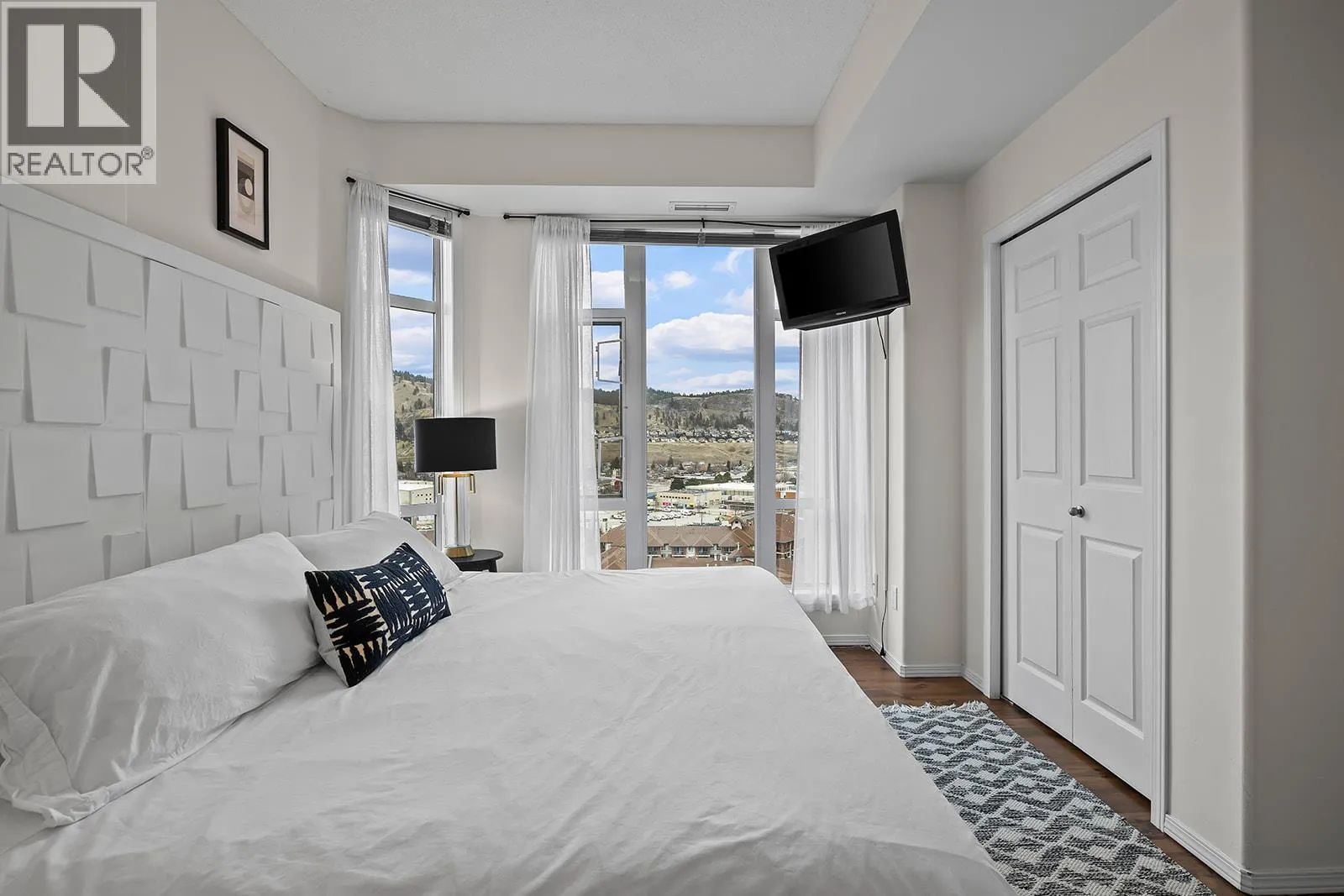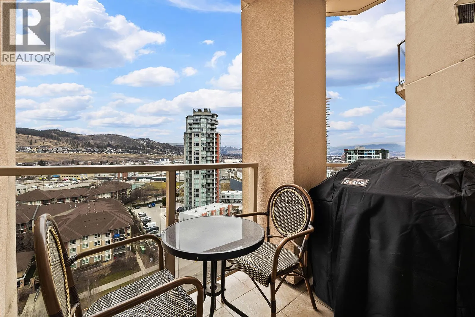 Enjoy elevated downtown living from the 14th floor in the heart of Kelownaâs waterfront district. This well-maintained two-bedroom residence offers an ideal blend of space, location, and versatility, whether youâre looking for a full-time home or a revenue-generating property. The open layout is filled with natural light and showcases expansive city and mountain views from nearly every room. The kitchen offers ample cabinetry and counter space with bar seating, flowing seamlessly into the dining and living areasâcomplete with a gas fireplace. The primary bedroom features beautiful city views, a three-piece ensuite, and thoughtful upgrades throughout. A spacious second bedroom provides flexibility for guests. Additional highlights include in-suite laundry and a tiled deck with gas BBQ hookupâperfect for taking in the skyline and surrounding scenery. Residents enjoy access to resort-style amenities including pools ( indoor and outdoor ), hot tubs( indoor and outdoor ), steam room, fitness centre, tennis courts, and geothermal heating, all included in the strata fees. A prime downtown location, generous layout, and excellent upkeep make this property a standout opportunity. (id:27476)