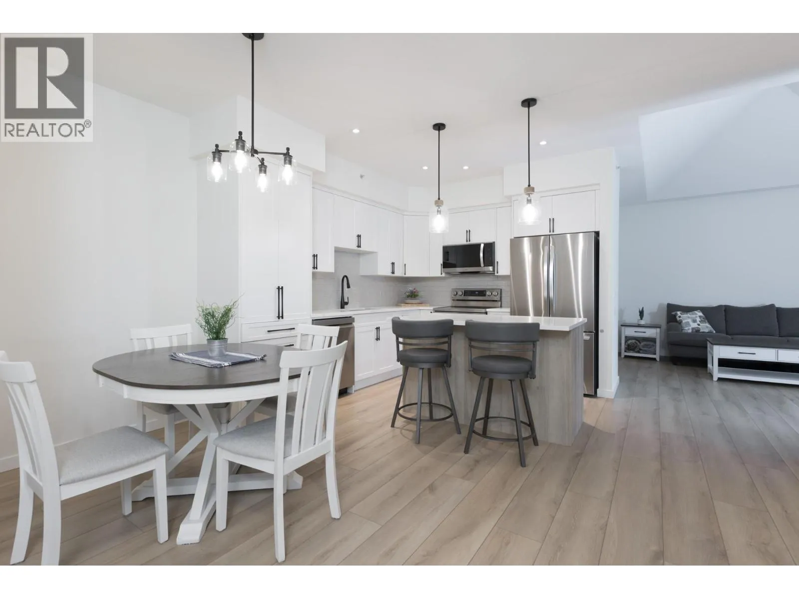Top-floor, fully reimagined condo with vaulted ceilings in the living room, mountain views, and a covered deckâone block to the beach. Located in the heart of the Lower Mission, this 1-bedroom + den, 2-bathroom home was professionally renovated in 2025 delivering a fully modernized interior. Enjoy mountain views from the living room and deck. Highlights include all-new flooring, kitchen with new cabinetry, granite countertops, island, and new appliances, fully renovated bathrooms, new interior doors, fresh paint, updated lighting, and new window blinds. Clean, contemporary design with excellent flow and functionality. Includes one parking stall and one storage locker. Small pets permitted. Prime location close to coffee shops, transit, H2O Adventure + Fitness Centre, and MNP Place (ice arena and sports complex). Available for immediate possessionâmove-in ready. (id:27476)