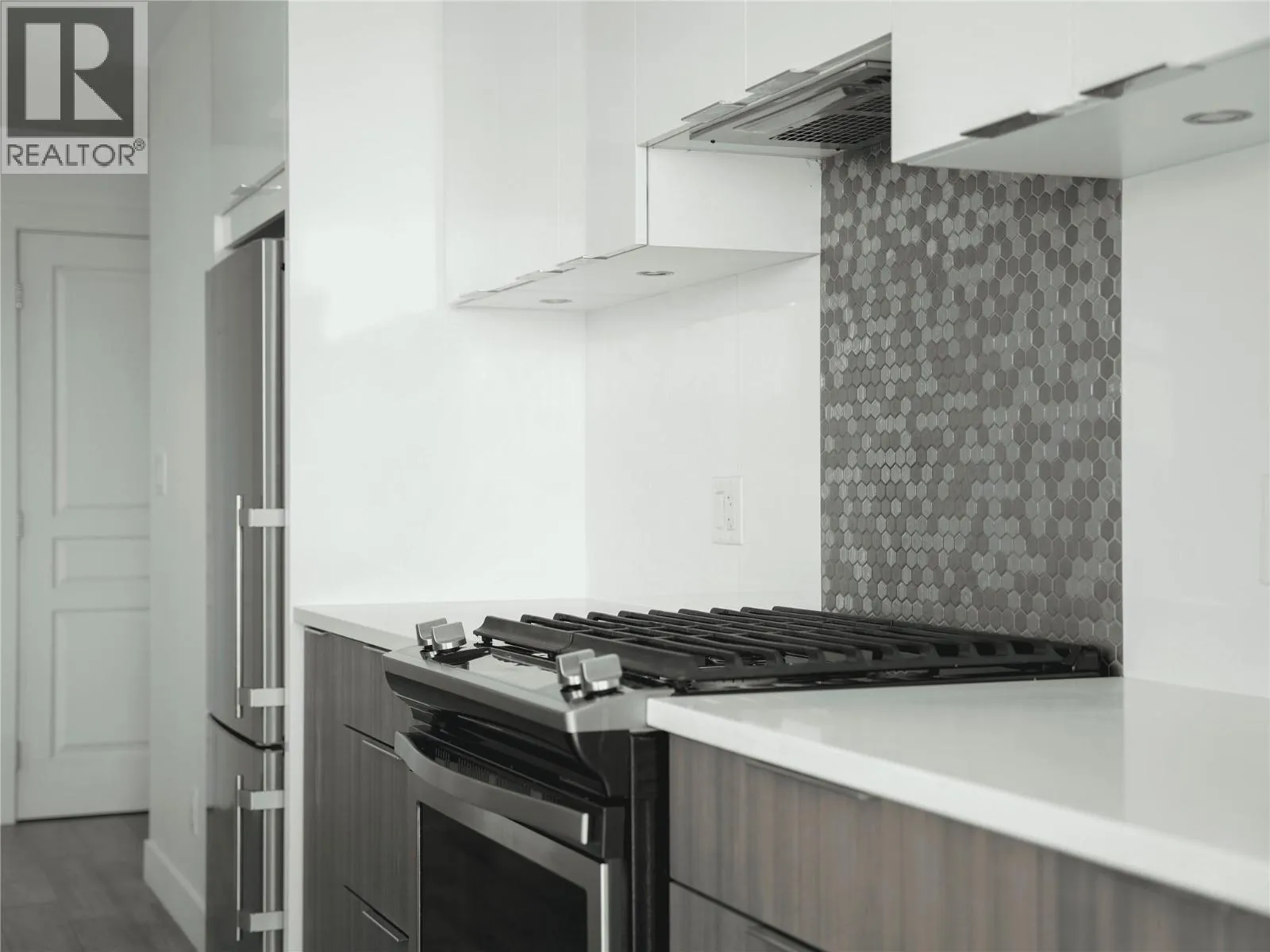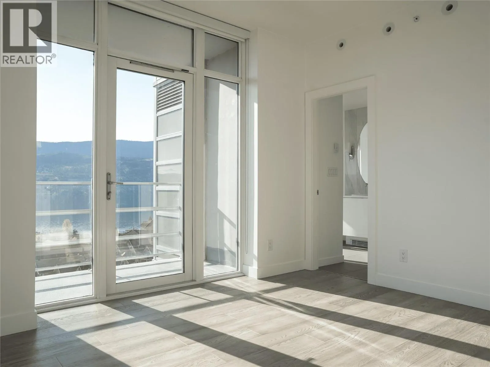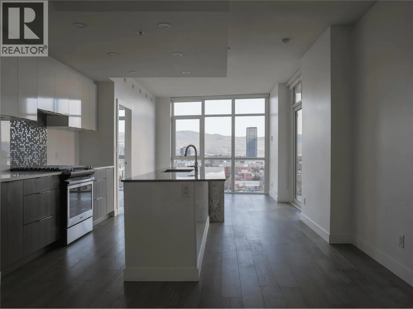 A premier corner location on Sunset Drive with southwest exposure that fills the home with natural light from morning onward. This 2 bedroom plus den, 2.5 bathroom residence showcases sweeping views of downtown, the Water Street entertainment district, local festivals, surrounding mountains, and expansive 180 degree lakeviews including the Bennett Bridge. Situated on the 15th floor, the spacious 180+ sq ft wraparound balcony offers multiple vantage points and ample room for a sectional and gas BBQ, ideal for taking in parasailers, seaplanes, passing boats, concerts at Prospera Place, and even the ospreys nesting at the nearby bird sanctuary. Inside, the home is finished with an oversized island featuring waterfall granite countertops, complementary cabinetry with quartz surfaces, and wood laminate flooring throughout. Floor to ceiling windows in the main living areas ensure the views are always front and center. Additional highlights include two secure heated parking stalls and a storage locker. Residents enjoy access to resort-style amenities including a hot and cold plunge pool, fitness centre, shared kitchen and lounge, BBQ area, meeting room, and bike storage. Pet-friendly living allows 2 dogs, 2 cats, or one of each, with no size restrictions. (id:27476)