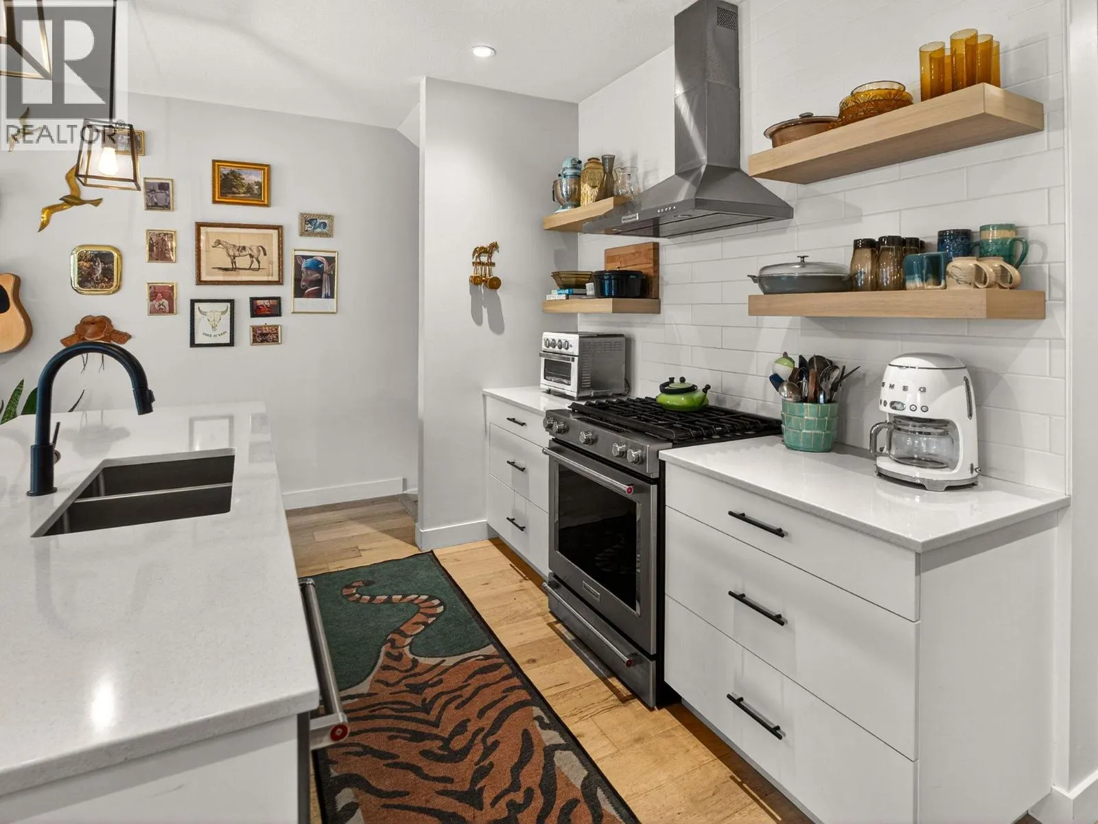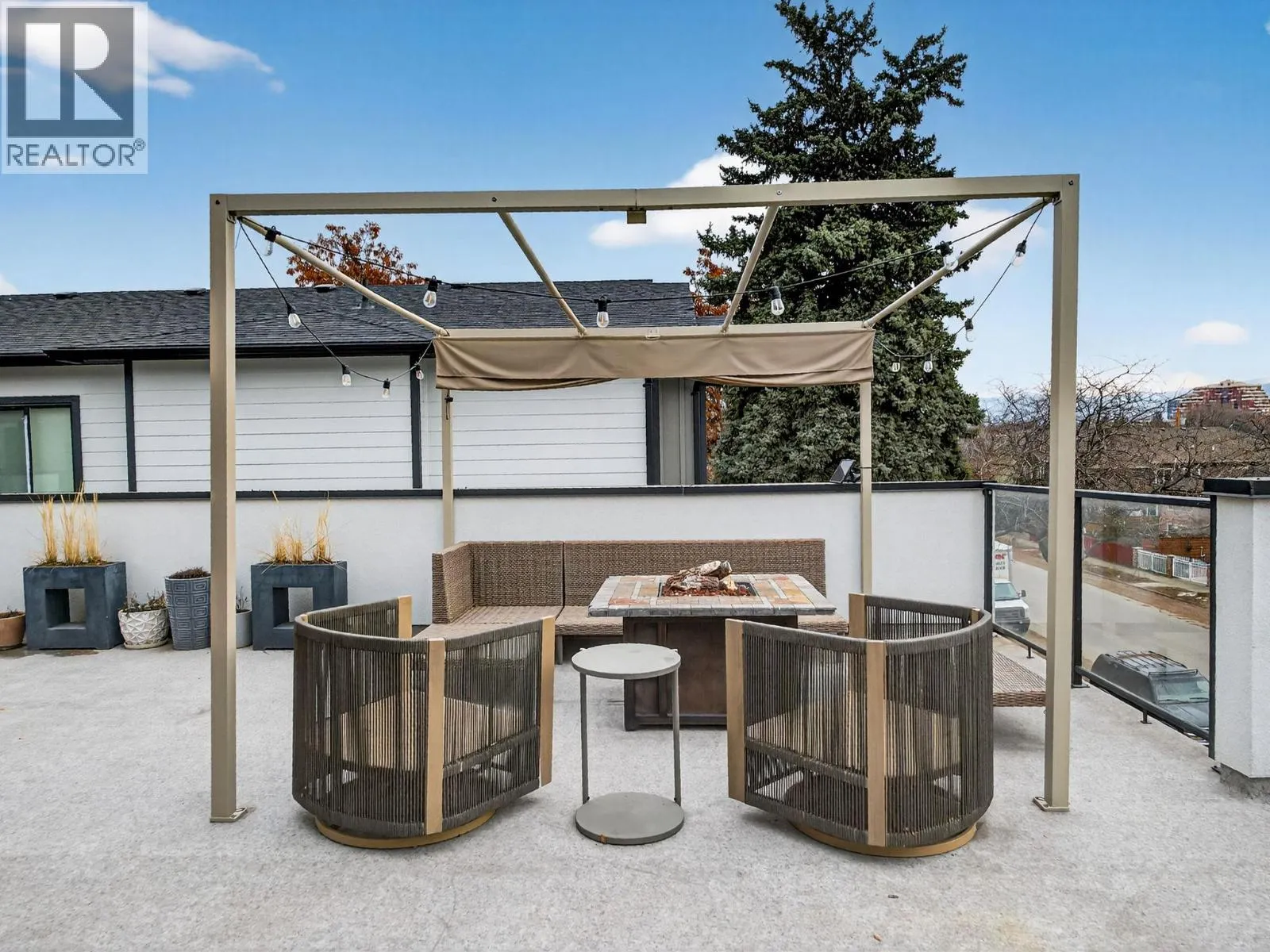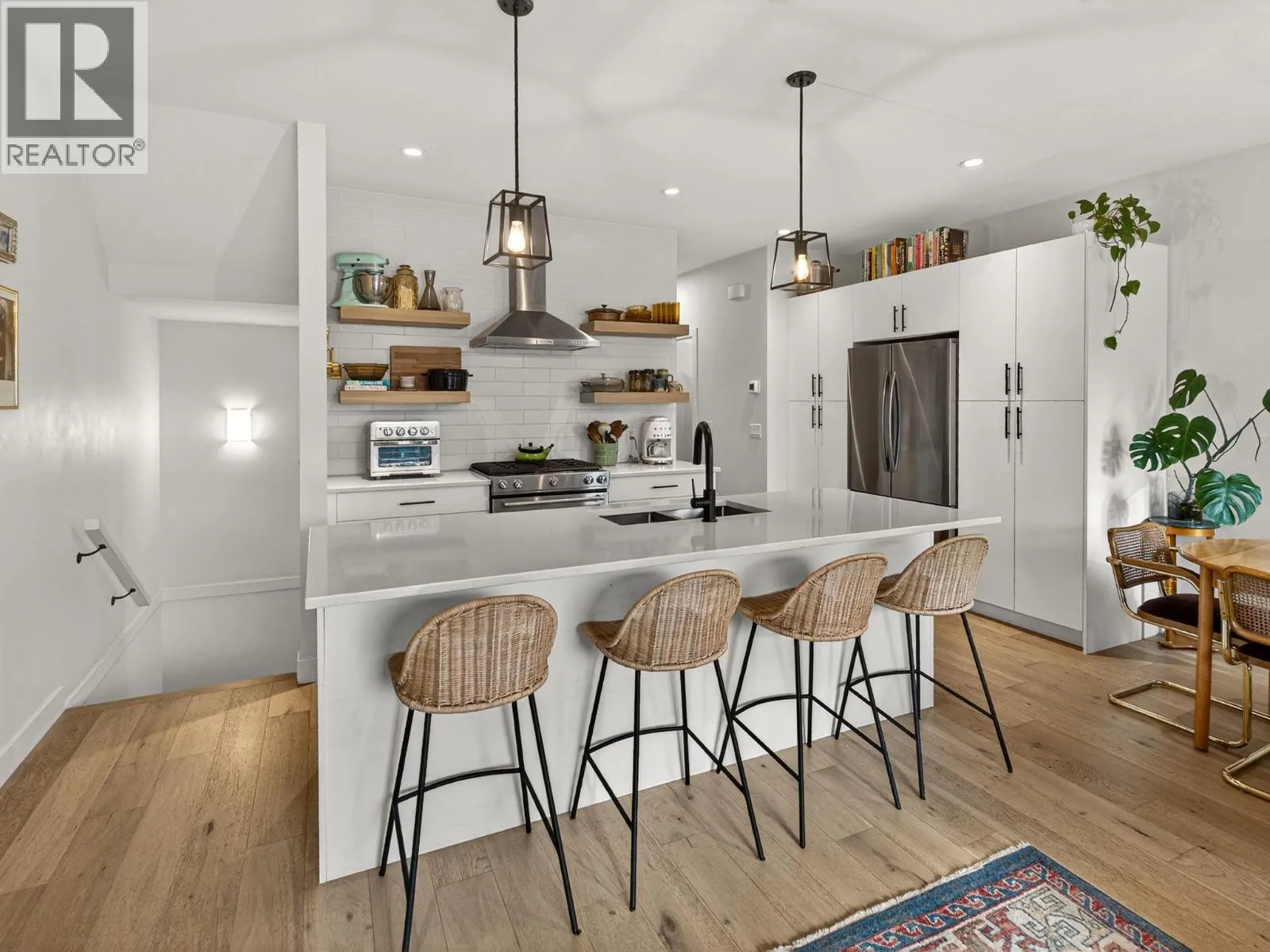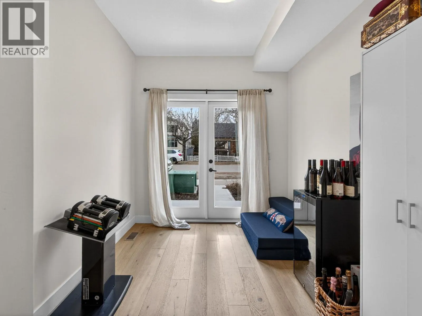 Set on a quiet, treelined street just steps from the downtown core, this modern townhome offers outstanding walkability to the waterfront, restaurants, coffee shops, and everyday conveniences. The main level features a welcoming entry with generous storage, a full bathroom, a bedroom, and a separate flex space that works well as a home office, gym, or another bedroom. This level also includes an attached garage with direct street access, plus an additional driveway parking space. A crawl space provides valuable extra storage, a rare bonus for townhome living. The second level is bright and well laid out, offering an open concept living and dining area designed for both everyday comfort and entertaining. The modern kitchen features clean lines, a gas range, and a large island with seating for four. Hardwood flooring runs throughout the home, with no carpet. A spacious bedroom, full bathroom, and in unit laundry complete this level. The top level is dedicated to outdoor living, highlighted by an expansive private rooftop deck. With plenty of room for entertaining or relaxing, the deck offers beautiful views toward Knox Mountain and is ideal for enjoying Okanagan summers. The building is self-managed, keeping strata fees very low, and water is included. In short, this is a well designed, low maintenance home, offering quiet surroundings with unbeatable access to the city. (id:27476)