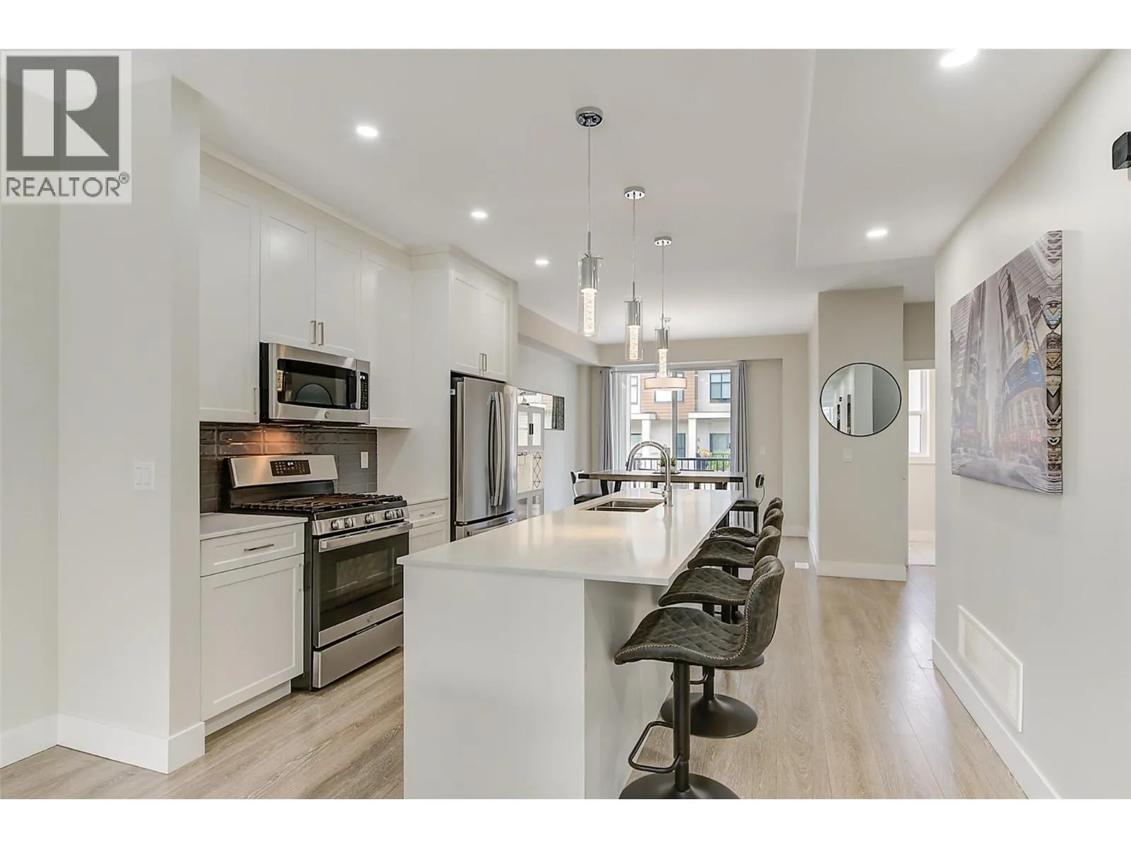 3 storey townhome just seconds from Black Mountain Golf Club, offering space, style, and a family friendly layout that feels easy to live in. Laminate flooring runs throughout, creating a bright and cohesive look across all levels. The main floor is open and inviting, designed for everyday living and effortless entertaining. The kitchen is both stylish and practical with stainless steel appliances, a gas stove, and an oversized island that makes cooking and gathering feel natural. Upstairs, the primary bedroom offers generous space, a walk in closet, and a private ensuite. Two additional bedrooms, a full bathroom, and convenient laundry complete the upper level. A fourth bedroom and additional bathroom on the entry level provide flexibility for guests, home office use, or growing families. The large single car garage has new epoxy flooring, adding durability and a polished finish. Centrally located approximately 15 minutes to downtown Kelowna, 15 minutes to the airport, and 30 minutes to Big White Ski Resort. Minutes from the local elementary school and steps to hiking trails and the golf course, this is a location that balances everyday convenience with outdoor living. (id:27476)