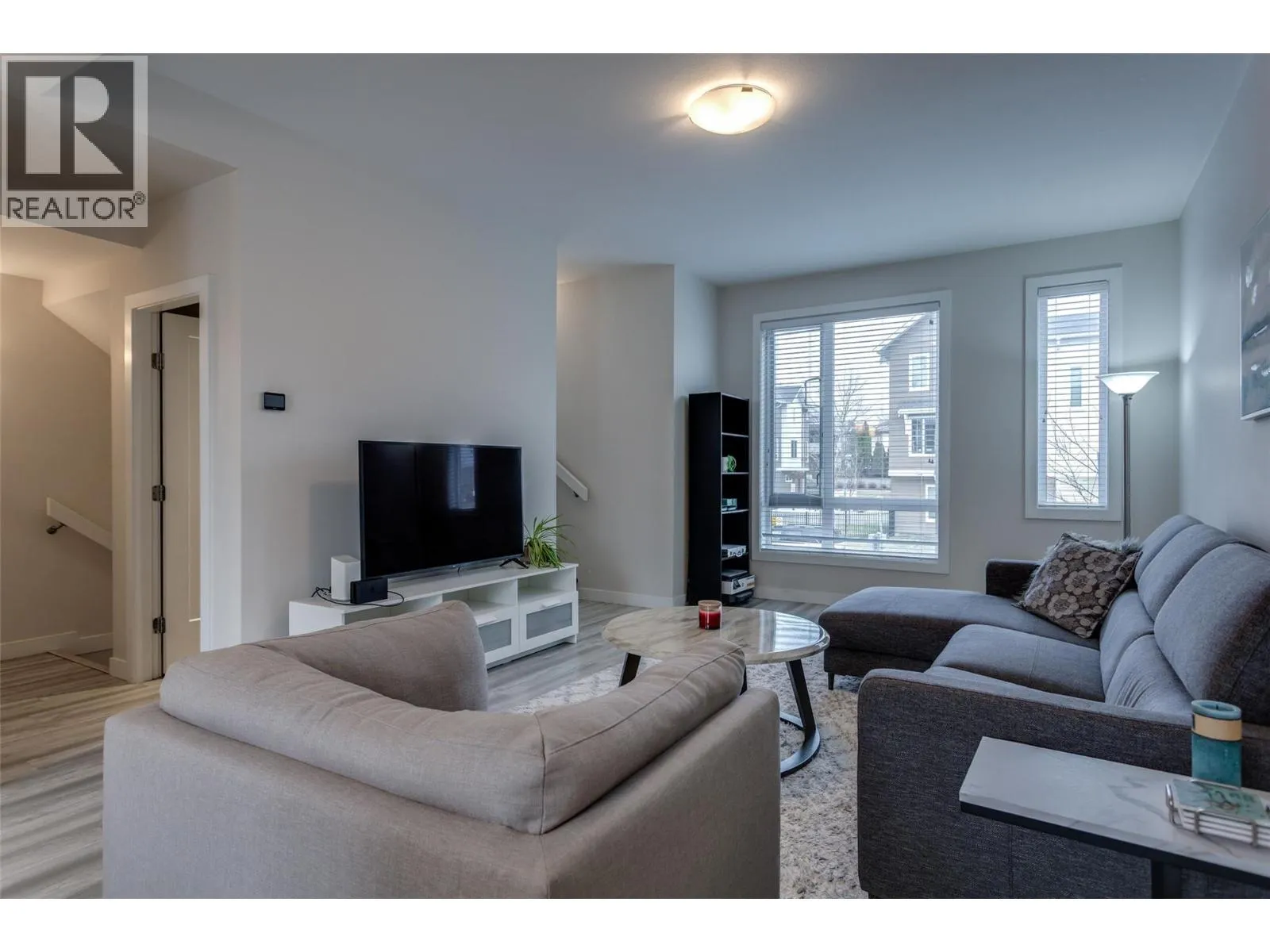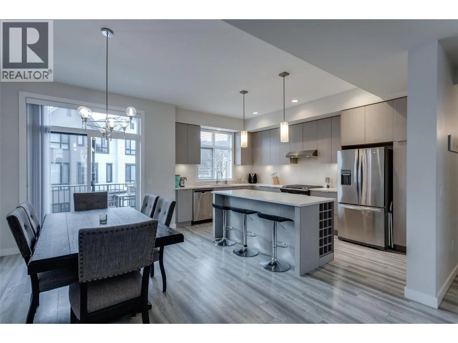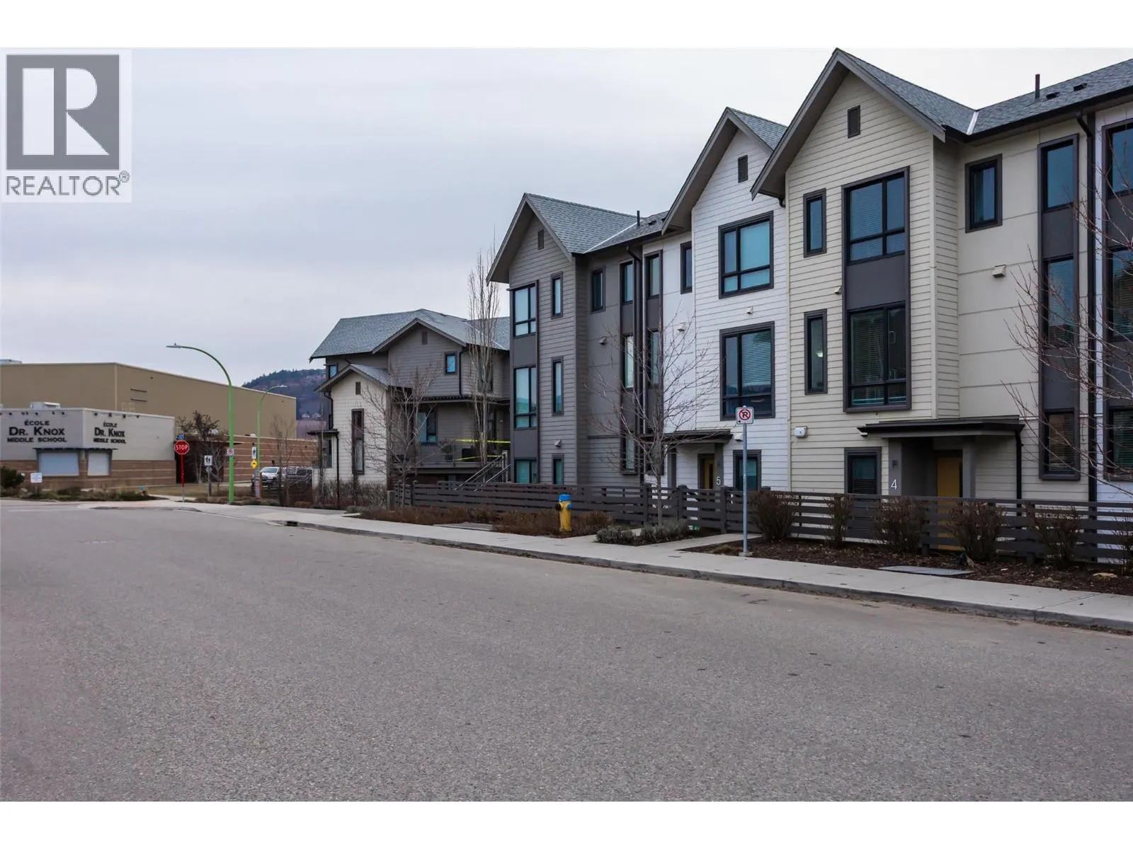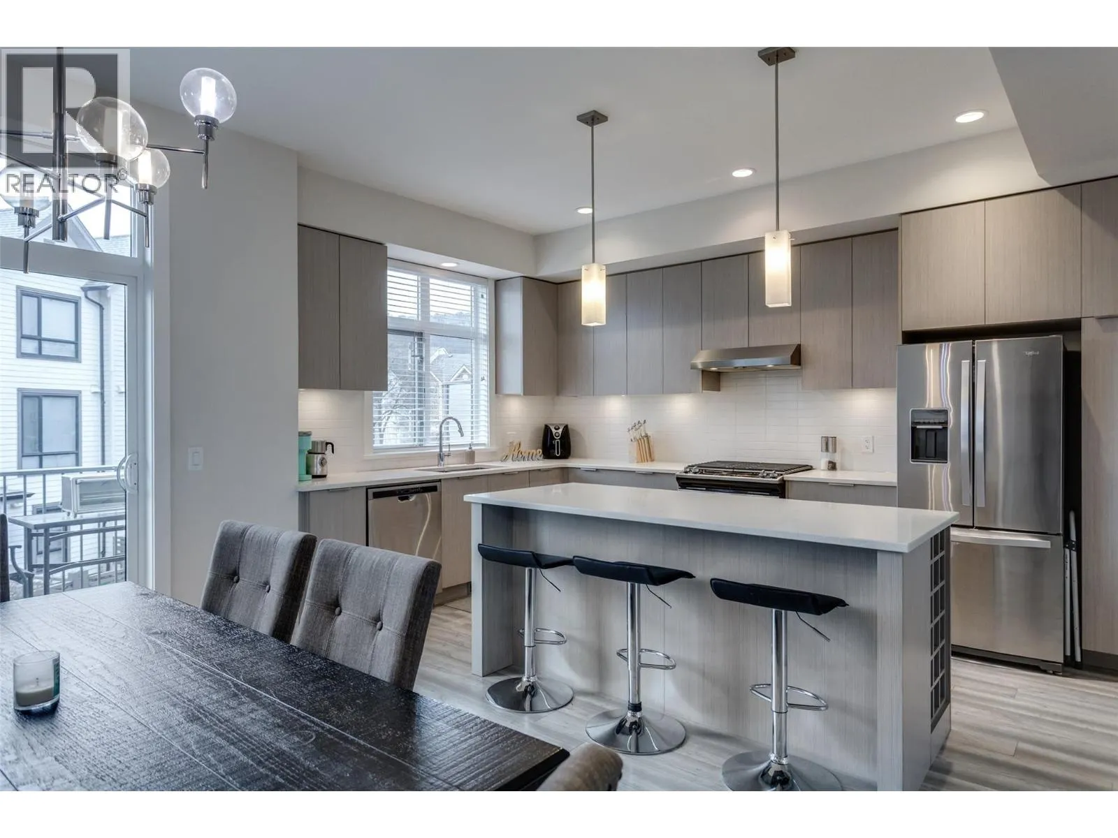 Discover Drysdale Row, a beautiful and thoughtfully created 4-bedroom, 2.5-bathroom townhome in one of North Glenmoreâs most sought-after communities. Offering just under 1,600 sq. ft., the open-concept main level is designed for modern living, with elevated ceilings, a bright & spacious living area, and a gorgeous kitchen at the heart of the home. This home features a wider floor plan and large windows that fill the space with natural light. Situated on a quiet residential street, the sidewalk access leads to a charming front yard. The chef-inspired kitchen showcases a large quartz island with built-in wine storage, stainless steel appliances, and a gas range, flowing seamlessly into the open-concept living and dining areasâideal for entertaining. A deck made for morning coffees or summer BBQs and a stylish 2-piece powder room complete this level. Upstairs offers three spacious bedrooms, a full bathroom, and convenient laundry. The primary suite includes spa-like ensuite and a walk-in closet. The lower level features a fourth bedroom or flex space, perfect for a home office, gym, or hobby room, with direct access to the side-by-side double garage. Located in a family-friendly neighbourhood, it is only a few steps to Dr. Knox Middle School and North Glenmore Elementary, with bus routes to UBCO, and close to parks, trails, shopping, and restaurants. (id:27476)