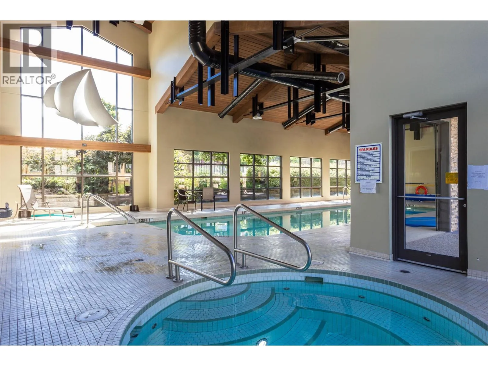 OPEN HOUSE SAT FEB 14th 1-3PM! LUXURIOUS LIVING AT UPSCALE 'SOUTHWIND AT SARSONS' only a 10 minute walk to Lake and lovely Sarsons Beach and Park! This stunning 1497 SF Level Entry Condo with a Bright South facing Covered Patio on landscaped grounds is Beautiful. Huge windows flood the open plan with tons of natural light! 9' ceilings, warm decor, engineered hickory hardwood in main living areas, tile in bathrooms and cozy carpets in bedrooms. Large Open Maple Kitchen with generous island, granite counters, oodles of cabinets, and under cabinet lighting. SS appliances, New Bosch dishwasher! Dining area has glass door to a covered concrete patio and garden area for seamless in-out lifestyle. Roomy Great room features a gas fireplace and huge wall to wall windows bringing the outside in. Double glass doors to a separate office/den off the entry. Luxurious primary bedroom with Extra large 5 piece Ensuite with separate soaker tub/shower, travertine style tile floors, granite counters. Split bedroom design: 2nd bedroom has walk through closet, generous 3 piece bathroom with huge walk in tile/glass shower. Big laundry with cabinets. Southwinds is a 'Cut Above' in luxury design with an Impressive main entry, Separate clubhouse with full fitness facilities, big indoor pool and hot tub, & extensive landscaped and pond areas, walking trails & gardening opportunities for the green thumb! Strata Fee Includes Heat, Hot Water. U/G parking & secure storage. 1 dog or cat, 15"" or 12kg. (id:27476)