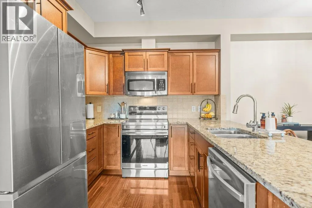 Welcome to Unit #307 at The Radius where cozy comfort meets an urban-inspired lifestyle surrounded by all of lifeâs amenities - itâs a location that is completely unmatched in Kelowna! Immaculately maintained and fully move-in ready, this freshly painted 2 bed 2 bath unit boasts sunny west facing views, hardwood floors, updated lighting throughout, ample in-suite storage, and a private deck to enjoy the Okanagan seasons, it does not disappoint! Along with the generous square footage & abundance of natural light, youâll love the exceptional floorpan featuring a modern, open concept kitchen/dining/living space and a âsplitâ bedroom layout allowing for extra privacy with the king-sized primary bedroom also boasting a walk-in closet & a 3-piece ensuite. The functional kitchen is also sure to impress, featuring brand new stainless steel appliances, plenty of cabinets, and stone countertops. Moving outside, the extra magic of this condo is the locationâ¦quite simply a dream come true for those âbike and walk to everywhereâ enthusiasts. Nestled adjacent to the Orchard Park district youâll have unparalleled access to shopping, dining, gym facilities, entertainment, public transit, dentist, veterinarians, banking, you name it! All the while also having parks & green space for every day strolls. A secured underground parking stall & a storage locker come with this unit, rentals & pets are welcome (some restrictions). This home really has it all, letâs book your private showing today! (id:27476)
