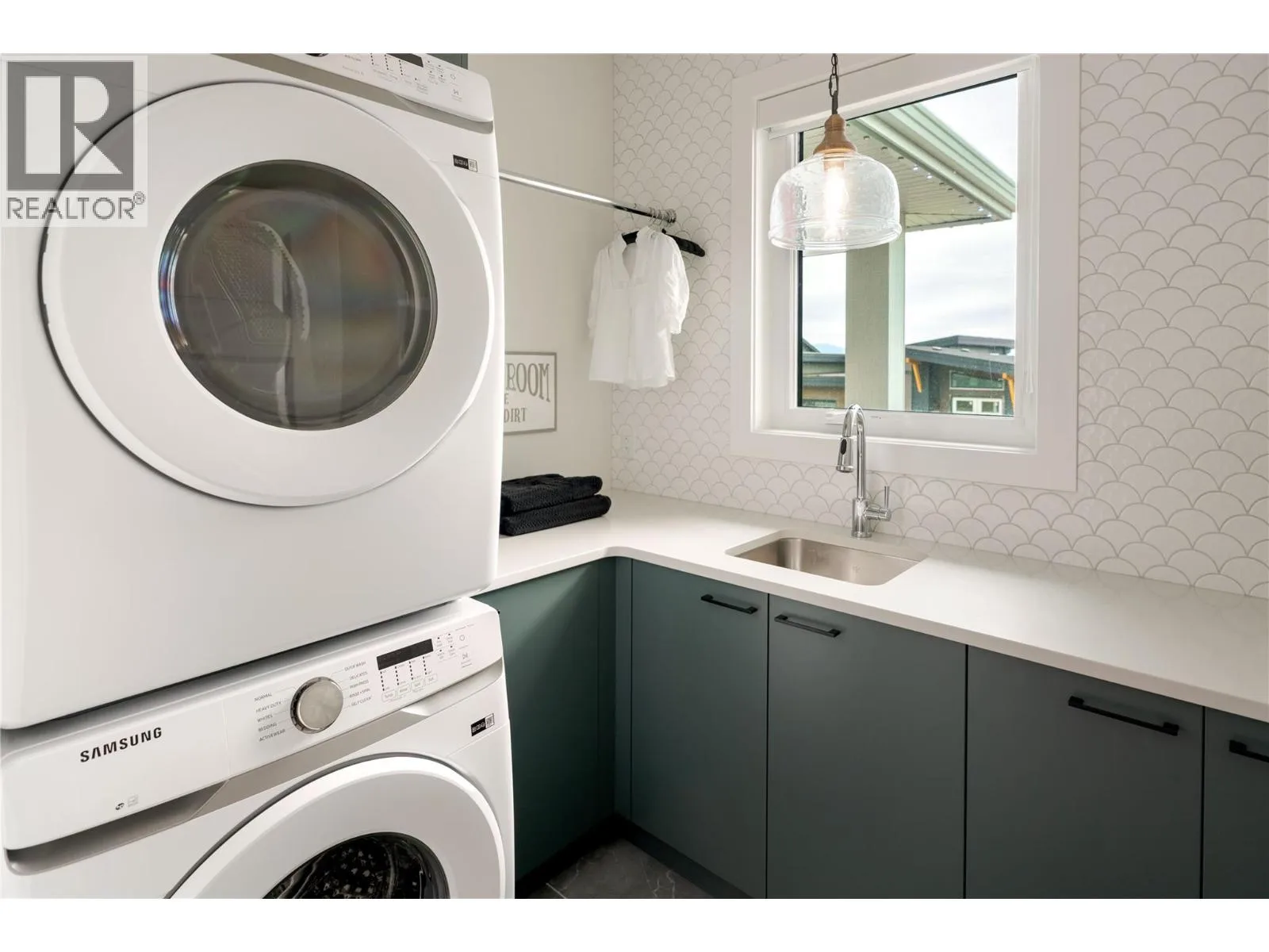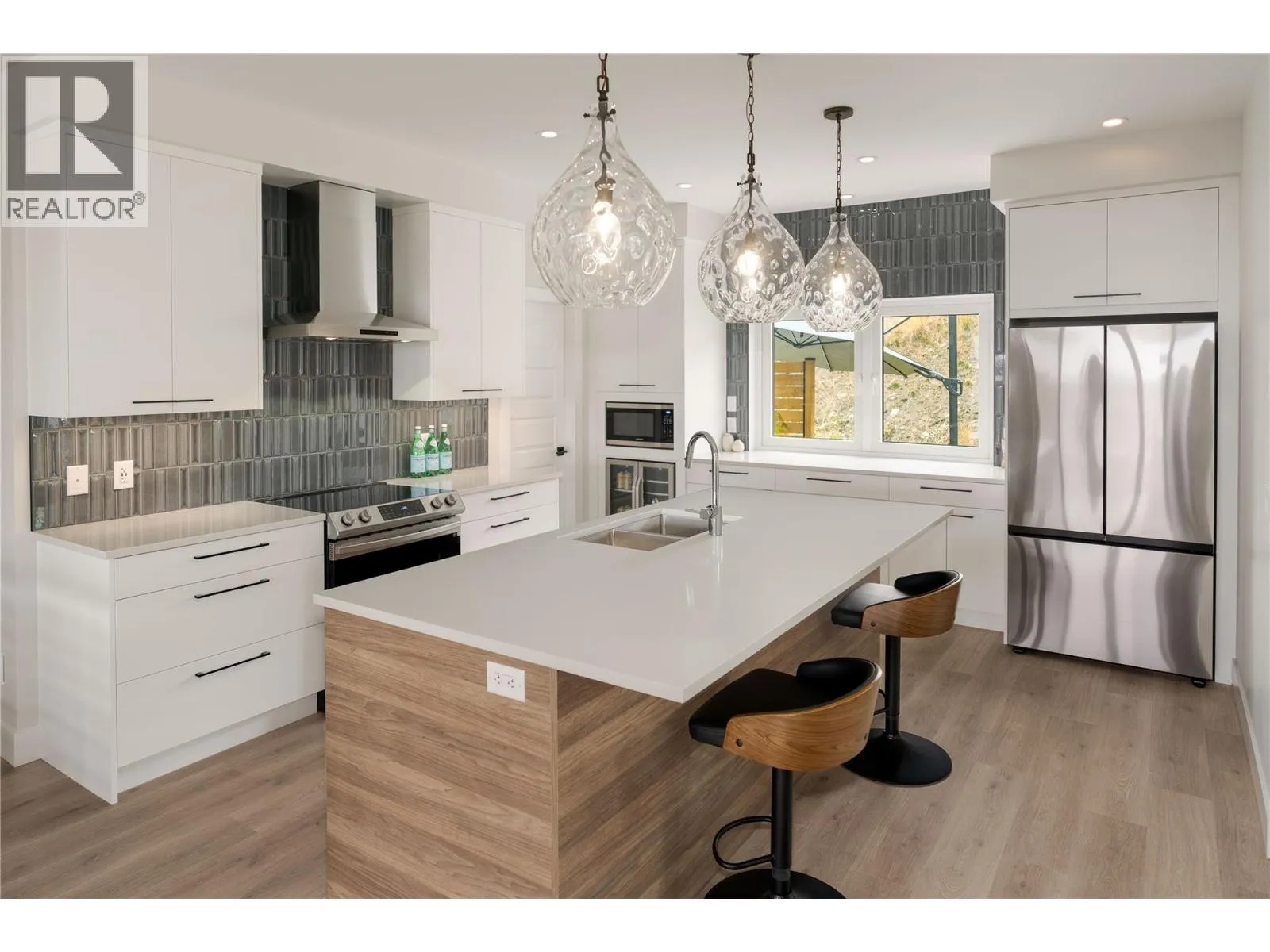 This former Carrington showhome is designed for those who value connection, comfort, and effortless sophistication. Situated in a sought-after family-friendly neighborhood, it offers the perfect balance of privacy, convenience, and Okanagan lifestyle. Just minutes from top schools, shopping, dining, wineries, and the lake, everything your family needs is within easy reach. Crafted with quality and attention to detail, this home reflects the hallmark of Carrington Homesâ exceptional construction. From the striking architectural lines and professional landscaping to the carefully selected interior finishes, every element speaks to thoughtful design and enduring craftsmanship. The kitchen is a true centerpiece, featuring two-tone cabinetry, quartz countertops, a walk-in pantry, and a pass-through window to the outdoor barâthe ultimate space for entertaining. A custom glass wine display anchors the main living area, adding sophistication and style, while the sleek fireplace creates a warm gathering spot as city lights sparkle through expansive windows. The primary suite is a serene retreat, complete with a walk-in closet and spa-inspired ensuite with a fully tiled shower and dual vanities. A second bedroom and full bathroom complete the upper level, while the lower level offers flexible space with a generous family room, office or guest suite, and a tandem three-car garage with abundant storage. Meticulously maintained and elevated beyond standard expectations, this home features curated finishes, designer lighting, and a landscaped backyard large enough for a pool. Near new, perfectly located, and quality built, this residence is where everyday life meets refined Kelowna livingâa place to gather, recharge, and celebrate the best of family life. (id:27476)