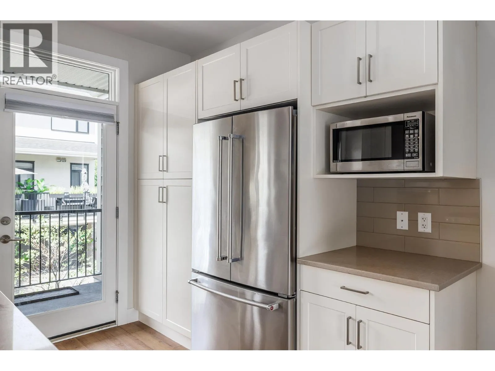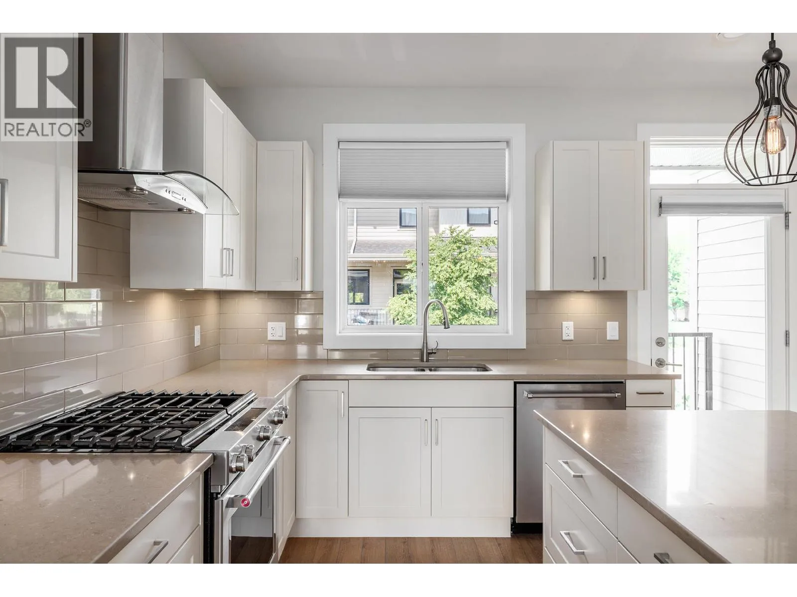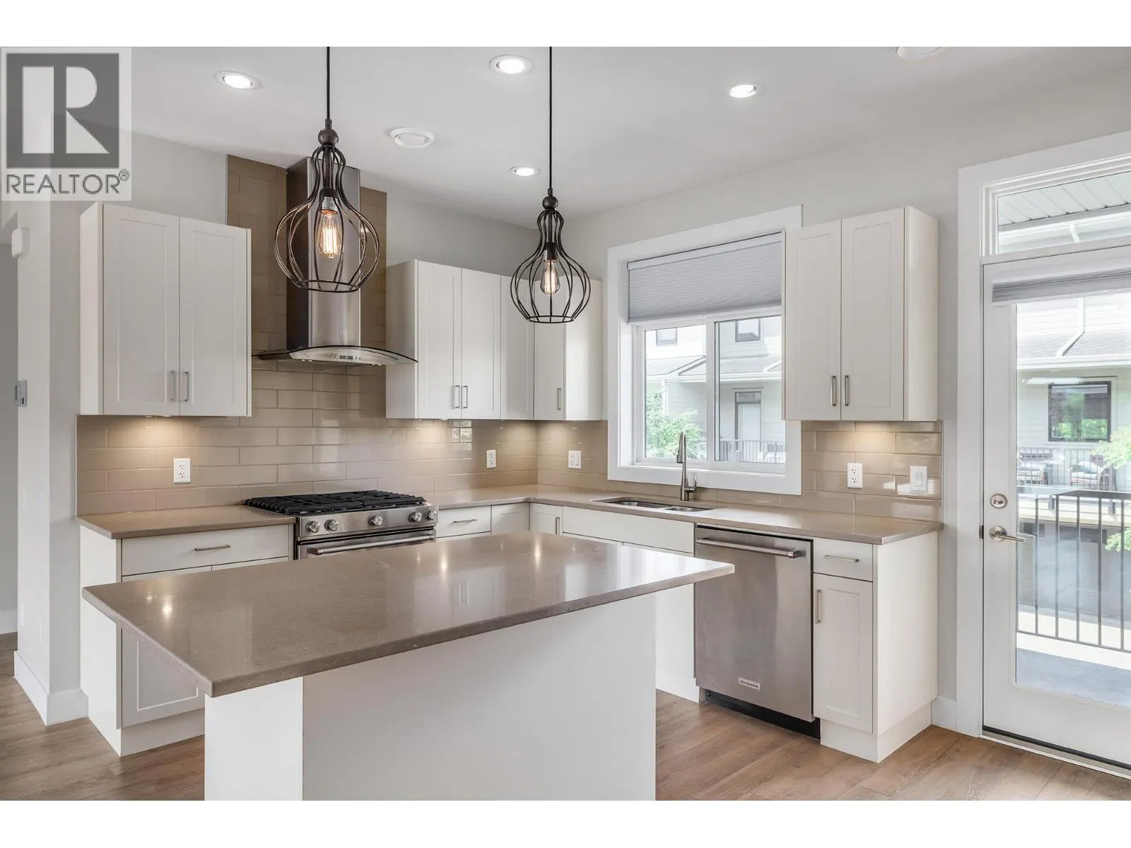 Move in Ready! Modern 3 level townhome offering 4 bedrooms and 4 bathrooms, in Cameron Mews, this sought-after Lower Mission neighbourhood. The lower level features a two-car side by side garage, a spacious foyer, and bedroom with an ensuite, ideal for guests or a home office. The chef-inspired kitchen features sleek quartz countertops, a large island, stainless steel appliances, and a gas range. The open-concept layout features 9' ceilings, large windows and seamlessly connects the kitchen to the living and dining areas, creating the perfect space for entertaining or relaxing. Step outside to the covered patio, complete with a NG BBQ hookup, for outdoor dining. Upstairs, the spacious primary suite offers a private balcony, a 4-piece ensuite, and a generous closet. Two additional bedrooms, a full 4-piece bath, and convenient laundry complete the upper level. Located just across from Guisachan Village Centre, this home offers unbeatable access to shopping, restaurants, cafes, great schools, H2O fitness Centre and the shores of Okanagan Lake. With its modern design and prime location, this townhome is a rare opportunity. THIS ONE IS AVAILABLE AND EASY TO SHOW! (id:27476)