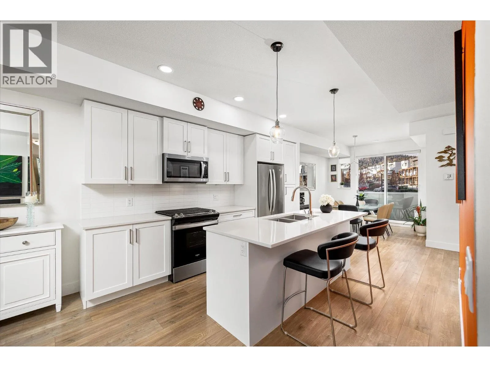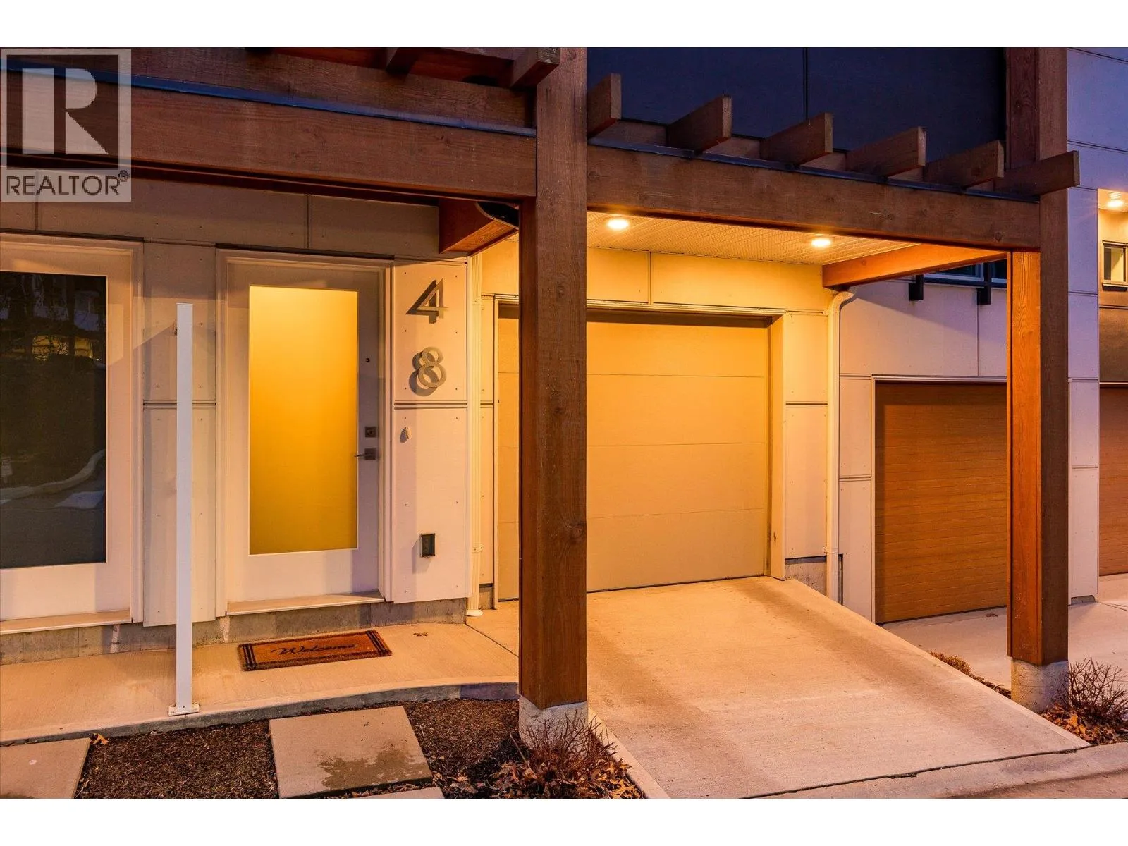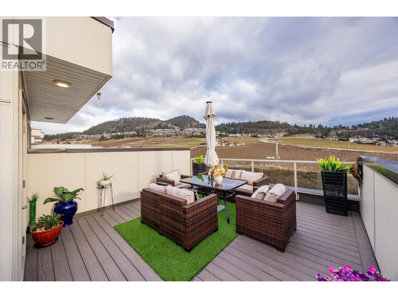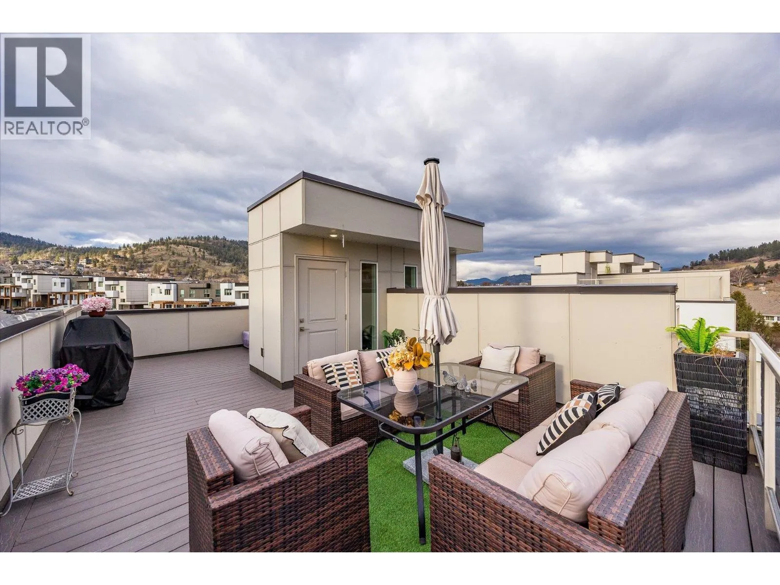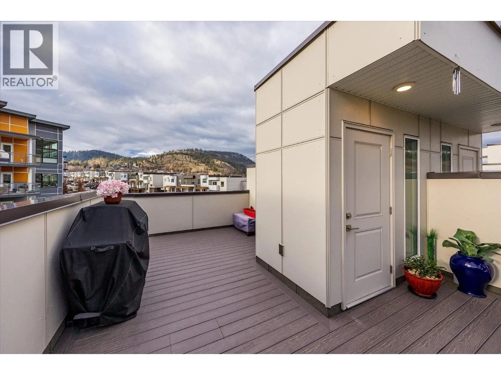 Welcome to Trellis! Located in one of Kelownaâs most sought-after family neighbourhoods, Trellis offers rich, modern design and exceptional functionality. Unit 48 enjoys a premium position on the quieter Valley Road side of the complex, providing added privacy and tranquility, and an acoustically engineered party wall ensures added peace and quiet between units. The walkout entry level offers a 40-foot tandem garage with storage options, ideal for vehicles, bikes, and all your Okanagan lifestyle gear. The main living level showcases a beautifully appointed kitchen flowing seamlessly into the dining and living areas, with a convenient powder room for guests, perfect for entertaining or everyday comfort. Thoughtfully finished throughout, this home features a stainless steel Whirlpool appliance package with gas stove, quartz countertops, ceramic tile backsplash, expansive windows, and 9-foot ceilings that create a bright, airy atmosphere. Upstairs, the second level hosts the primary suite complete with walk-in closet and a stunning ensuite. Two additional bedrooms, a full bathroom, and laundry are also located on this level, offering ideal family functionality. The top floor is the showstopper, with a private rooftop patio with BBQ area and sweeping valley views, creating the perfect outdoor retreat. Glenmore continues to be highly desirable thanks to its close proximity to downtown Kelowna, grocery shopping, restaurants, hiking trails, and multiple schools. This townhome offers pristine quality, thoughtful design, and exceptional value in an unbeatable location. Pet-friendly (with restrictions). (id:27476)
