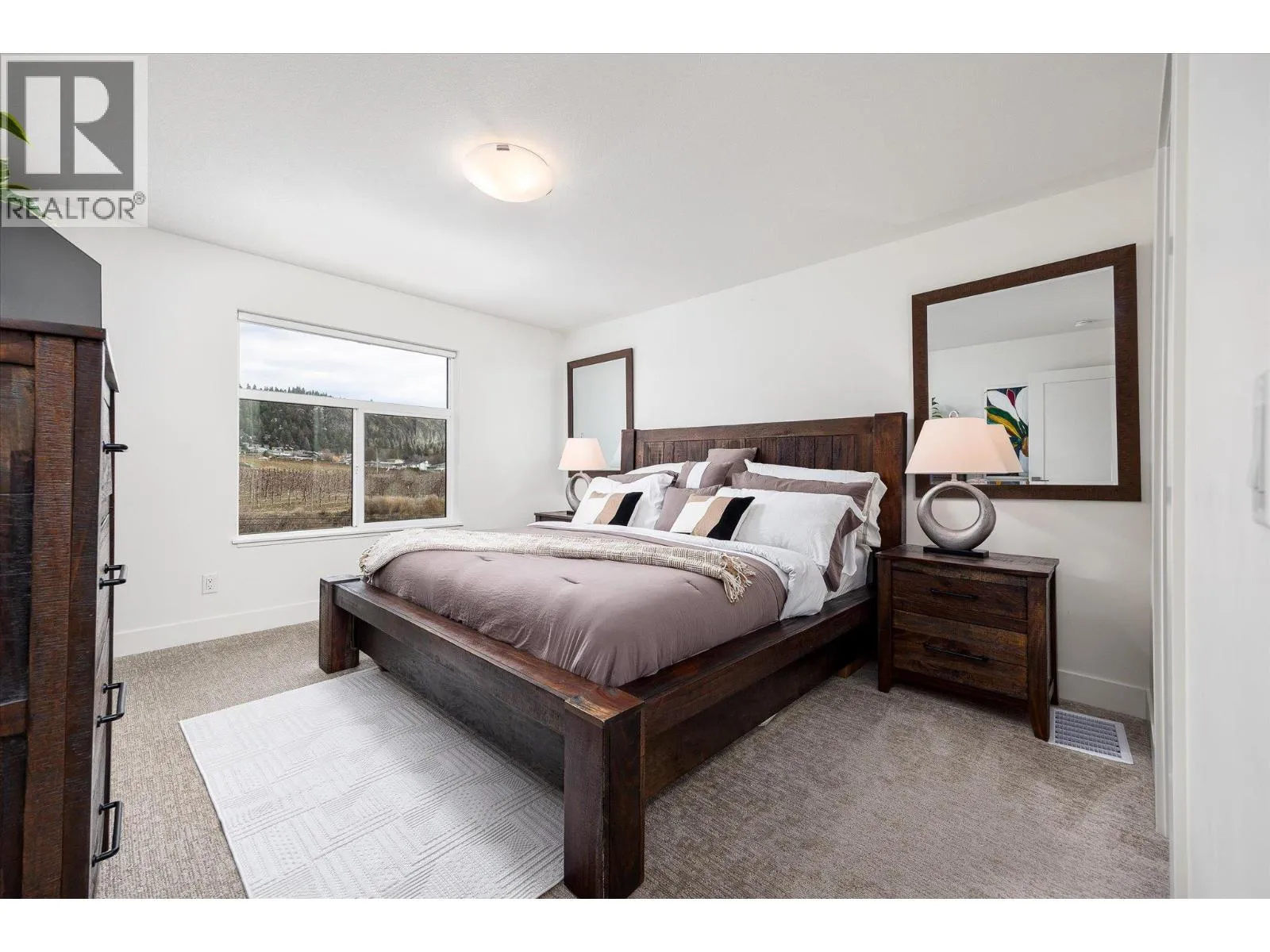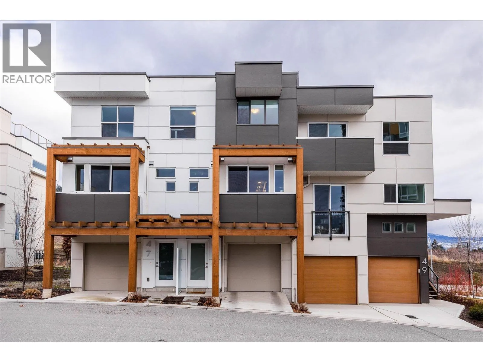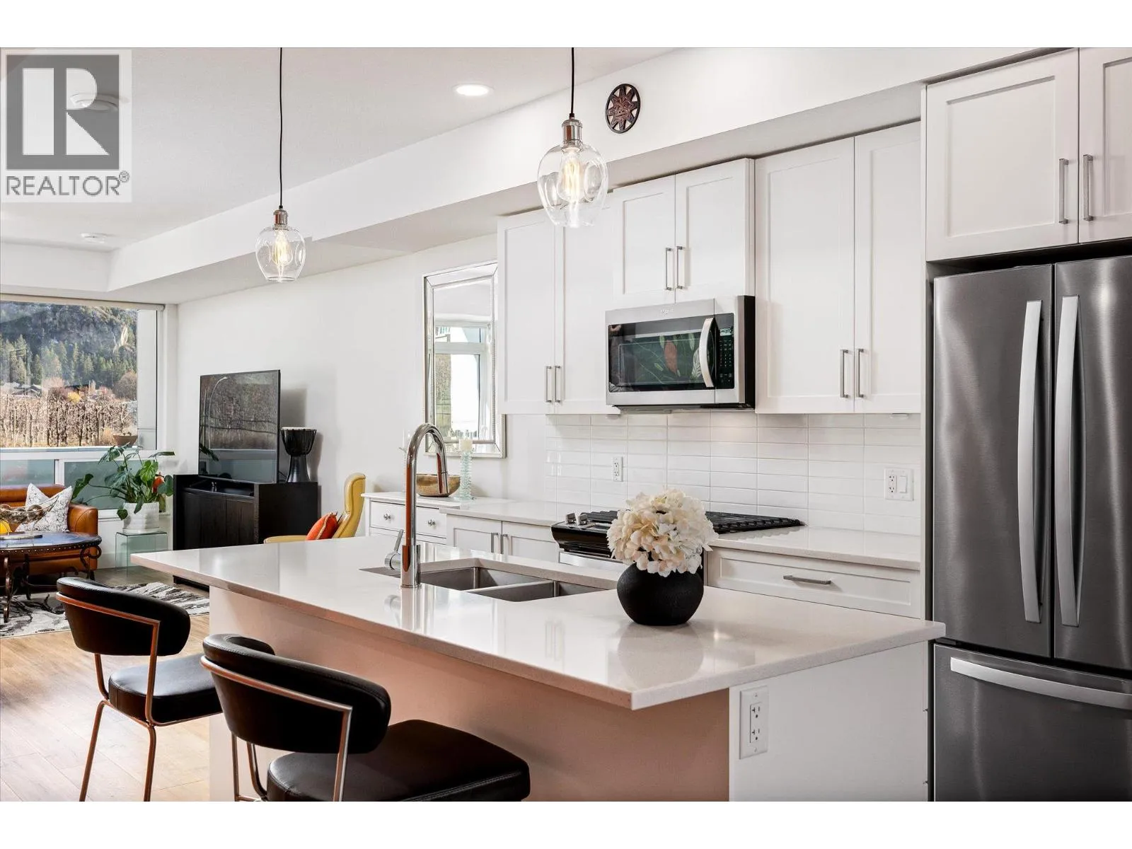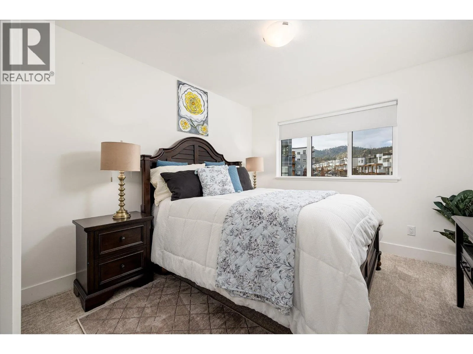 Welcome to Trellis! Located in one of Kelownaâs most sought-after family neighbourhoods, Trellis offers rich, modern design and exceptional functionality. Unit 48 enjoys a premium position on the quieter Valley Road side of the complex, providing added privacy and tranquility, and an acoustically engineered party wall ensures added peace and quiet between units. The walkout entry level offers a 40-foot tandem garage with storage options, ideal for vehicles, bikes, and all your Okanagan lifestyle gear. The main living level showcases a beautifully appointed kitchen flowing seamlessly into the dining and living areas, with a convenient powder room for guests, perfect for entertaining or everyday comfort. Thoughtfully finished throughout, this home features a stainless steel Whirlpool appliance package with gas stove, quartz countertops, ceramic tile backsplash, expansive windows, and 9-foot ceilings that create a bright, airy atmosphere. Upstairs, the second level hosts the primary suite complete with walk-in closet and a stunning ensuite. Two additional bedrooms, a full bathroom, and laundry are also located on this level, offering ideal family functionality. The top floor is the showstopper, with a private rooftop patio with BBQ area and sweeping valley views, creating the perfect outdoor retreat. Glenmore continues to be highly desirable thanks to its close proximity to downtown Kelowna, grocery shopping, restaurants, hiking trails, and multiple schools. This townhome offers pristine quality, thoughtful design, and exceptional value in an unbeatable location. Pet-friendly (with restrictions). (id:27476)
