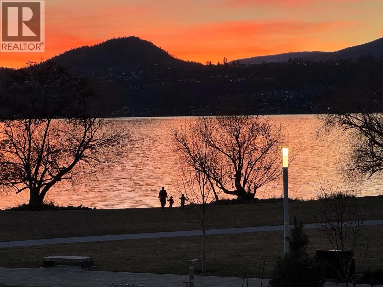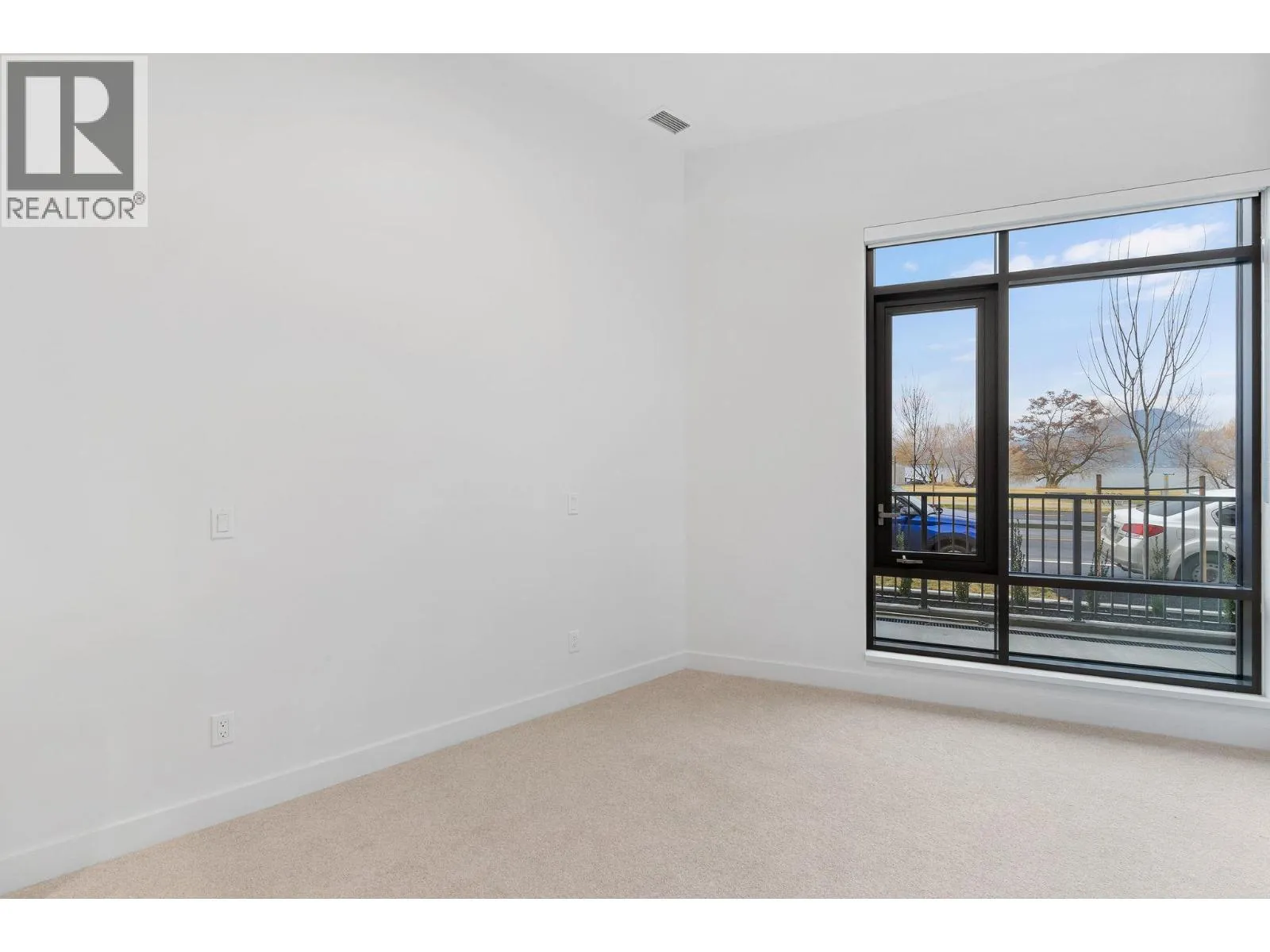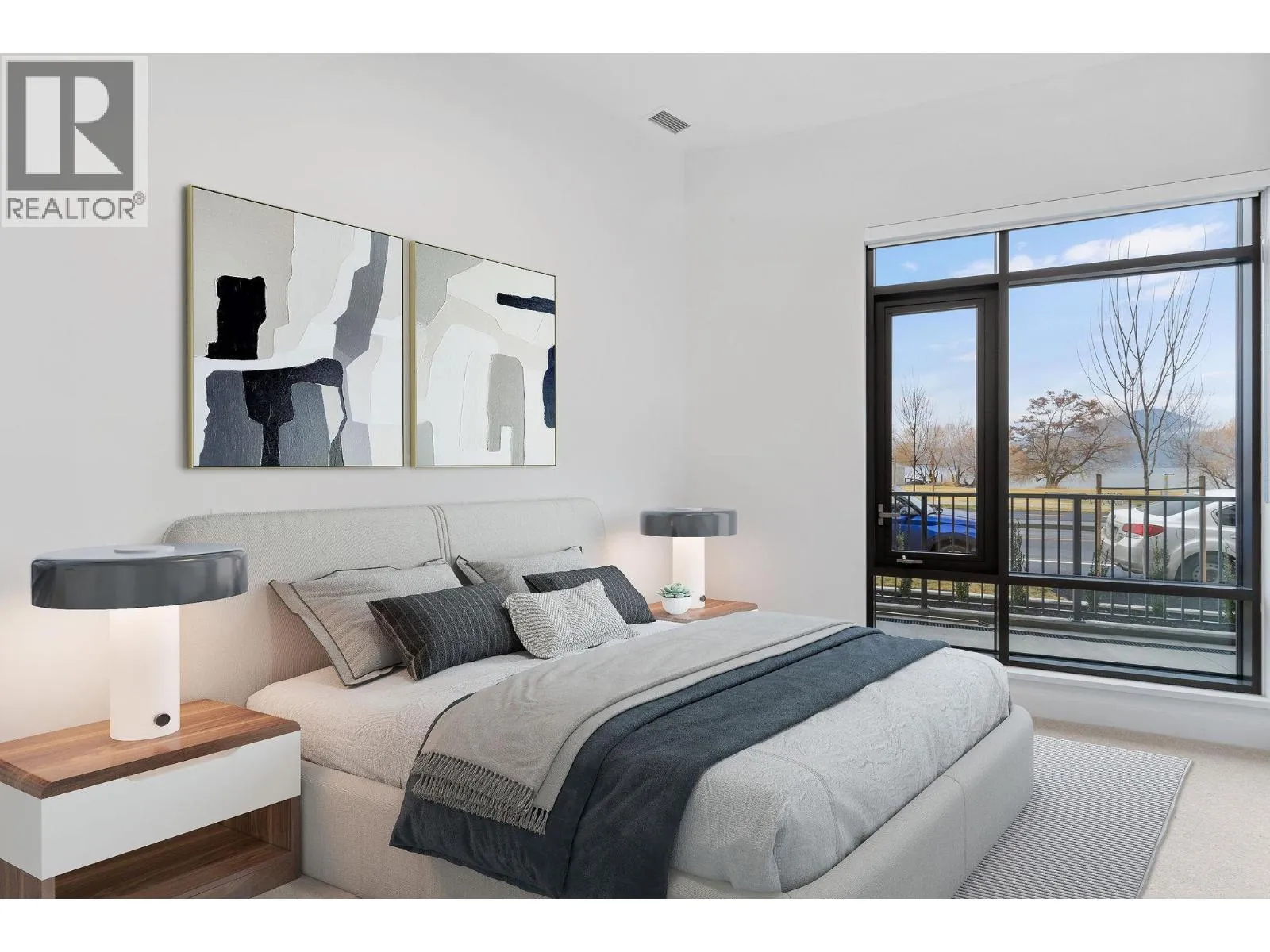 This ground-level townhome offers 2 bedrooms + den, 2 bathrooms, and impressive 11-foot ceilings that create a bright, airy feel throughout. The thoughtfully designed layout features an open-concept living space, modern kitchen with premium finishes, and expansive windows showcasing beautiful west-facing lake views. Enjoy seamless indoor-outdoor living with direct walk-out access from your front door to Abbott Street and the waterfront beyond â perfect for morning strolls and evening sunsets. The spacious primary suite includes a spa-inspired ensuite, while the second bedroom and versatile den which provides flexibility. Residents can enjoy amenities incl. an 8,000 sq ft lakeview terrace w/firepits, BBQs, and community gardens as well as a fully equipped fitness center, dog wash, & bike maintenance station. With a walk score of 93, youâre steps from transit, KGH, shops & restaurants of vibrant Pandosy Village, and beautiful Okanagan Lake. sq ft and room sizes are approximate and may vary. Photos may be of a similar home and layout and virtually staged. This home is newly constructed and move-in ready. (id:27476)