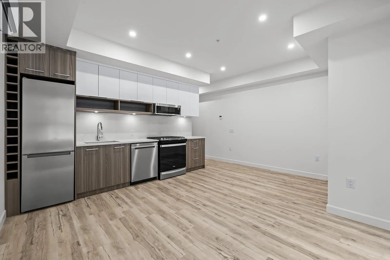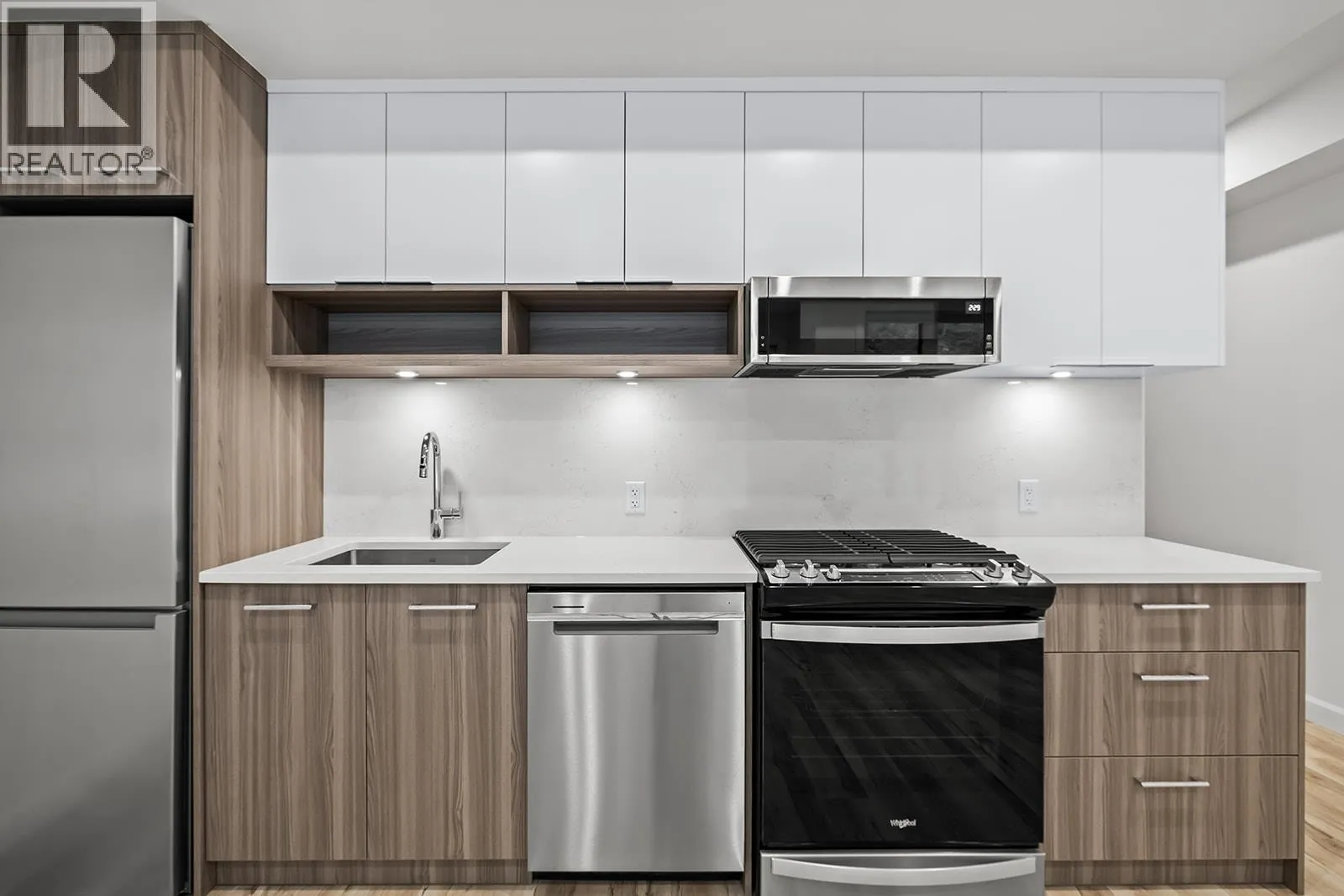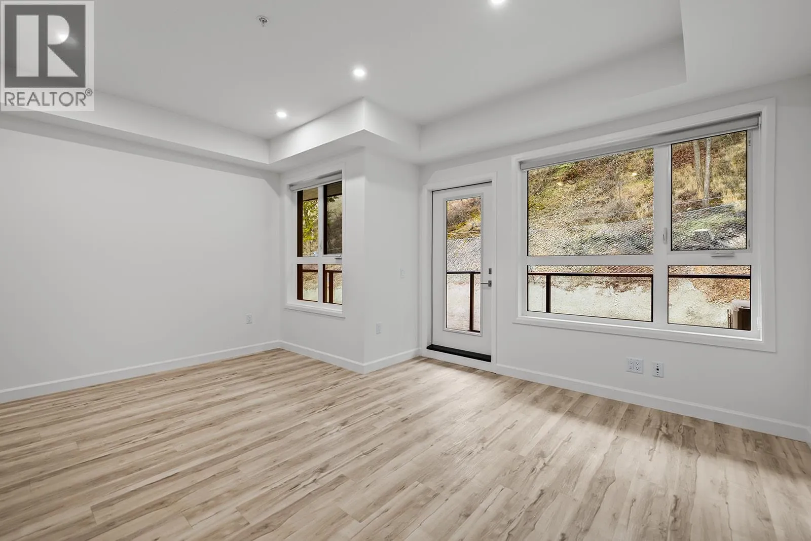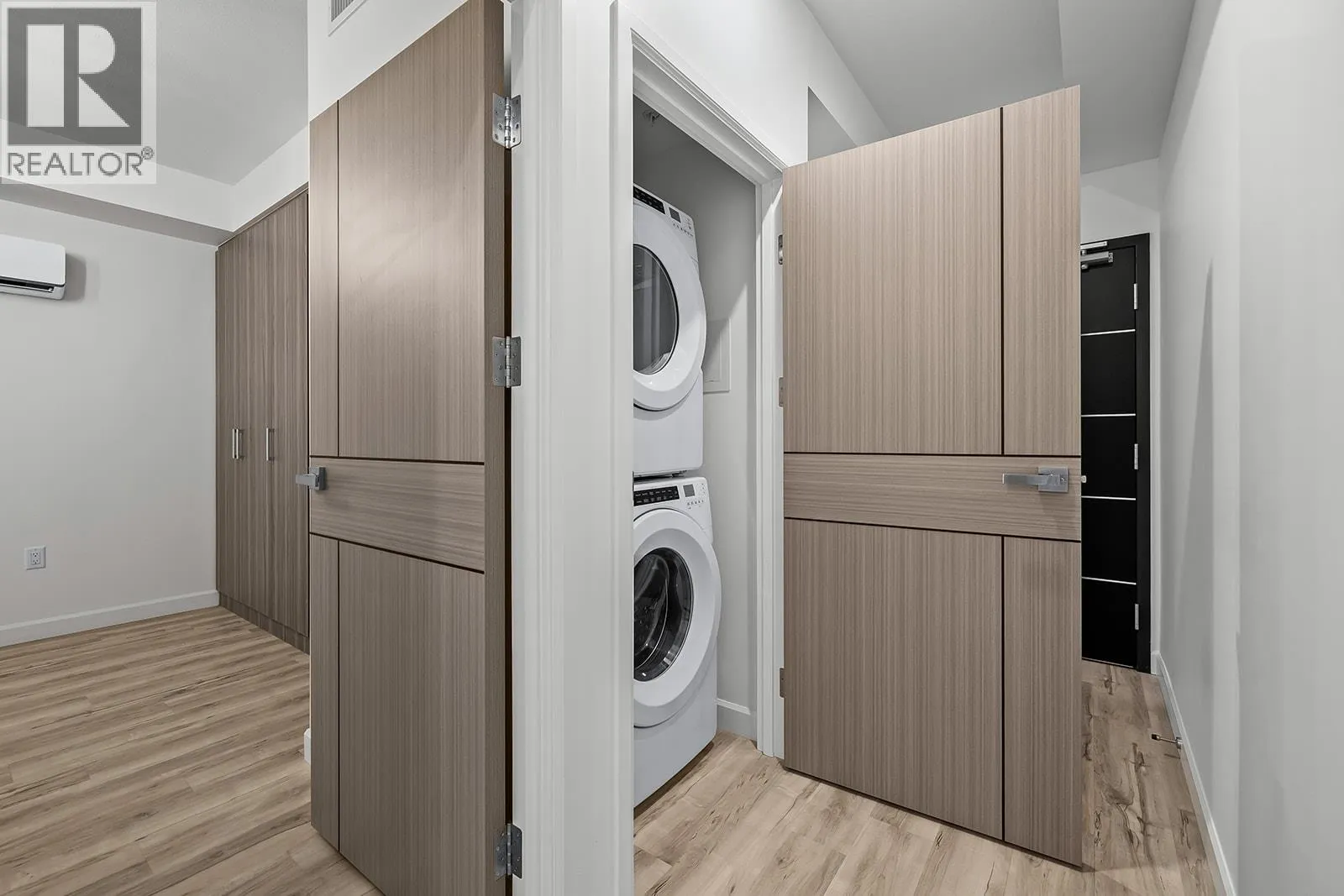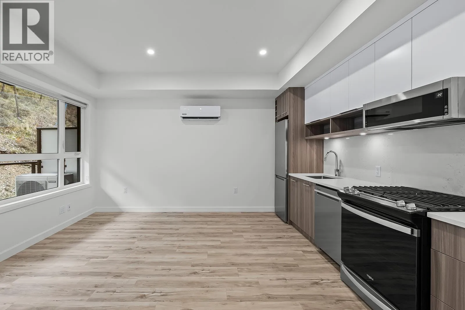 Brand New. Move-In Ready. And anything but ordinary. Welcome to Eminence at Knox Mountain. This 1-bed, 1-bath home offers approx. 554 sqft of smart, sophisticated living designed for people who appreciate clean lines & thoughtful details. Inside, 9-ft ceilings & expansive windows create a bright, open feel. The interior blends warm wood tones, striking black accents & sand glass balcony features. The kitchen is a standout with premium 2-tone cabinetry, quartz countertops, stainless steel appliances, a gas range & a unique wine storage feature. An in-suite laundry adds convenience, a nook provides a place for your desk, while designer LED lighting, a statement entry door, solid-core interior doors & custom shelving & closet solutions complete the polished finish. Youâll also enjoy underground parking with your own private bike cage. The buildingâs rooftop viewing terrace gives all new meaning to Kelownaâs Patio Season. Pet-friendly & Nature at your doorstep with direct access to Knox Mountainâs hiking & biking trails. Downtown Kelowna & Glenmore are minutes away. Buy new & save. Eligible buyers may qualify for the Property Transfer Tax exemption & the upcoming 1st time home buyer GST exemption & remaining homes include up to $100k in built-in savings from original pricing. If you want a designer condo youâll genuinely love coming home to, this one checks all the boxes. Move-In Ready 1-Bed to 2-Bed + Den homes available. Sales Centre open Saturday 12-4pm or by appointment. (id:27476)