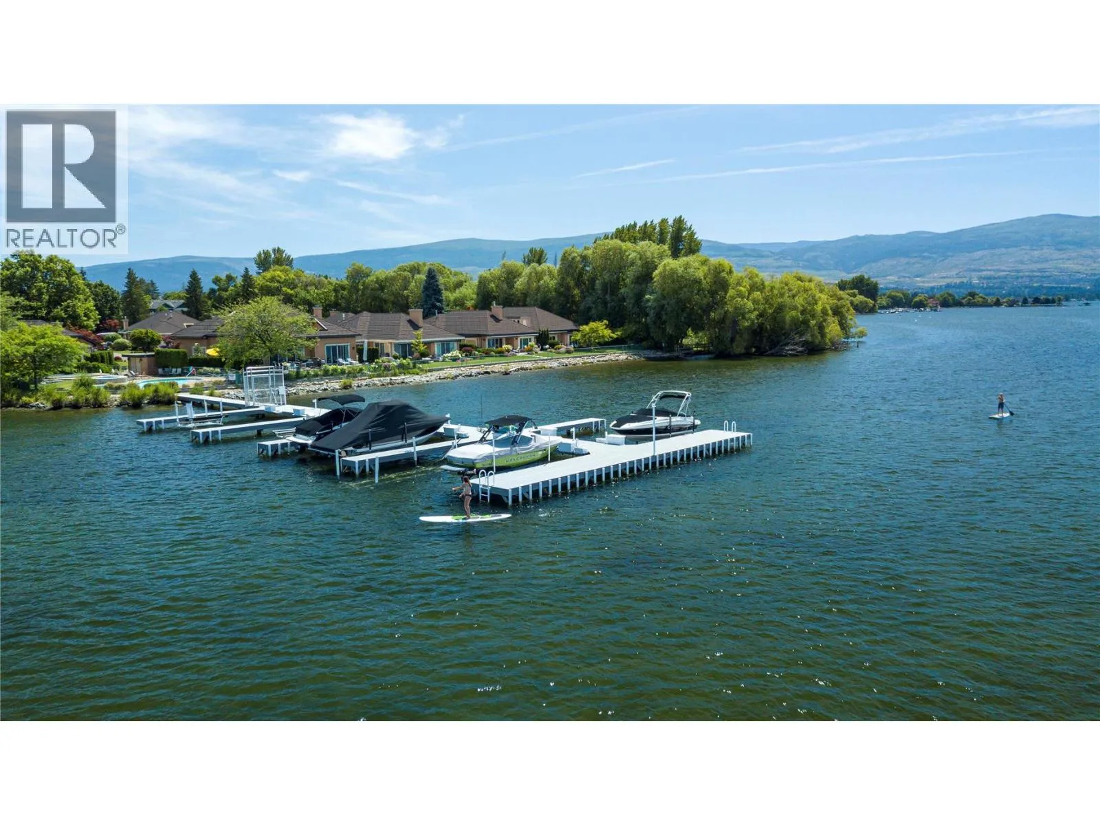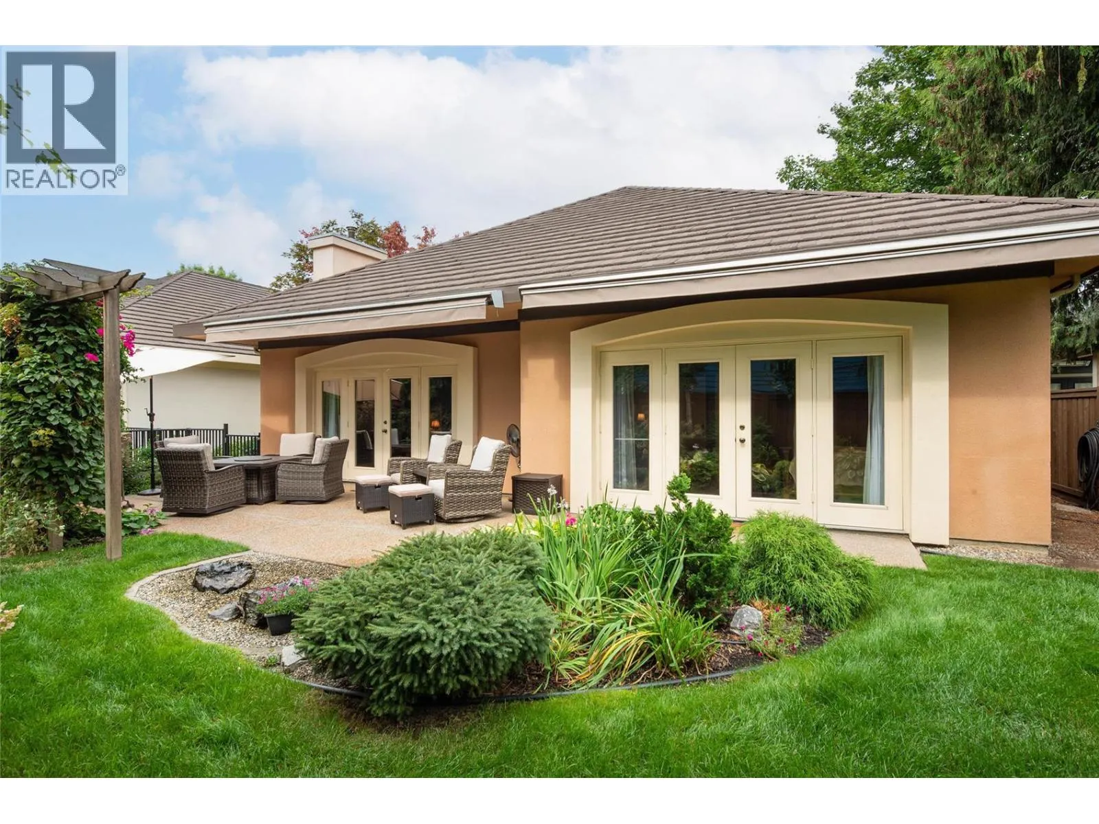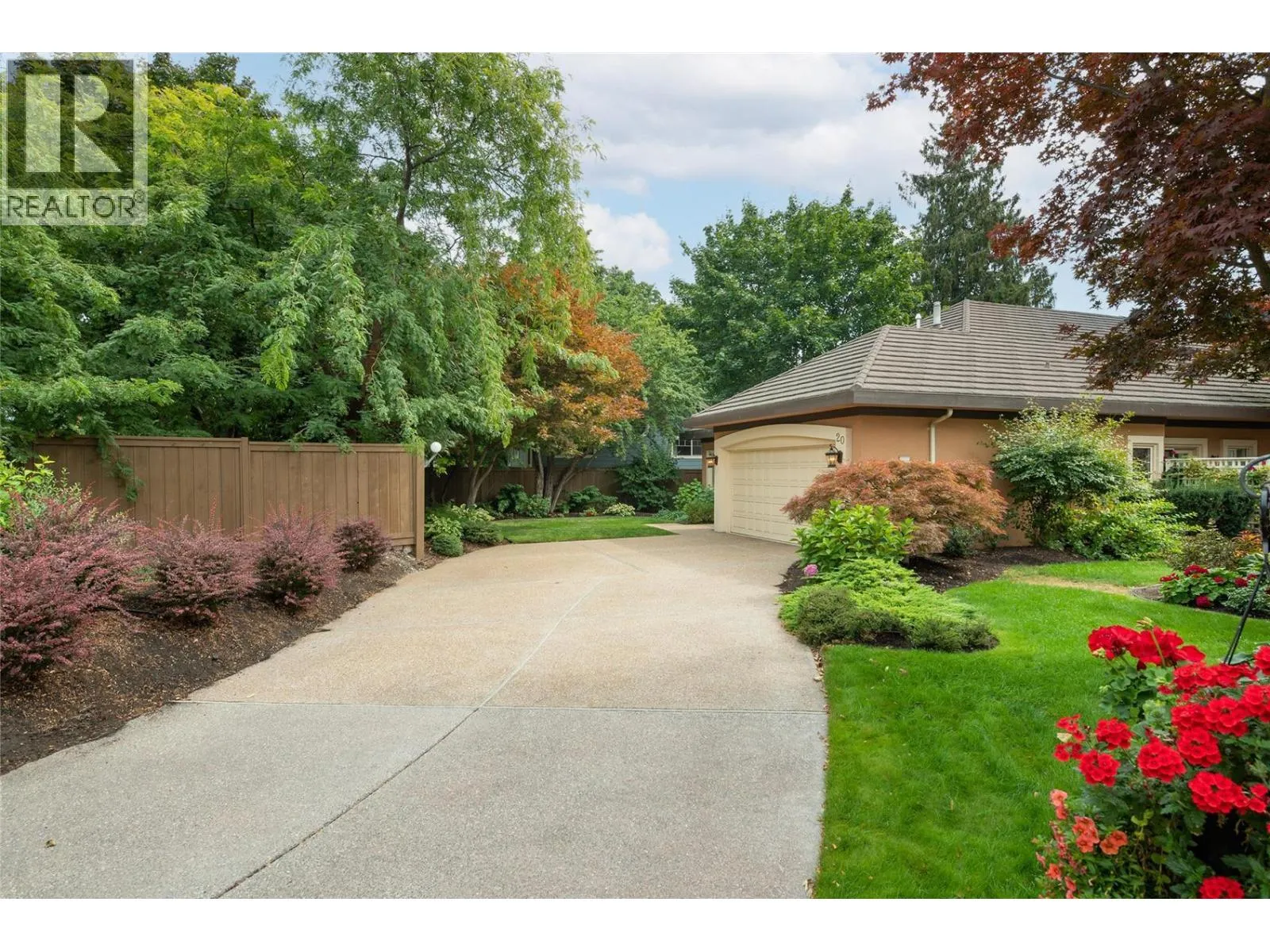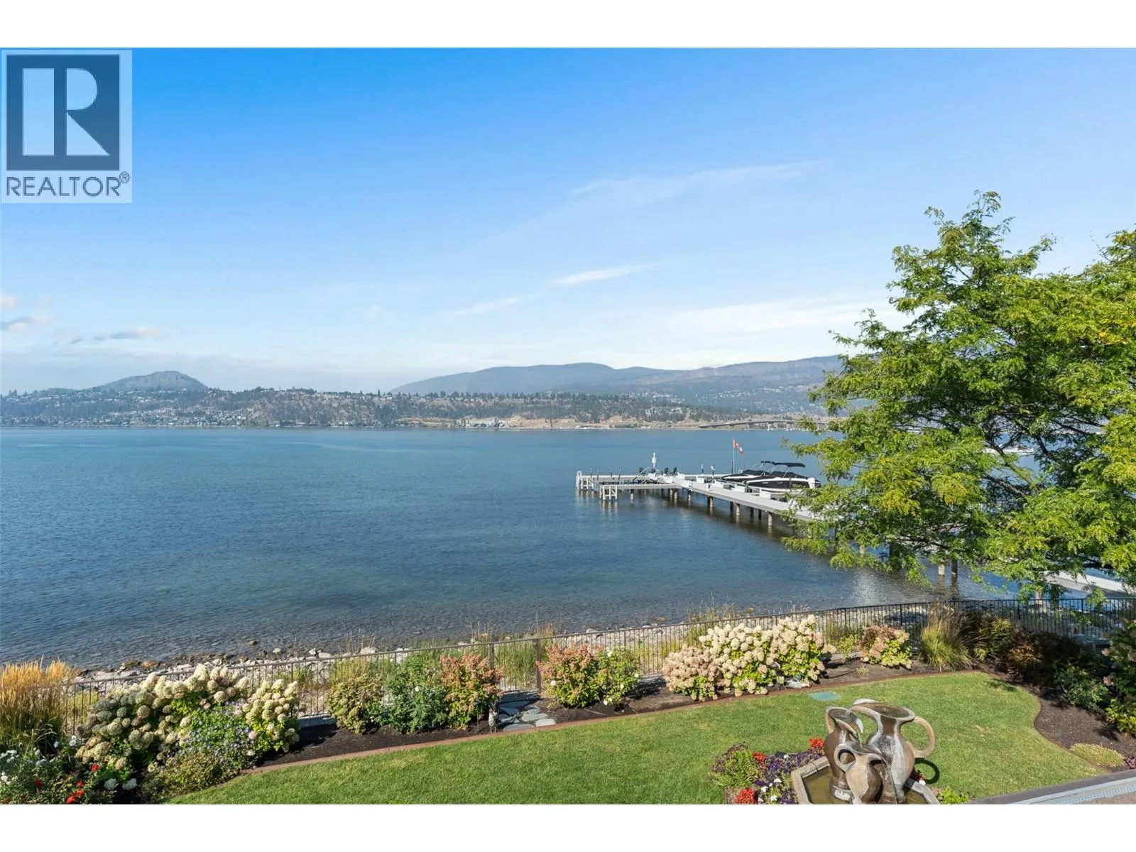 Luxurious One-Level Home in Gated Waterfront Community. Discover the perfect blend of comfort and convenience in this stunning one-level home located in an exclusive gated community. This residence offers easy access to the lake with your own private boat slip and lift. Enjoy tranquil living with waterfront pool beautifully landscaped surroundings. Residents of Le Chateau can also enjoy resort-style amenities on site including an outdoor pool, hot tub & private dock. Upon entry you're greeted by high ceilings, and rich cherry hardwood floors leading to the kitchen and the main living area. The chefâs kitchen features brand-new stainless-steel appliances. Centre island offers a gas range. Off the kitchen is an open, main living area with custom built-ins surrounding the gas fireplace. The primary suite is a gorgeous sanctuary with private access to the backyard and a recently renovated primary ensuite. The ensuite is finished with wood cabinetry, & granite counters for a luxurious feel. Enjoy unwinding in the soaker tub or expansive glass steam shower with a bench and speakers. One additional bedroom and den. In the backyard youâre surrounded by mature landscaping and a trellis bordering the patio. A water feature & outdoor lighting have been added. The two-car garage has been finished with epoxy flooring, and custom cabinetry. Incredible location within walking distance to beaches, cafes, restaurants and boutiques, and only a 5 minute drive to downtown Kelowna. (id:27476)