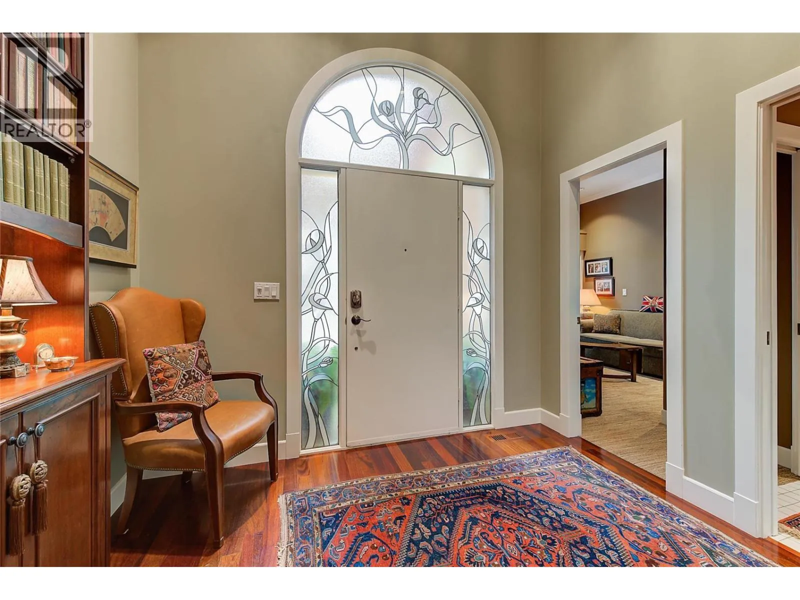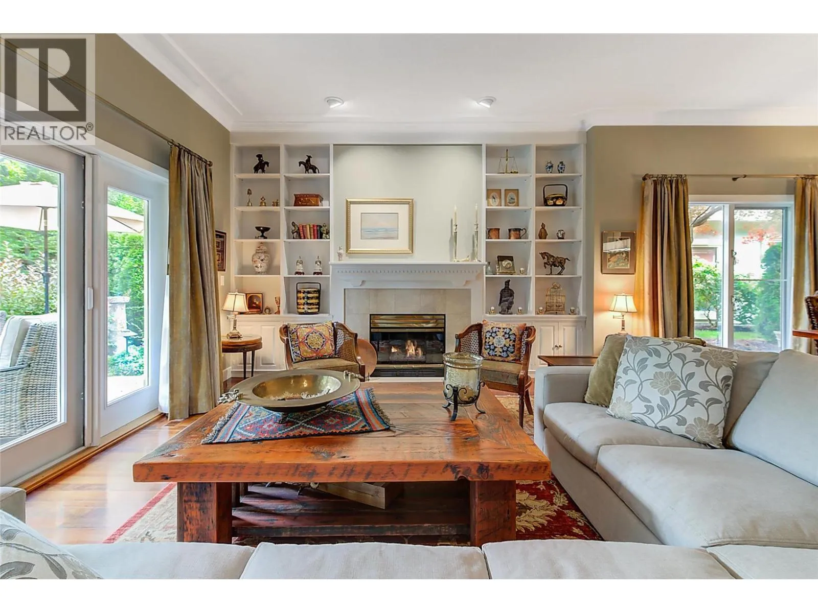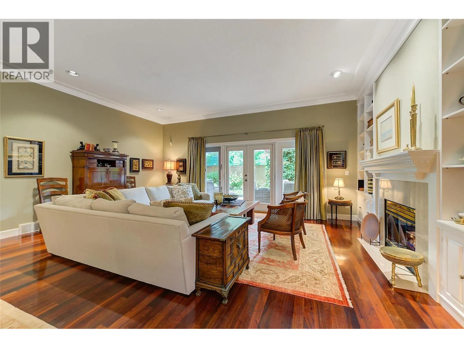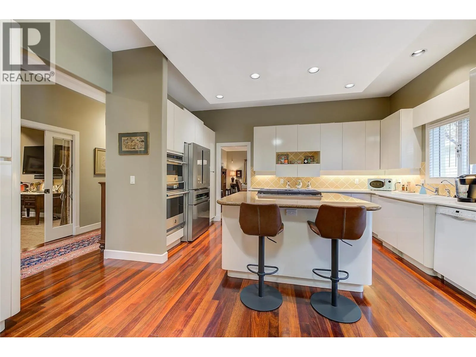 Luxurious One-Level Home in Gated Waterfront Community. Discover the perfect blend of comfort and convenience in this stunning one-level home located in an exclusive gated community. This residence offers easy access to the lake with your own private boat slip and lift. Enjoy tranquil living with waterfront pool beautifully landscaped surroundings. Residents of Le Chateau can also enjoy resort-style amenities on site including an outdoor pool, hot tub & private dock. Upon entry you're greeted by high ceilings, and rich cherry hardwood floors leading to the kitchen and the main living area. The chefâs kitchen features brand-new stainless-steel appliances. Centre island offers a gas range. Off the kitchen is an open, main living area with custom built-ins surrounding the gas fireplace. The primary suite is a gorgeous sanctuary with private access to the backyard and a recently renovated primary ensuite. The ensuite is finished with wood cabinetry, & granite counters for a luxurious feel. Enjoy unwinding in the soaker tub or expansive glass steam shower with a bench and speakers. One additional bedroom and den. In the backyard youâre surrounded by mature landscaping and a trellis bordering the patio. A water feature & outdoor lighting have been added. The two-car garage has been finished with epoxy flooring, and custom cabinetry. Incredible location within walking distance to beaches, cafes, restaurants and boutiques, and only a 5 minute drive to downtown Kelowna. (id:27476)