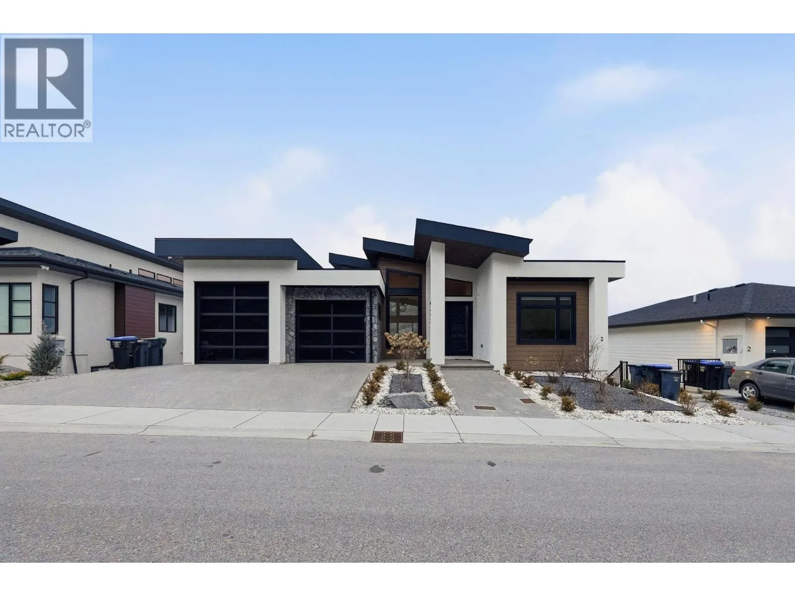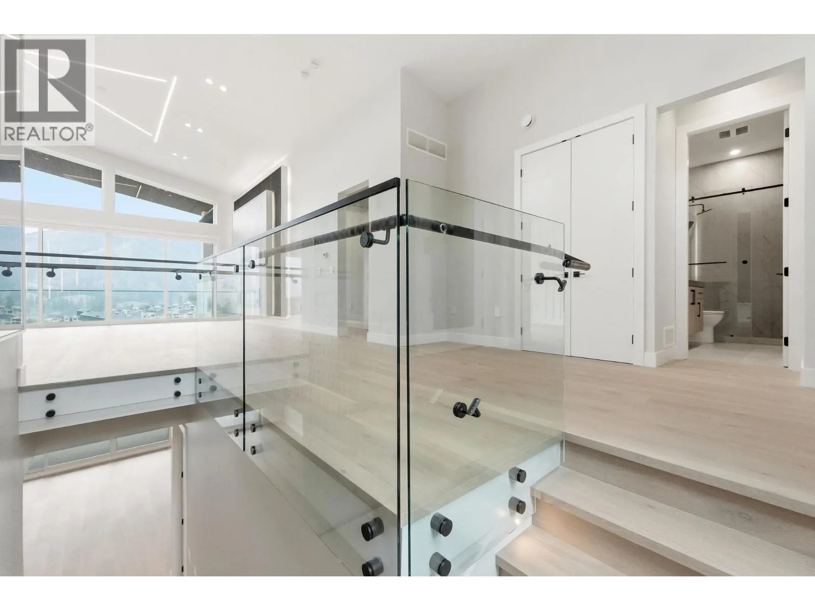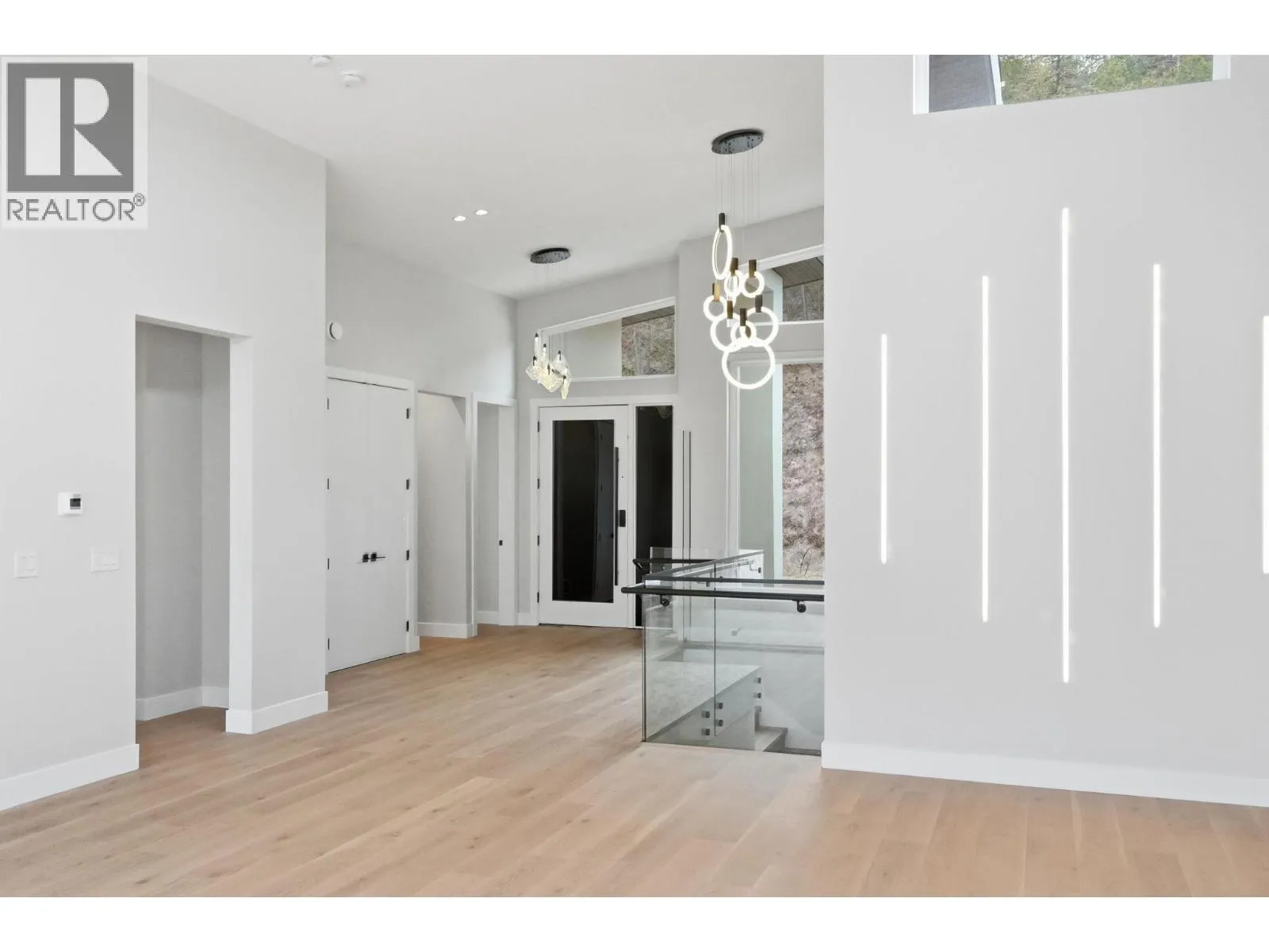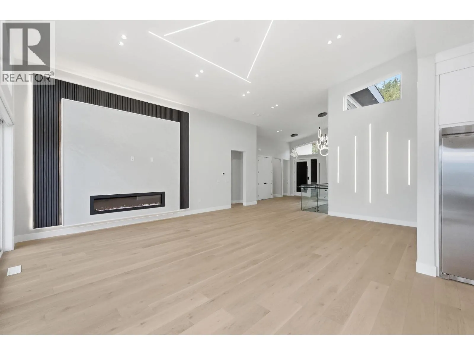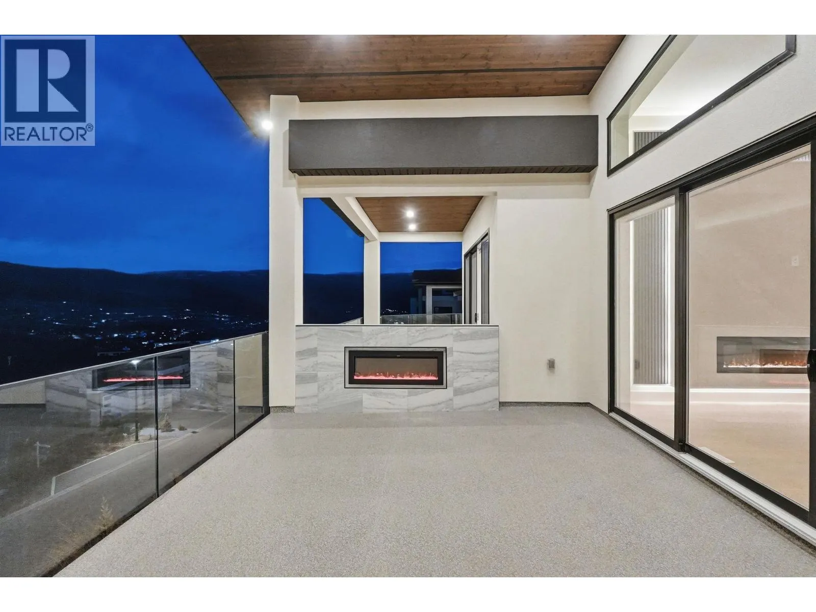 Perched on the hillside in desirable Black Mountain, this exceptional 6-bedroom, 4-bathroom residence offers stunning valley views, thoughtful design, and modern luxury throughout. Expansive windows flood the home with natural light, complemented by elegant lighting selections that allow you to set the perfect atmosphere day or night. The main living area features engineered hardwood flooring and a beautifully designed chefâs kitchen equipped with premium Electrolux appliances, a gas range, and an oversized chefâs refrigerator. A fully equipped spice kitchen provides additional space for cooking and entertaining while keeping the main kitchen pristine. Upon entry, a striking custom glass display above the staircase, crafted with a single joint, creates a dramatic focal point and enhances the homeâs open feel. The layout flows seamlessly from the kitchen and living area onto a balcony with its own fireplace which is perfect for enjoying Okanagan evenings. Downstairs offers a spacious second living area, two additional bedrooms, and an impressive 23 ft x 23â6â theatre room complete with a built-in bar. The property also includes a private 2-bedroom suite currently rented for $2,000 per month, positioned along the side of the home to maximize privacy. Additional features include a double garage with epoxy flooring, irrigated landscaping, a generous backyard, and the added benefit of GST being paid by the seller. (id:27476)