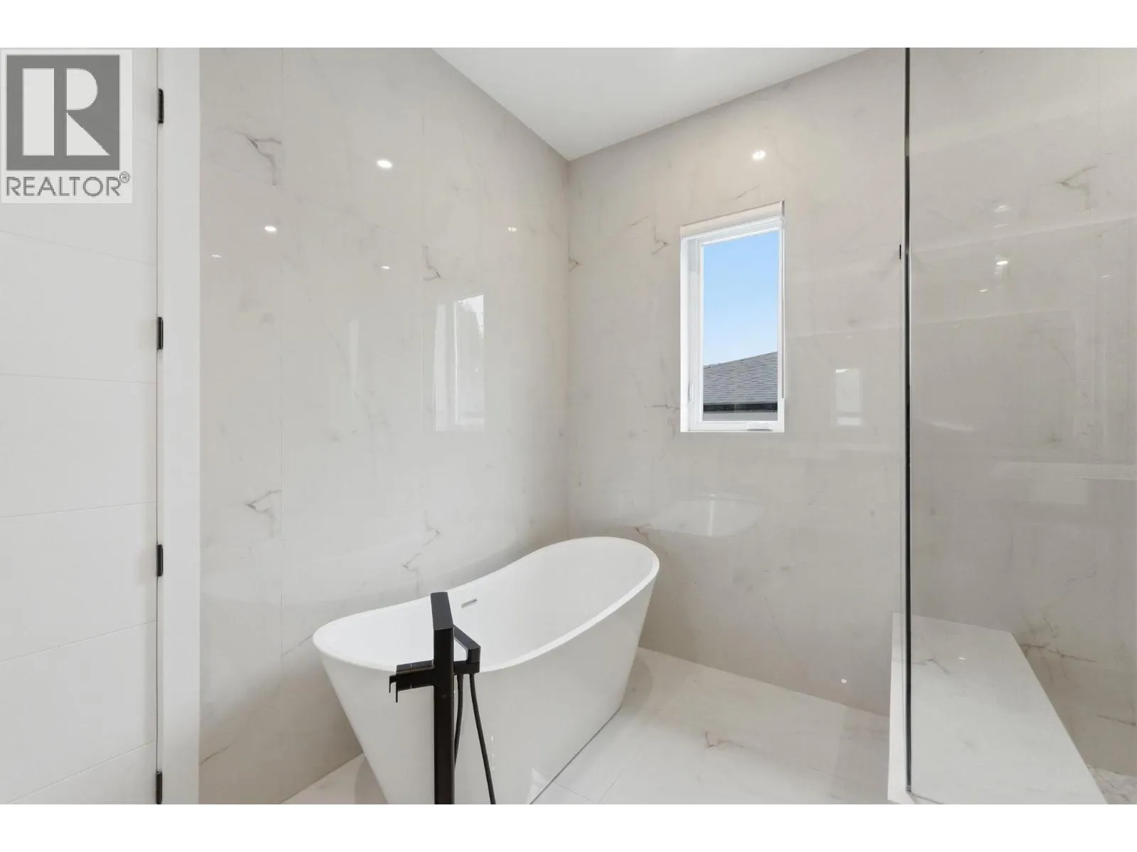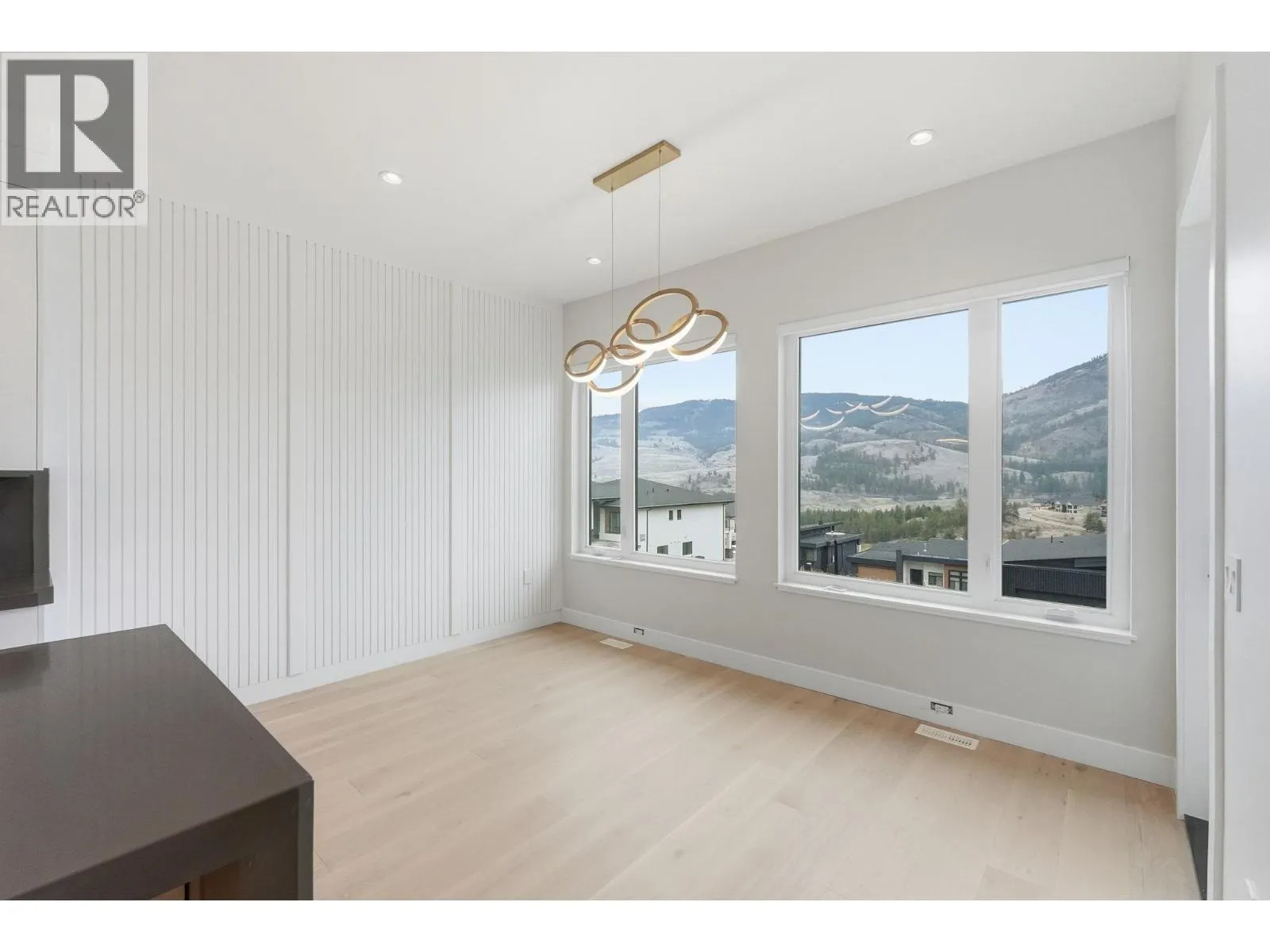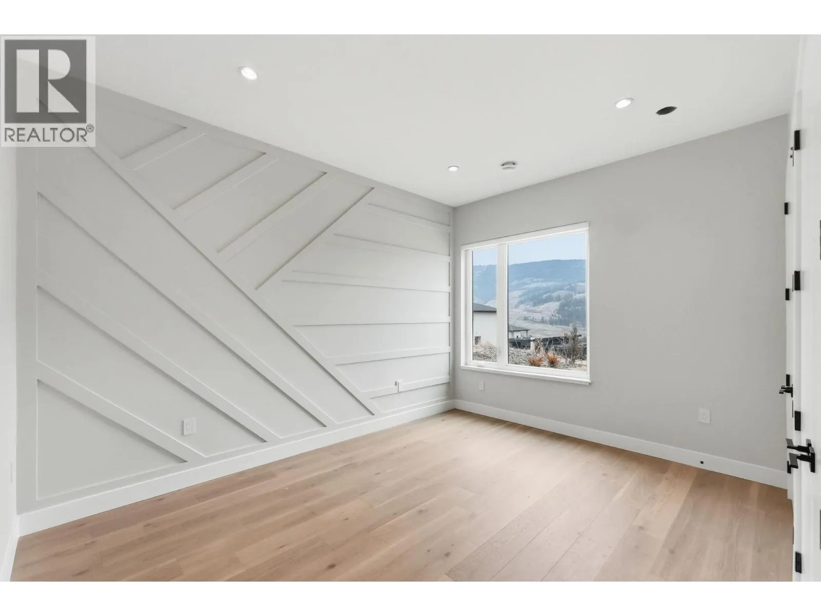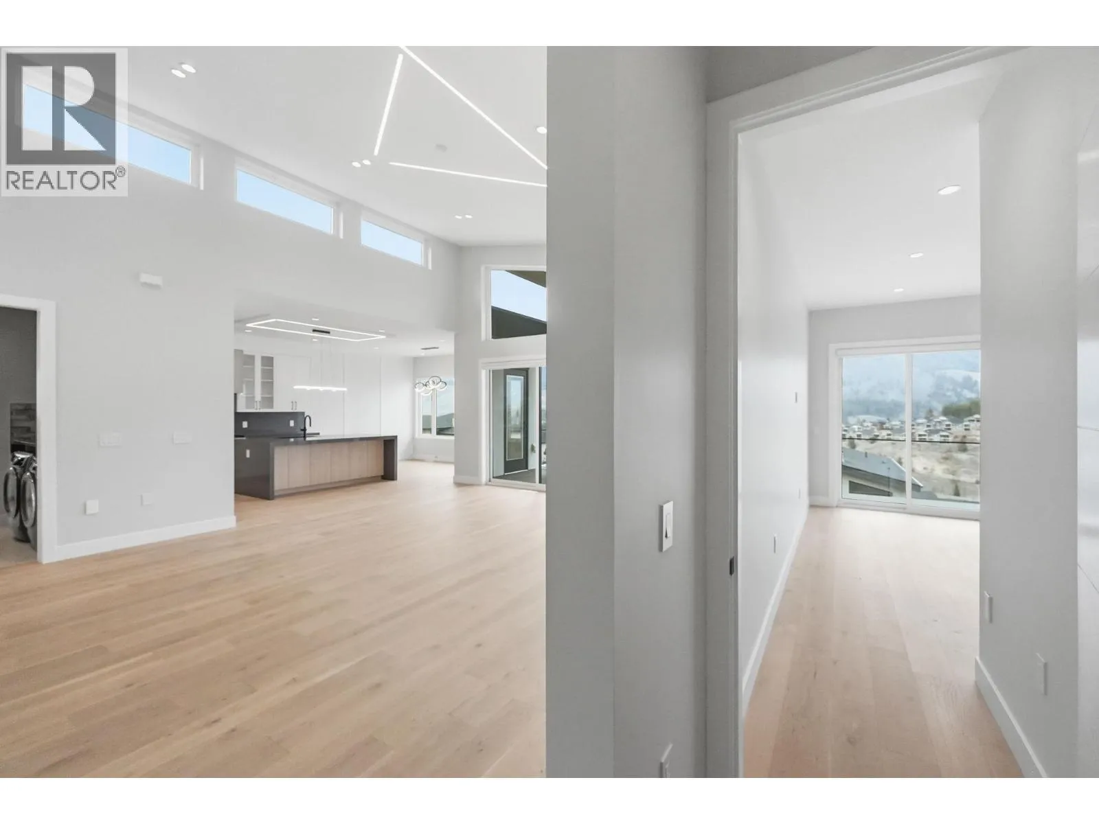Perched on the hillside in desirable Black Mountain, this exceptional 6-bedroom, 4-bathroom residence offers stunning valley views, thoughtful design, and modern luxury throughout. Expansive windows flood the home with natural light, complemented by elegant lighting selections that allow you to set the perfect atmosphere day or night. The main living area features engineered hardwood flooring and a beautifully designed chefâs kitchen equipped with premium Electrolux appliances, a gas range, and an oversized chefâs refrigerator. A fully equipped spice kitchen provides additional space for cooking and entertaining while keeping the main kitchen pristine. Upon entry, a striking custom glass display above the staircase, crafted with a single joint, creates a dramatic focal point and enhances the homeâs open feel. The layout flows seamlessly from the kitchen and living area onto a balcony with its own fireplace which is perfect for enjoying Okanagan evenings. Downstairs offers a spacious second living area, two additional bedrooms, and an impressive 23 ft x 23â6â theatre room complete with a built-in bar. The property also includes a private 2-bedroom suite currently rented for $2,000 per month, positioned along the side of the home to maximize privacy. Additional features include a double garage with epoxy flooring, irrigated landscaping, a generous backyard, and the added benefit of GST being paid by the seller. (id:27476)